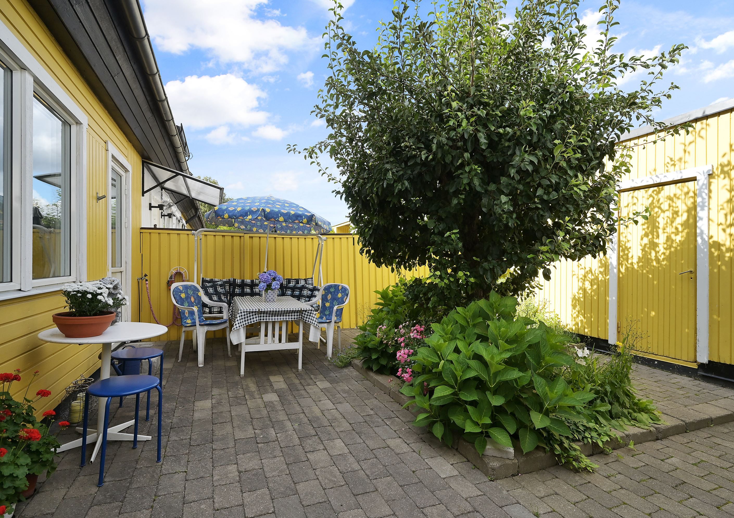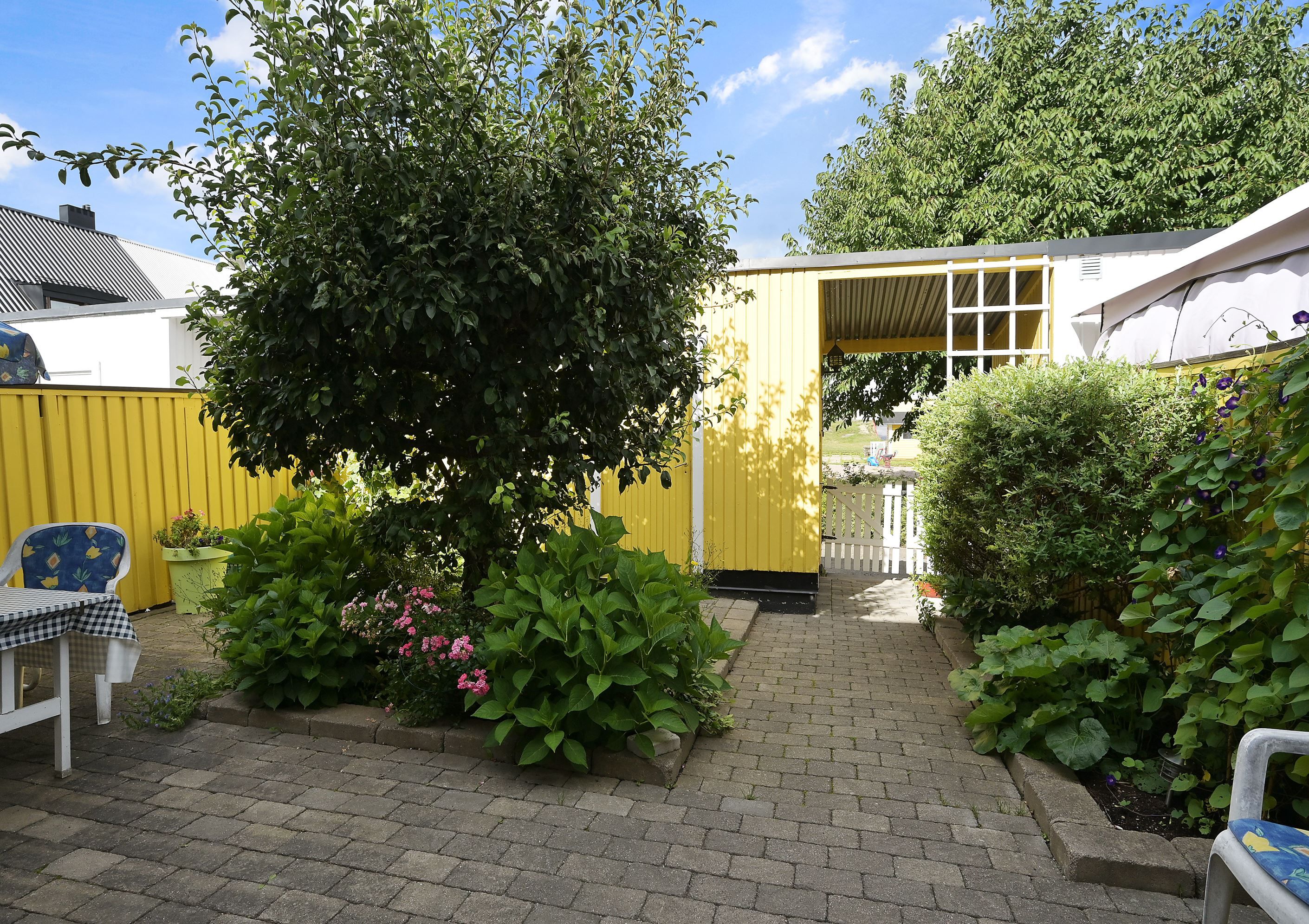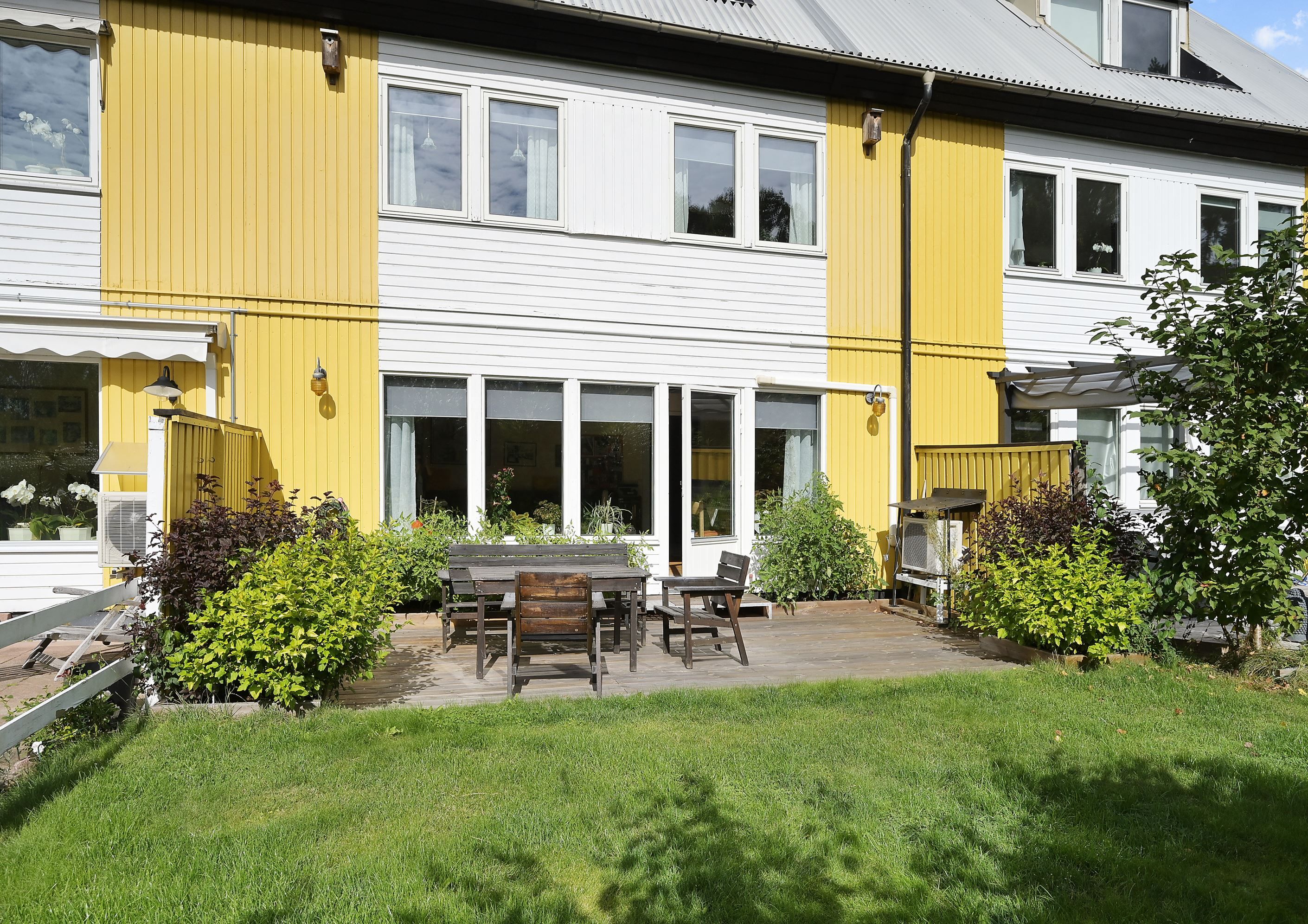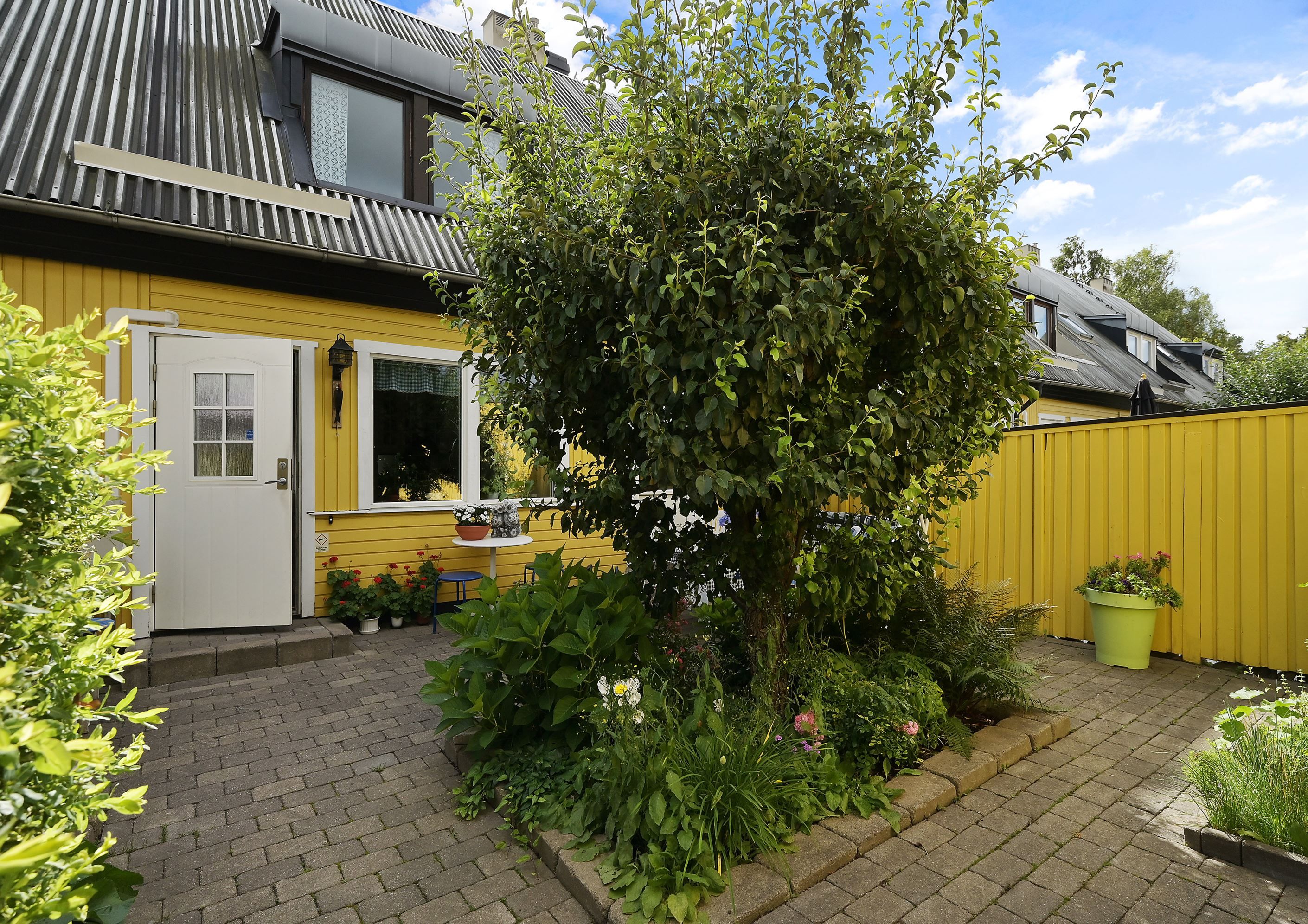 Välkommen till ett rymligt radhus i tre plan med en totalyta om ca 187 kvm, sällan till salu! Här bor du med ett perfekt och insynsskyddat läge samt två härliga uteplatser som låter dig följa solen från morgon till kväll. På framsidan möts du av en stenlagd uteplats med morgonsol – en underbar plats för dagens första kaffe. På baksidan väntar en solig altan som vetter mot en liten träddunge och erbjuder ett privat och rofyllt läge.