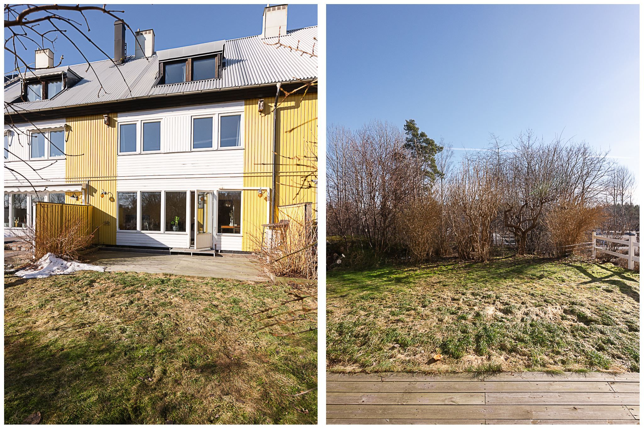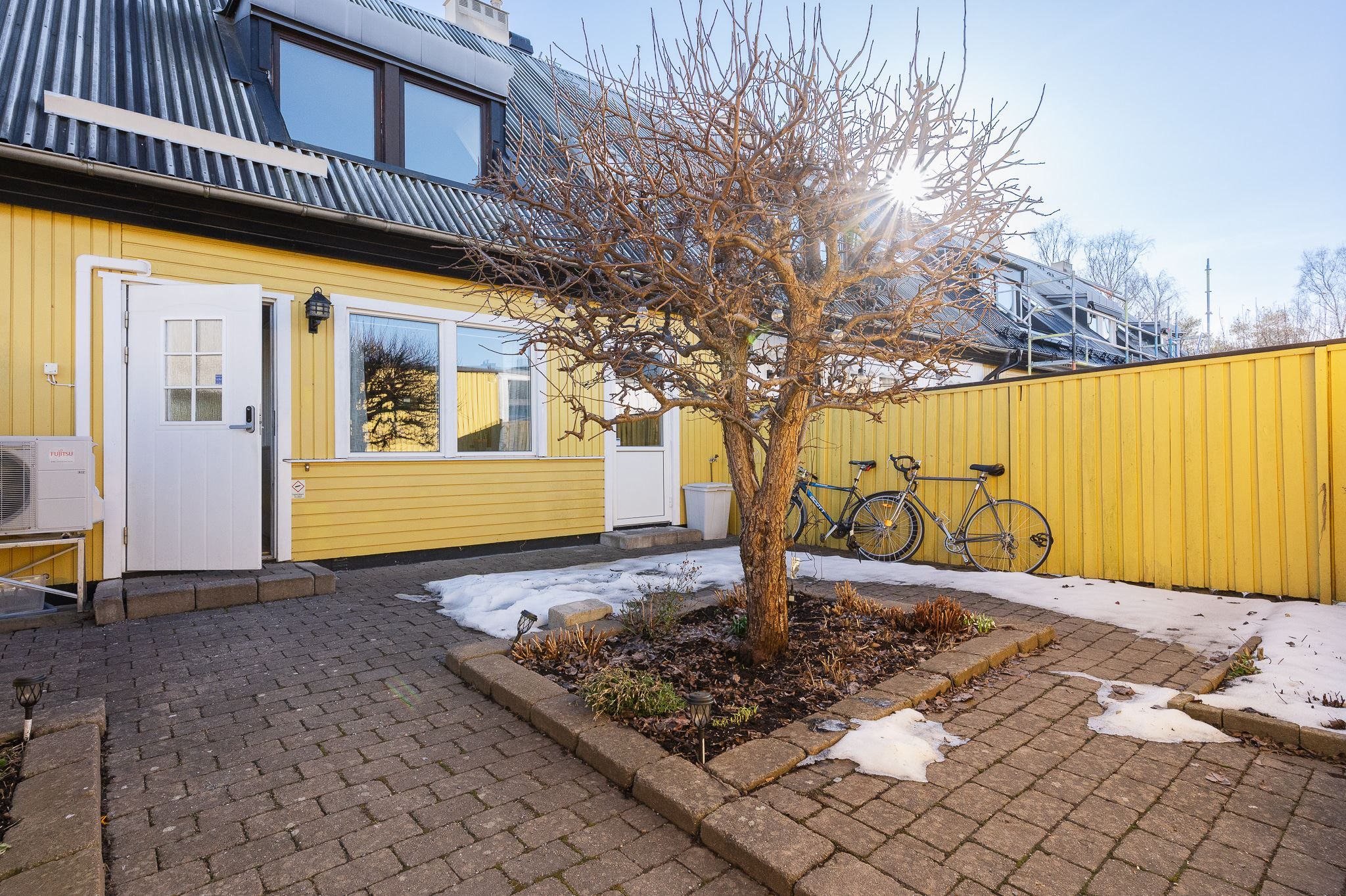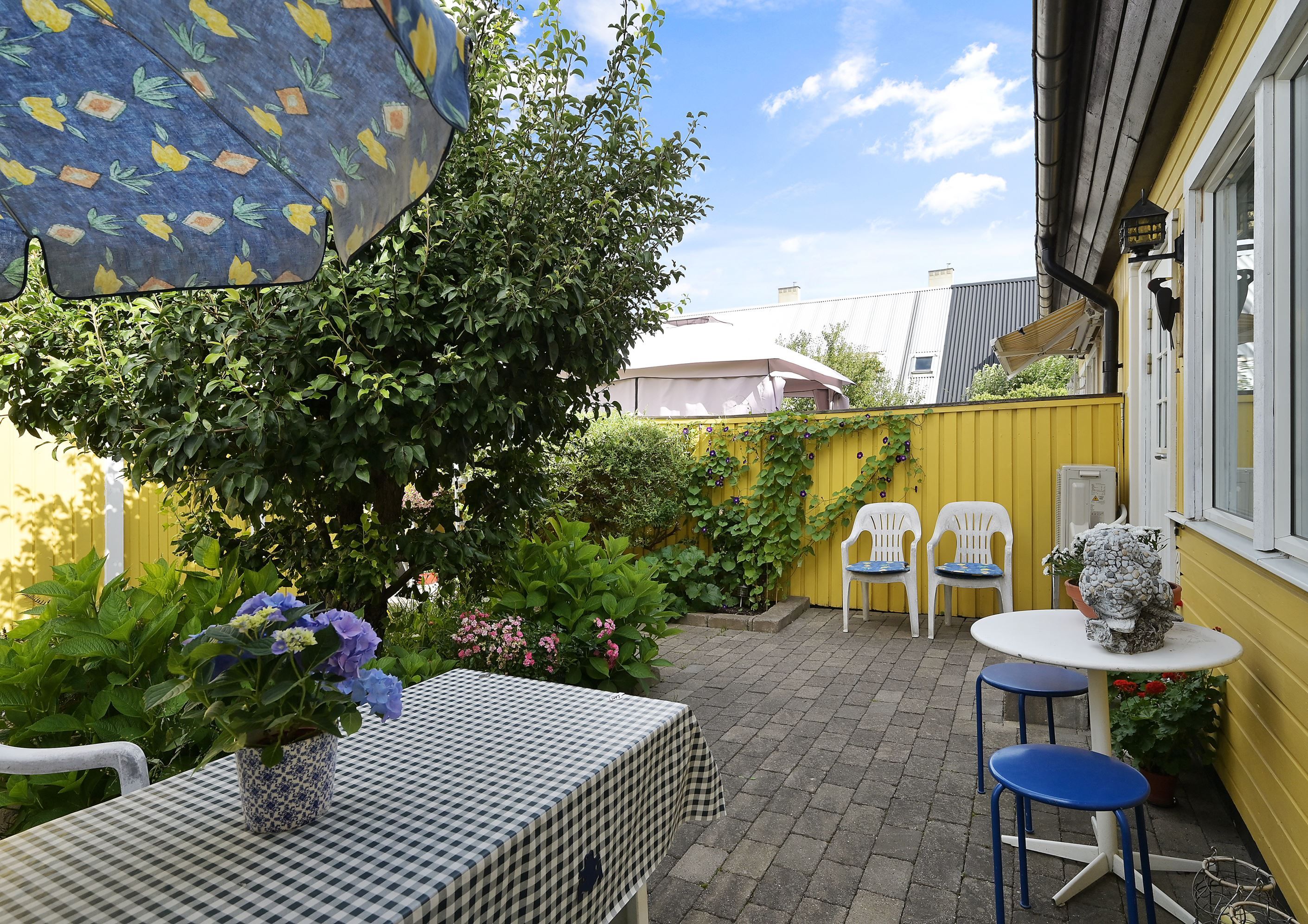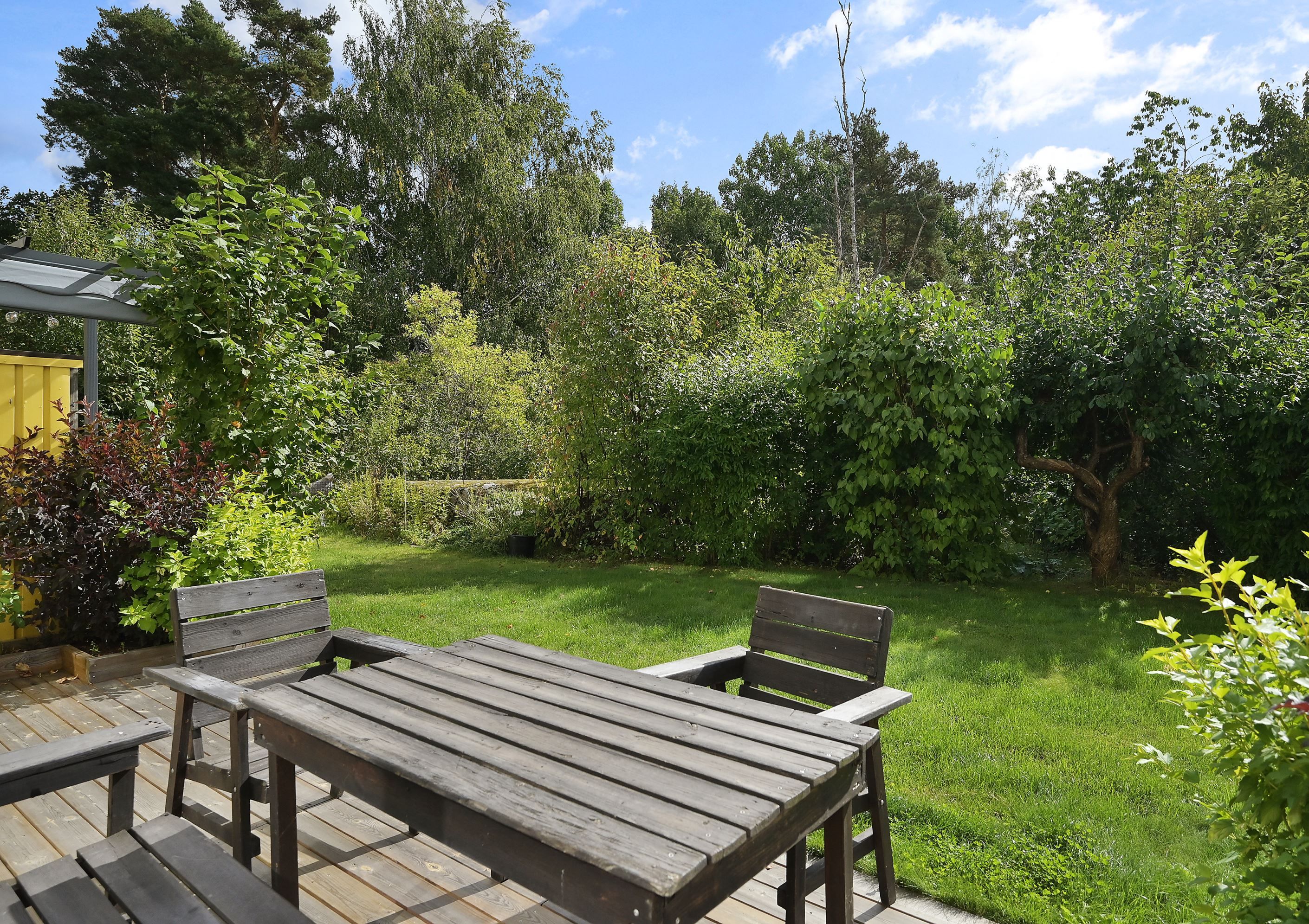 Välkommen till ett rymligt radhus i tre plan med en totalyta om ca 187 kvm, sällan till salu! Här bor du med ett perfekt och insynsskyddat läge samt två härliga uteplatser som låter dig följa solen från morgon till kväll. På framsidan möts du av en stenlagd uteplats med morgonsol – en underbar plats för dagens första kaffe. På baksidan väntar en solig altan som vetter mot en liten träddunge och erbjuder ett privat och rofyllt läge.