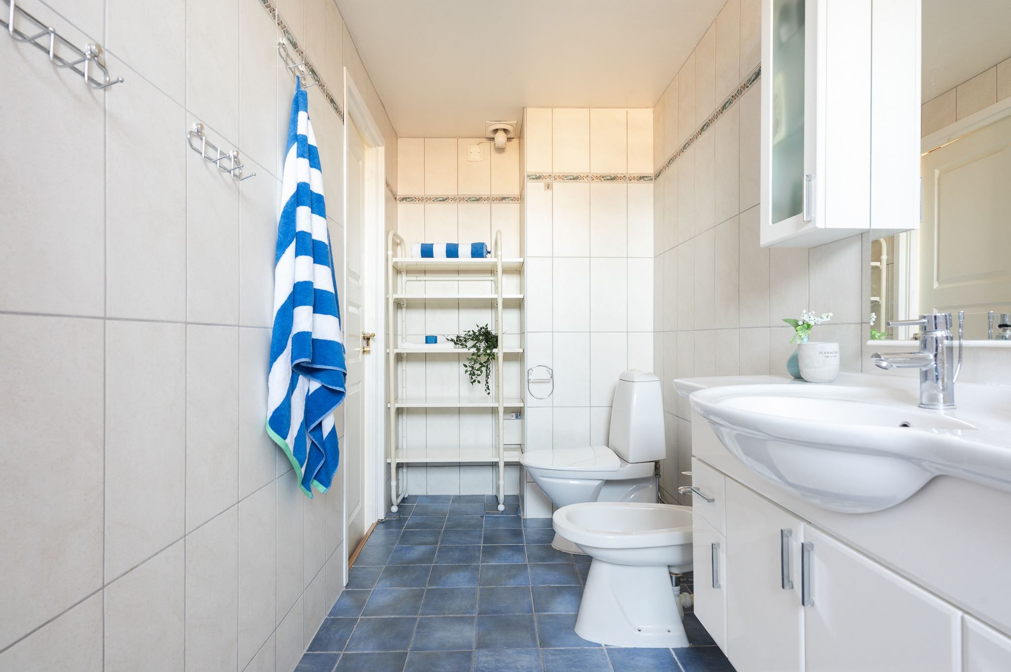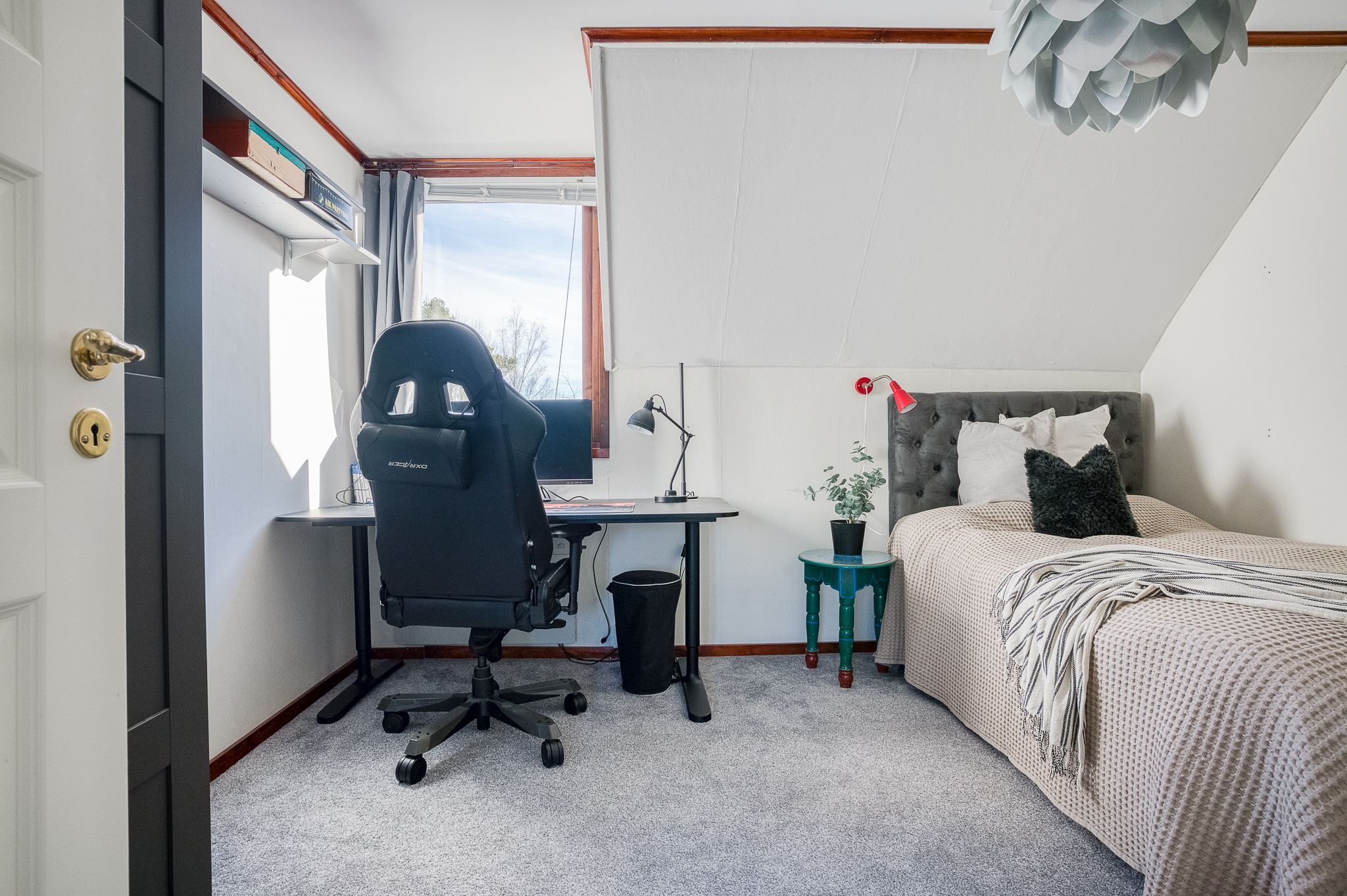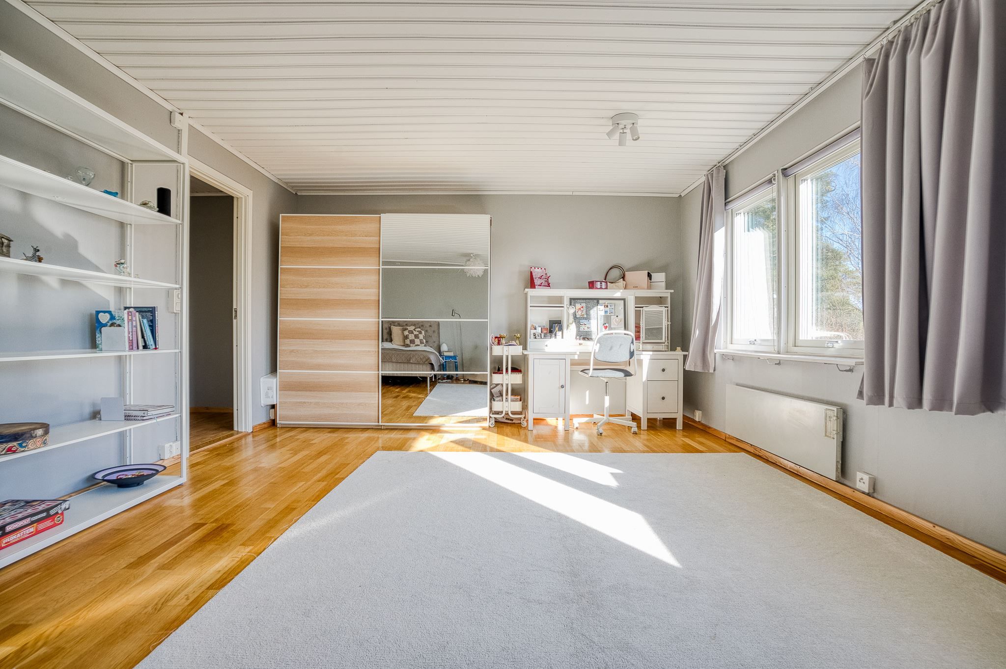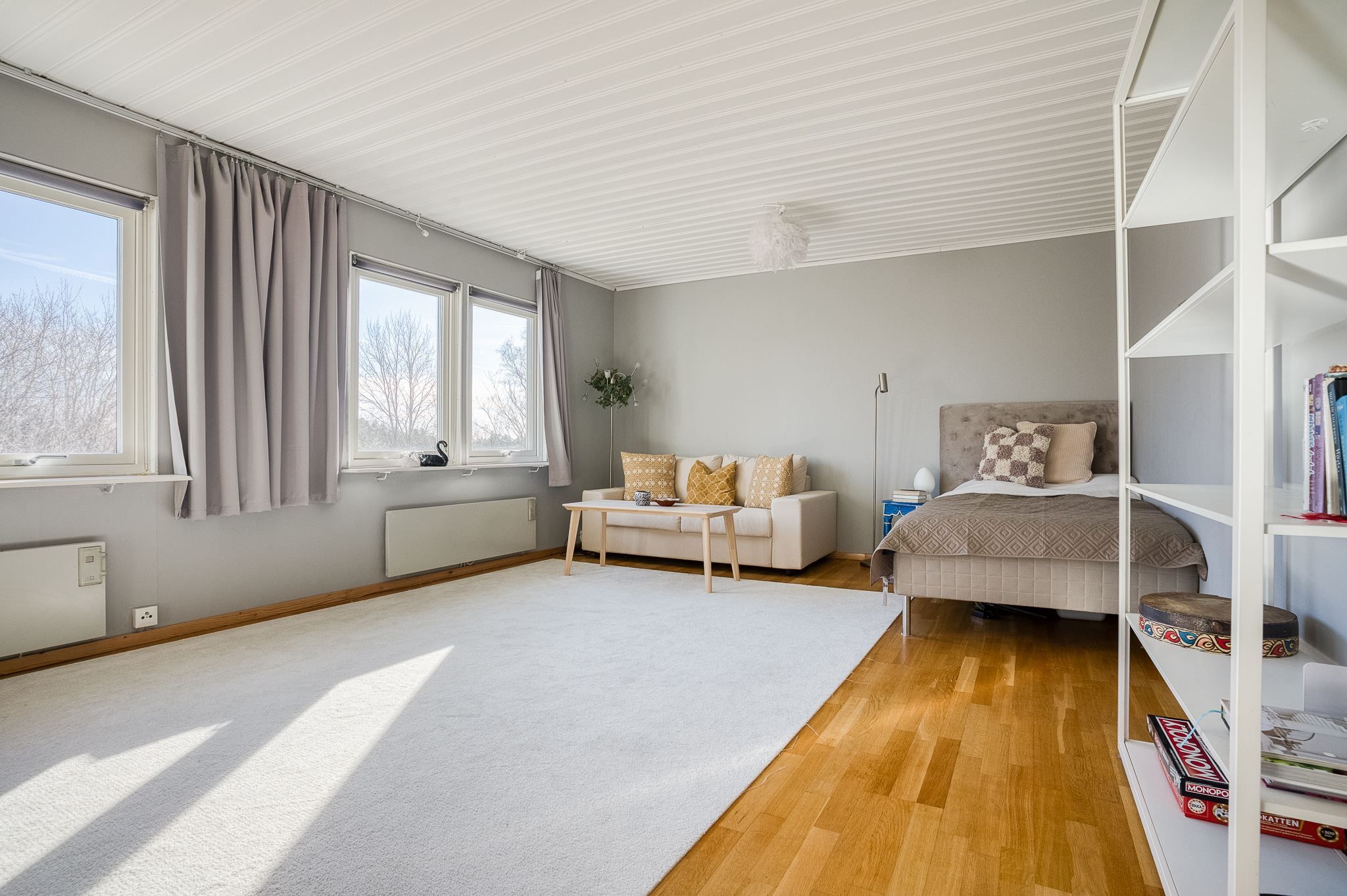 En trappa upp finner du tre väl tilltagna sovrum och ett helkaklat badrum med dusch. På nedre plan öppnar sig ett stort allrum med utgång till den insynsskyddade och soliga baksidan – perfekt som familjerum, tonårsdel eller gästavdelning. Här finns dessutom badrum med dusch och bastu, och ett rum för relax eller som idag gym.