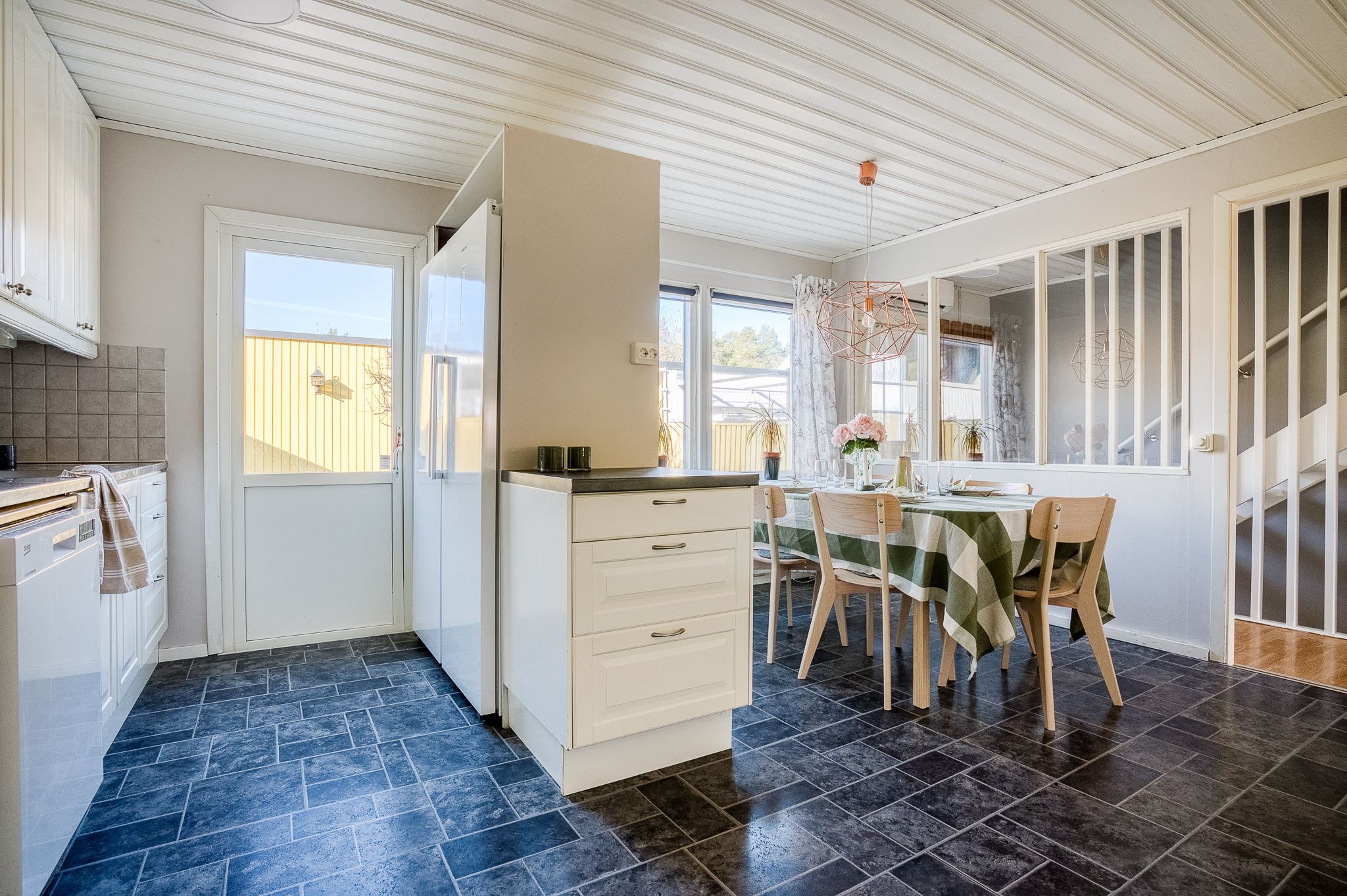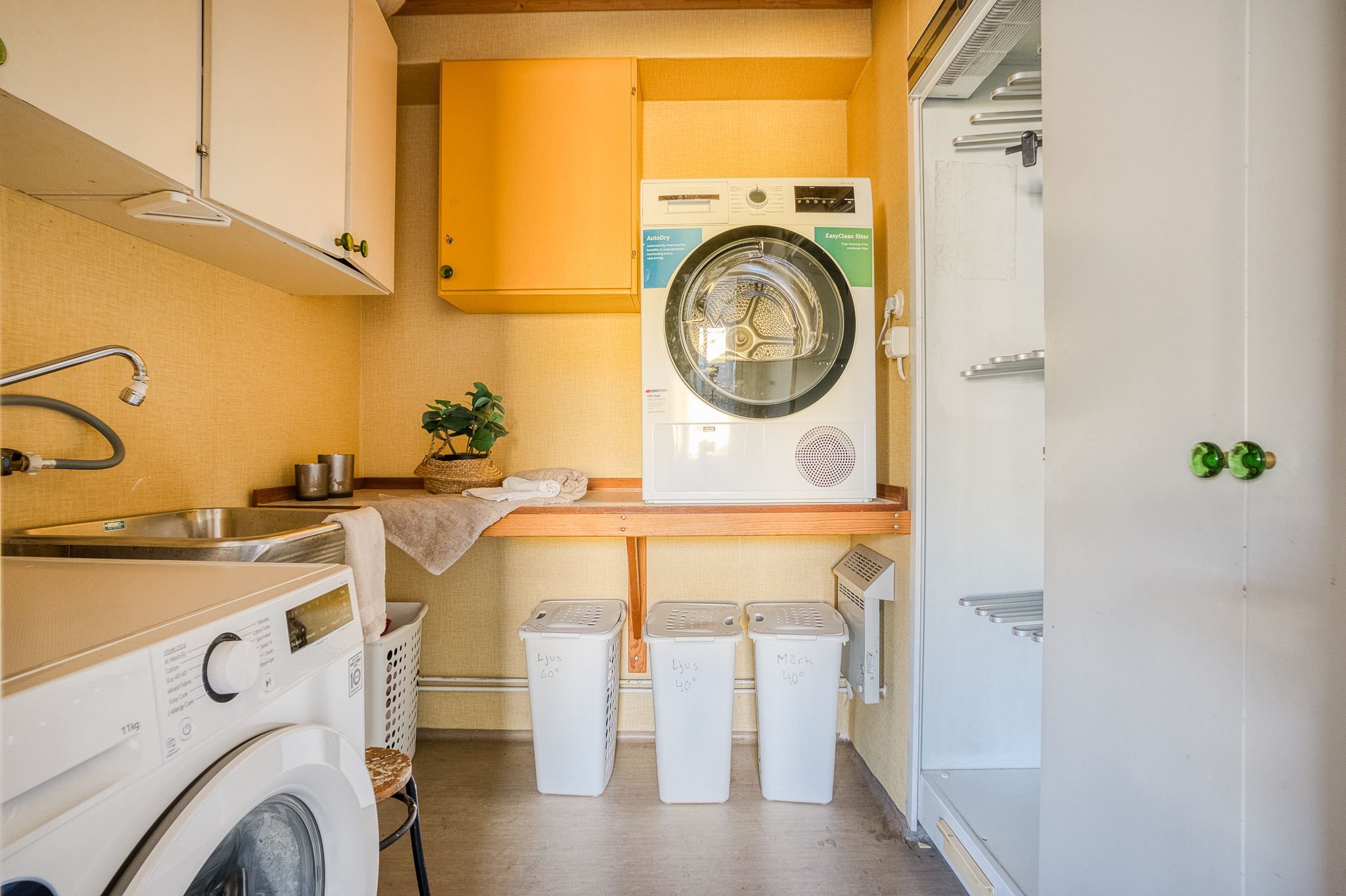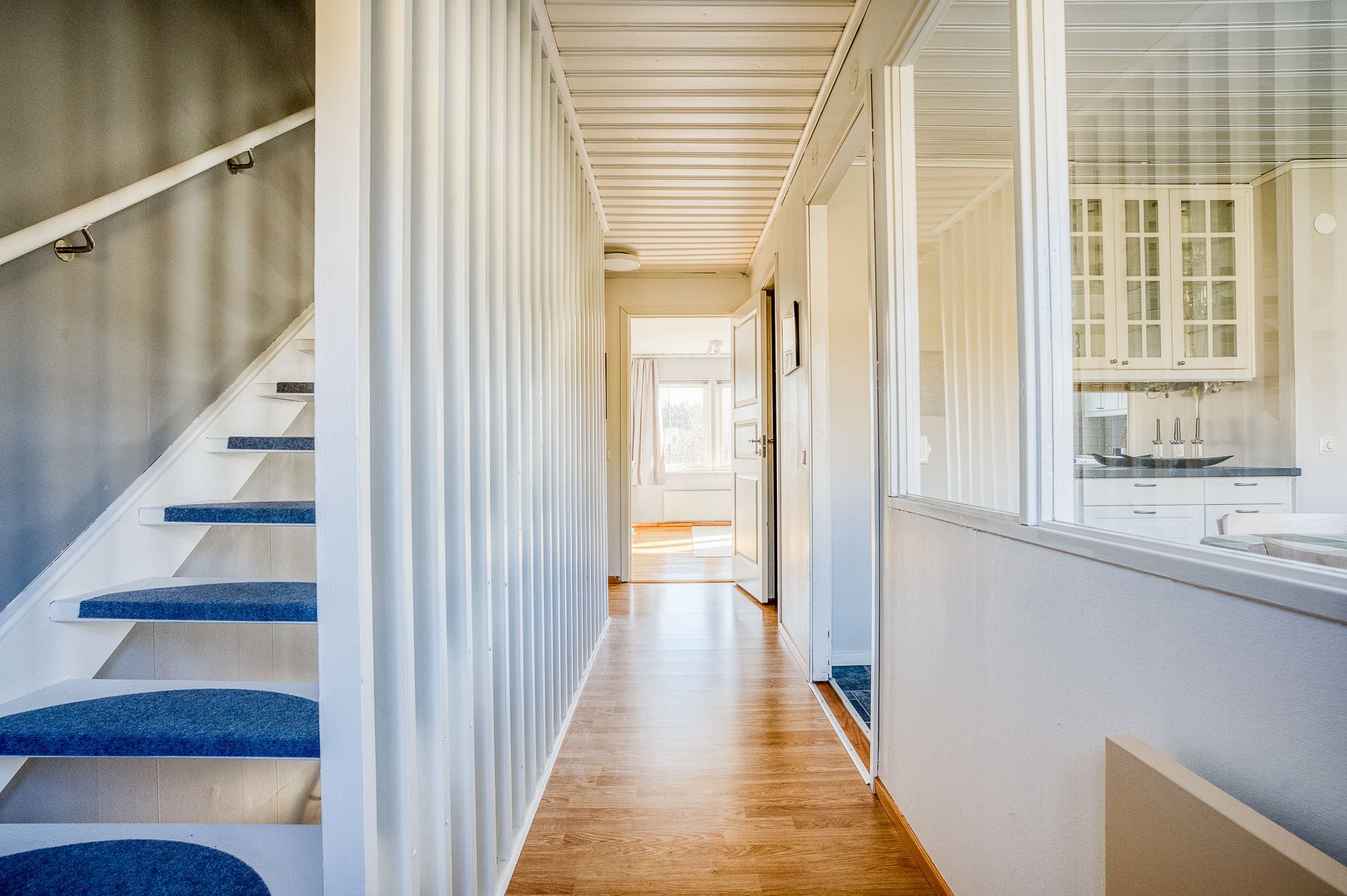 Entréplanet bjuder på ett generöst kök med utgång till framsidans uteplats och en trivsam matplats vid fönster med gott om utrymme för stora middagar och sociala tillställningar. Intill köket finns en praktisk och lättillgänglig tvättstuga. Här finns även ett rymligt vardagsrum samt en gästtoalett.