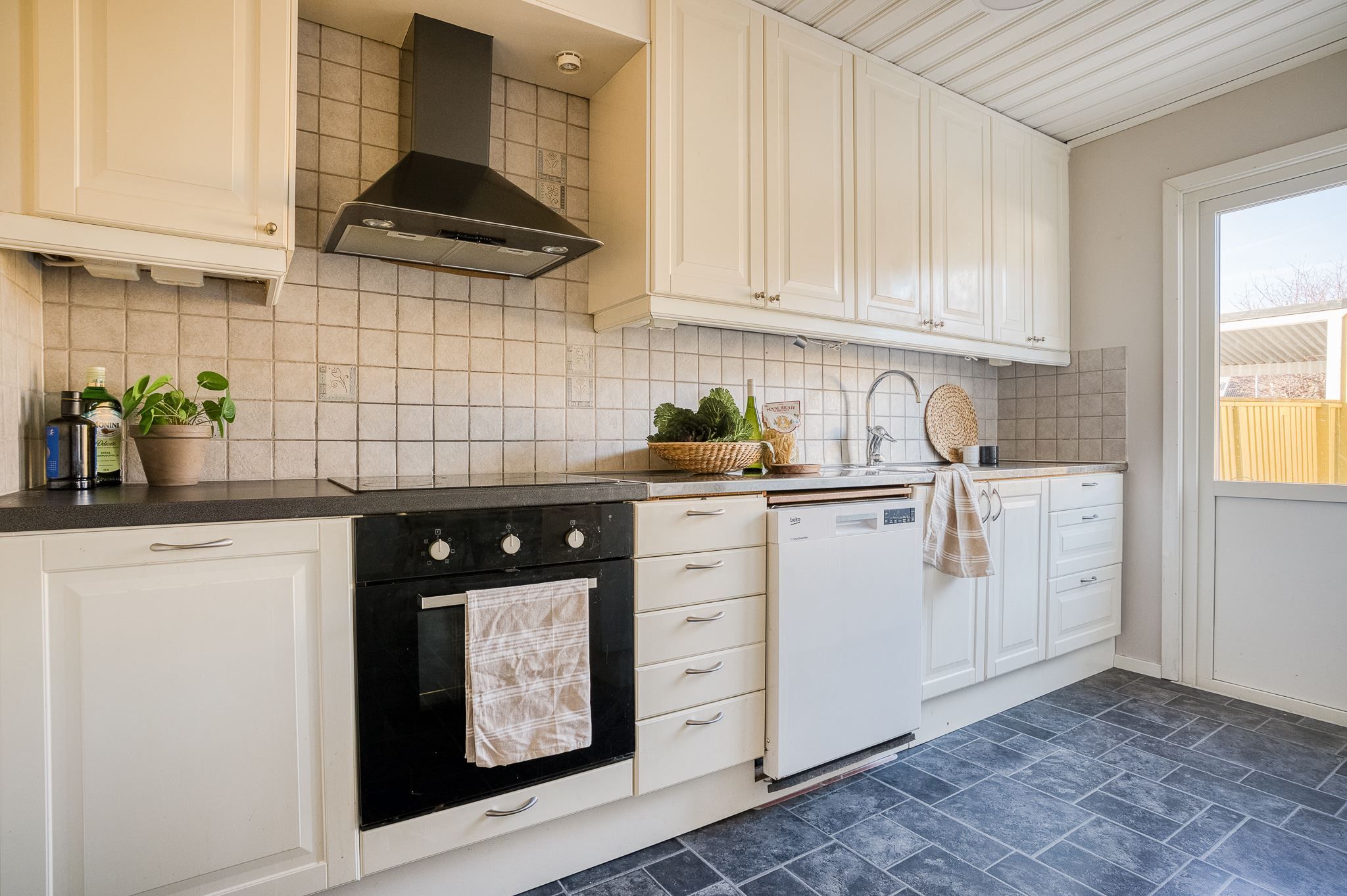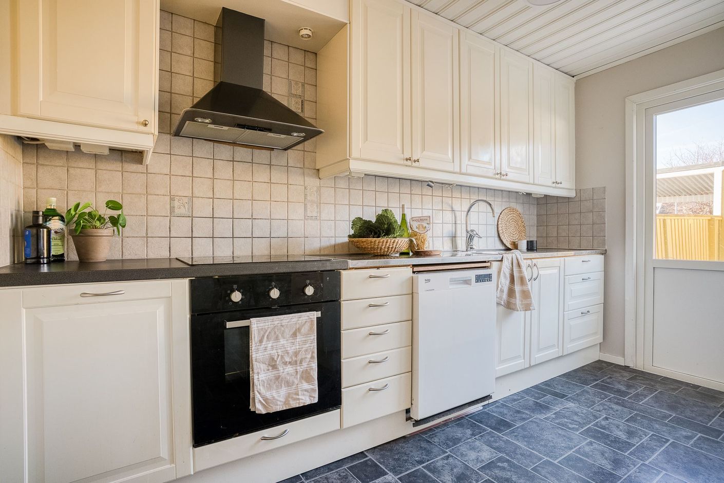Till huset hör även ett rymligt förråd och garage i länga.