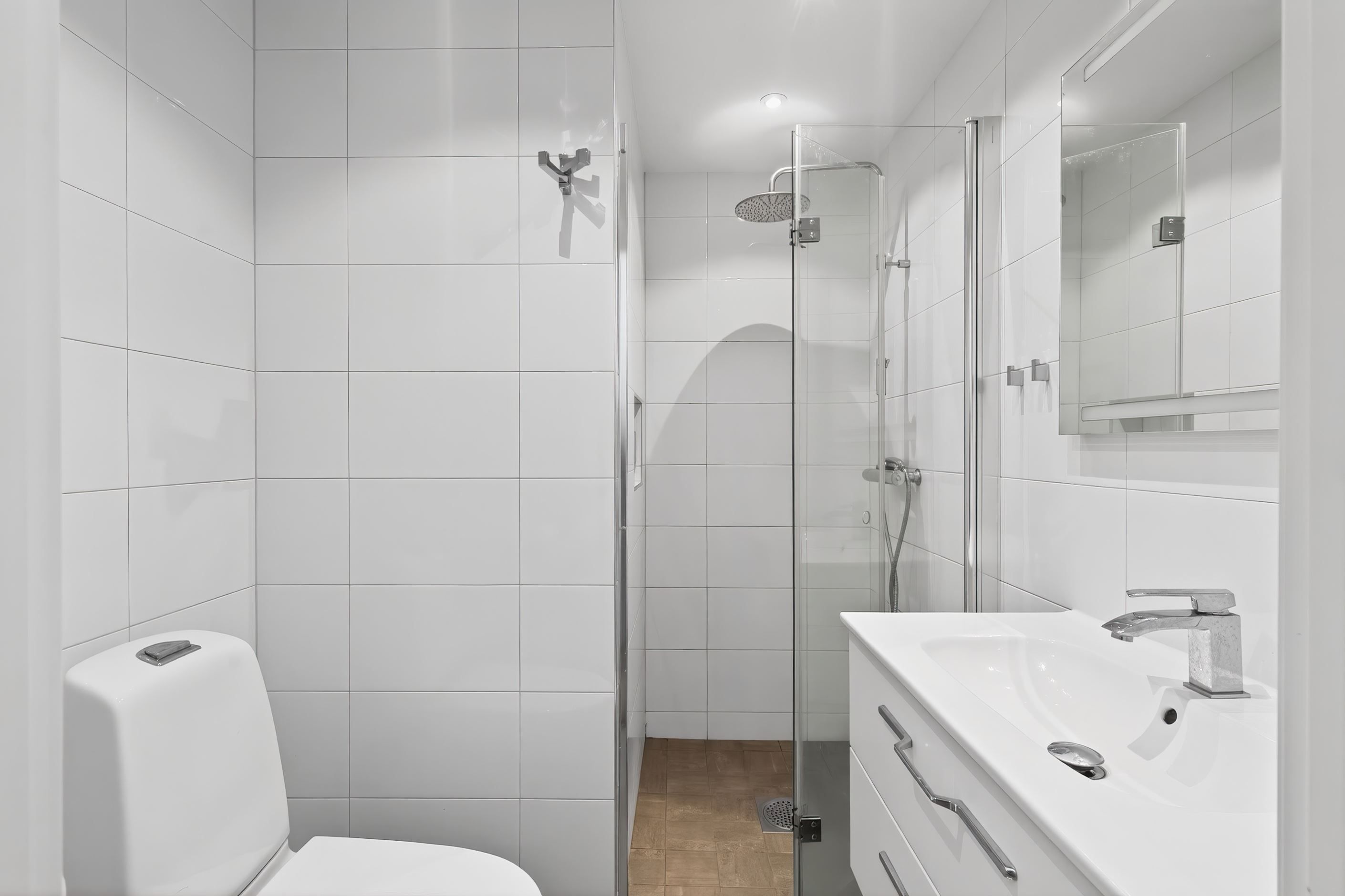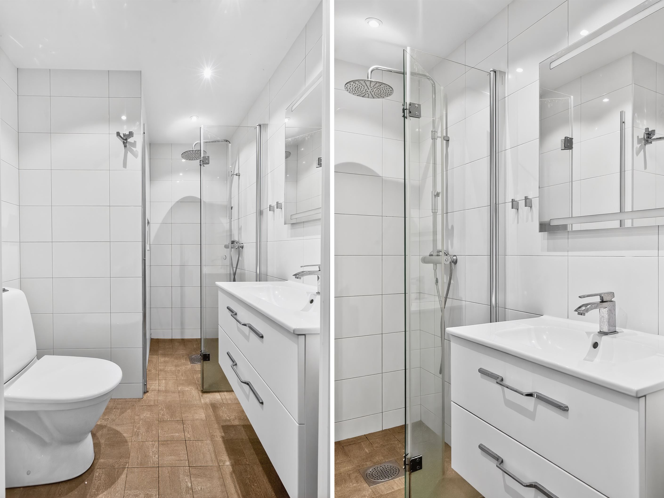 Modernt helkaklat duschrum med grått klinker med golvvärme och vitkaklade väggar. Här ryms duschhörna med glasvägg och väggnisch för schampoflaskor, tvättställ och spegel med inbyggd belysning ovan samt wc.