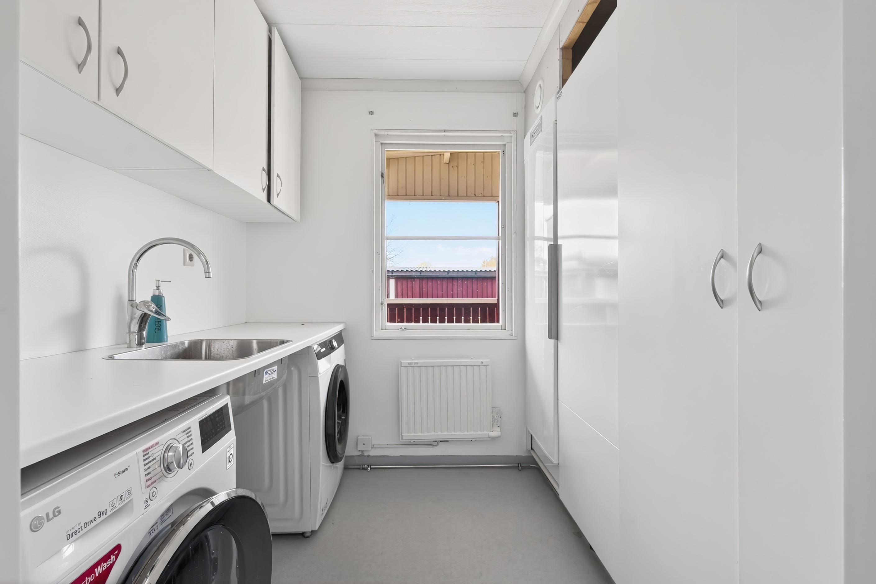 Från den inre hallen nås tvättstugan med fönster mot framsidan. Här finns arbetsbänk med tvättho och överskåp, tvättmaskin, torktumlare, torkskåp, linneskåp, städskåp och husets varmvattenberedare.