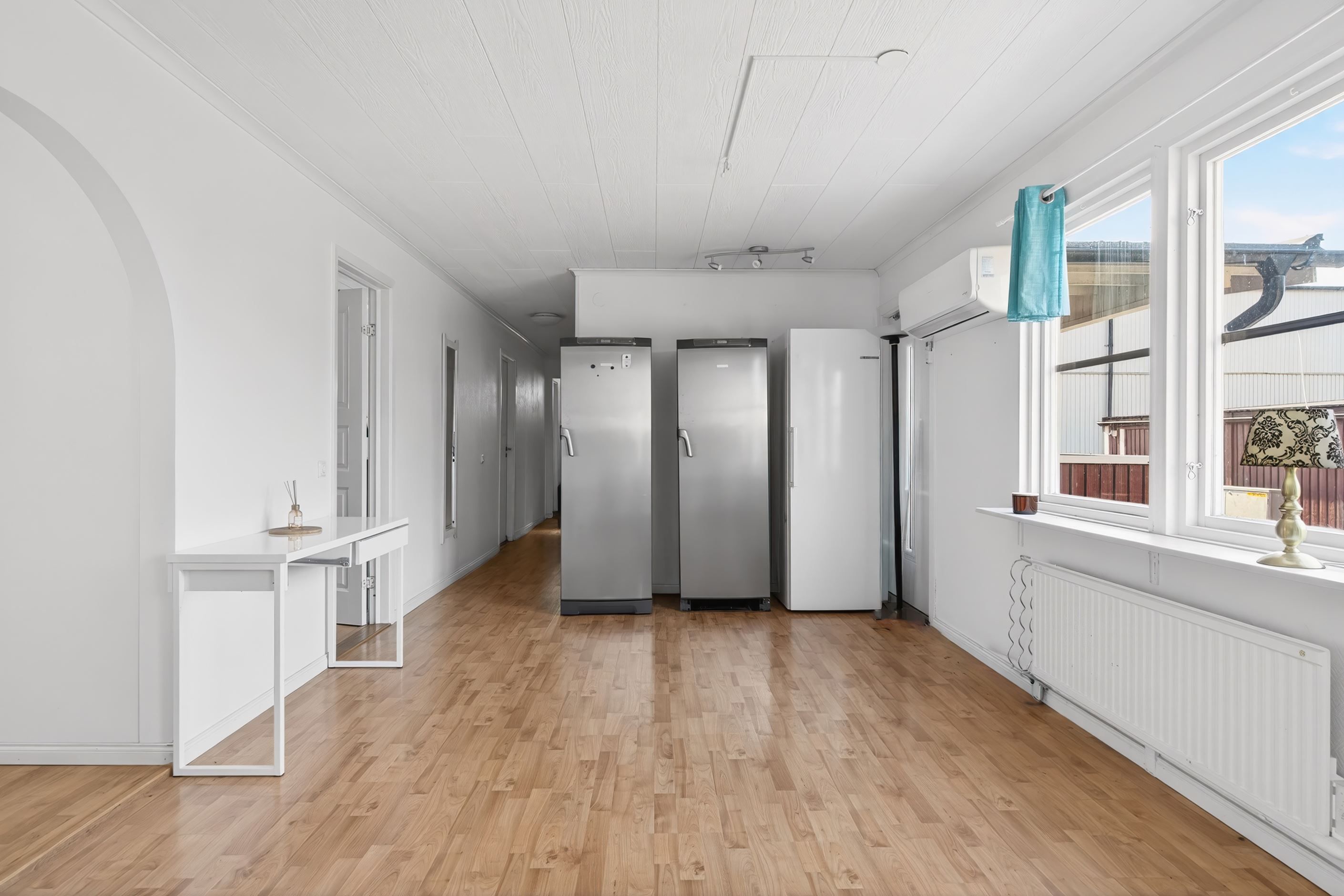 Från en trevlig farstukvist stiger man in i en välkomnande och praktisk hall med gott om plats för avhängning i stor skjutdörrsgarderob. Vita väggar och snyggt klinker med golvvärme. I anslutning till hallen finns ett stort förråd med utgång till baksidan. Rummet kan även användas som klädkammare, kontor eller hobbyrum.