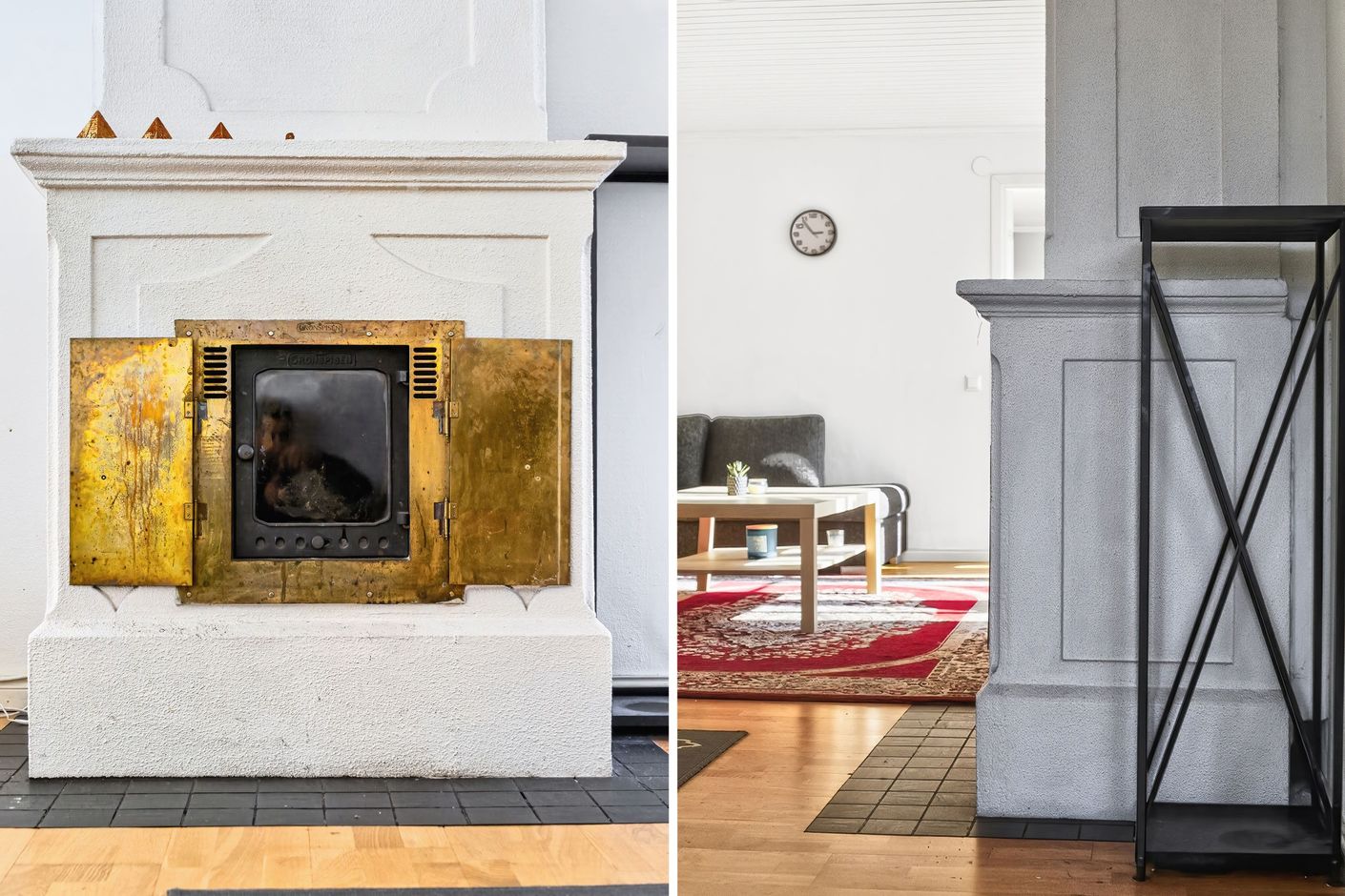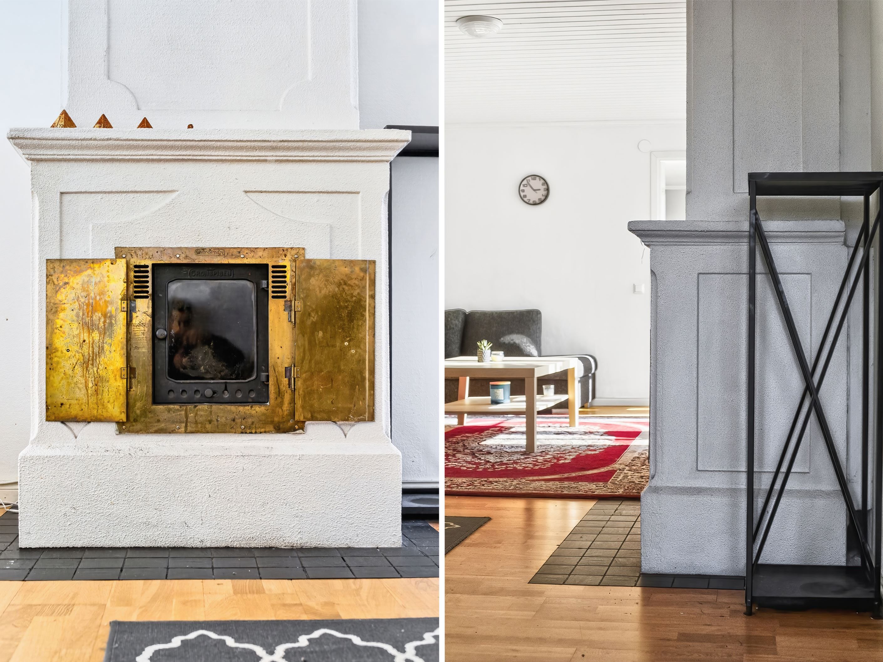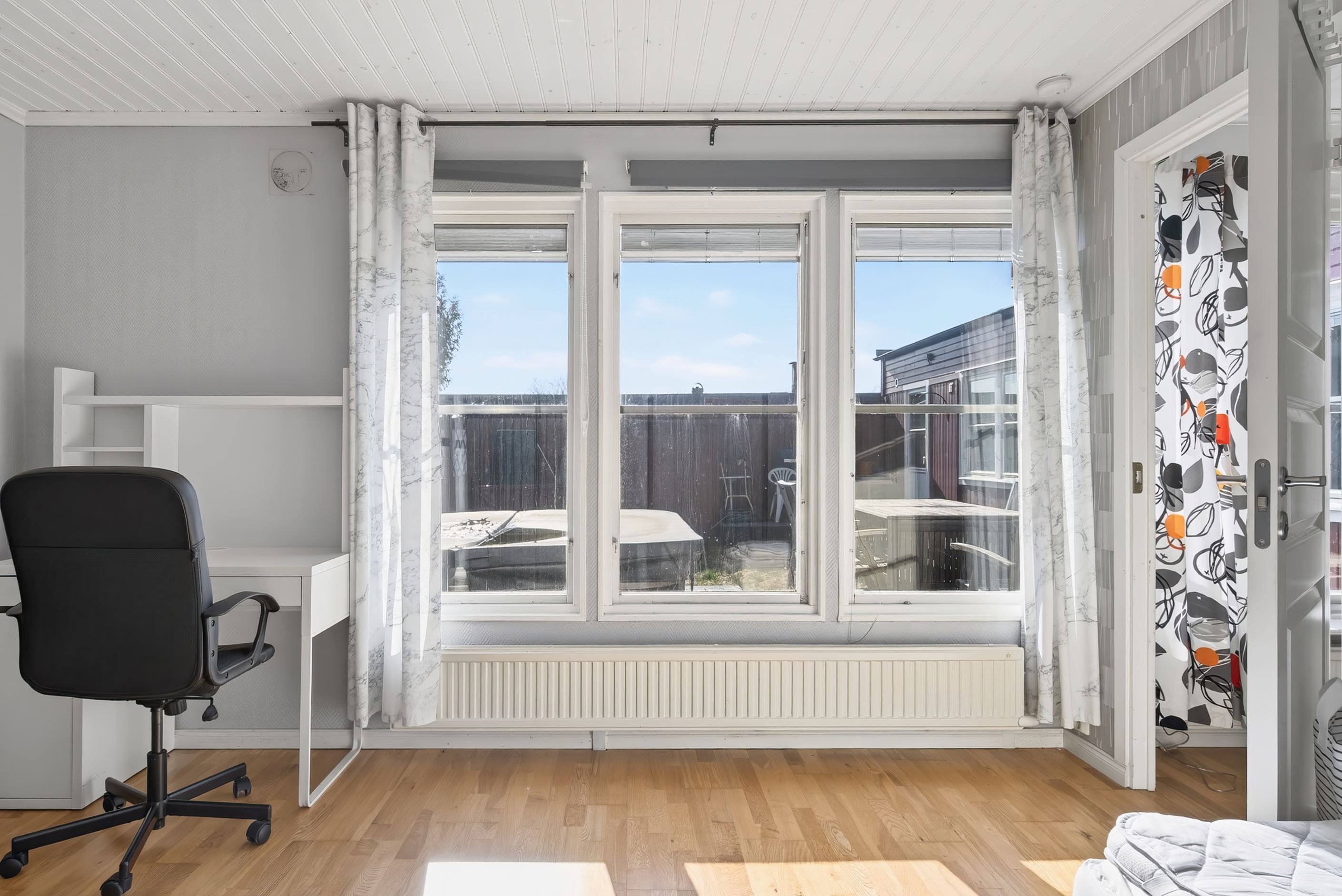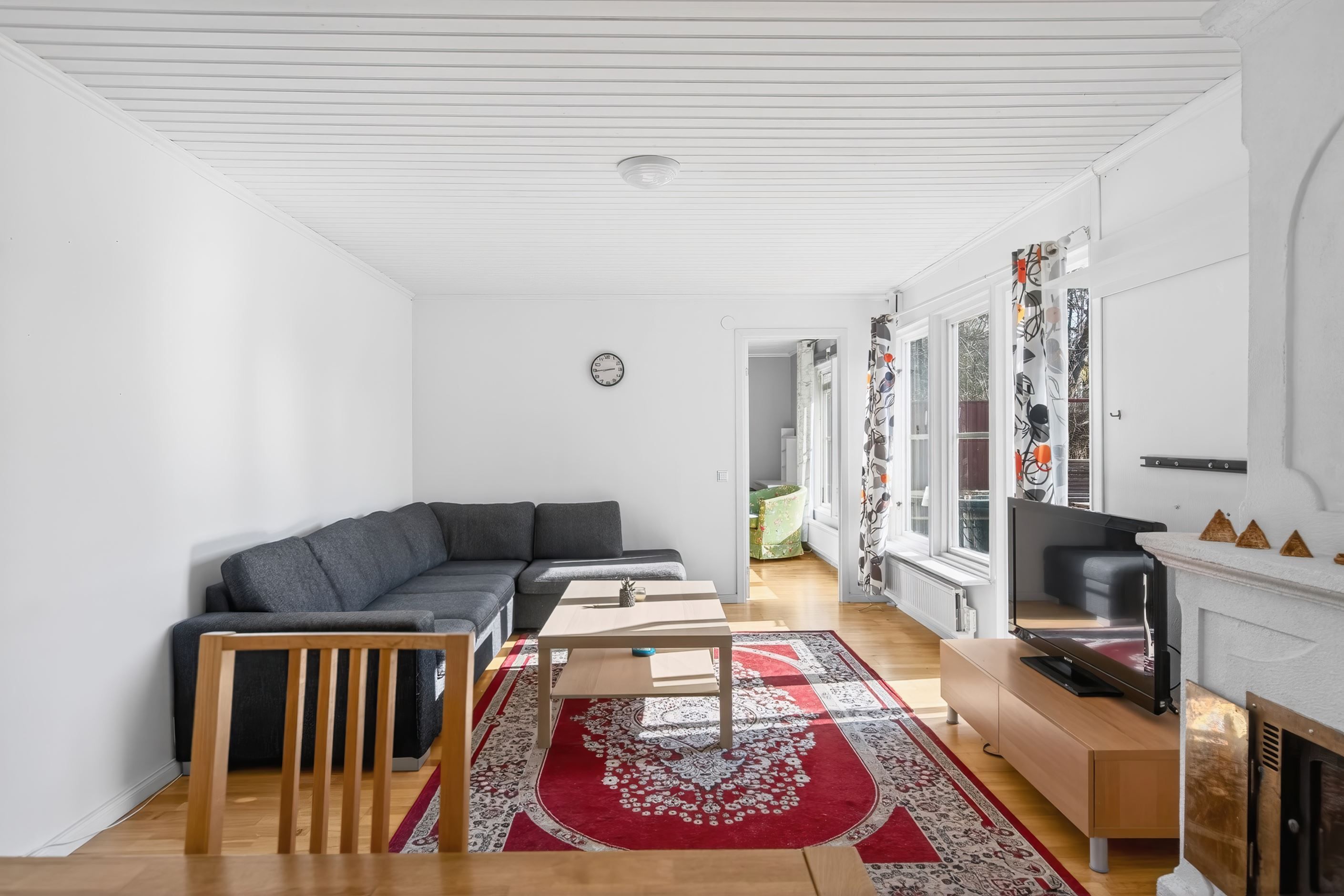 Ljust och trevligt vardagsrum med flera fönster och utgång till altan på skyddad baksida. Stor murad kronspis för värme och trivsel. Vita väggar och parkettgolv.