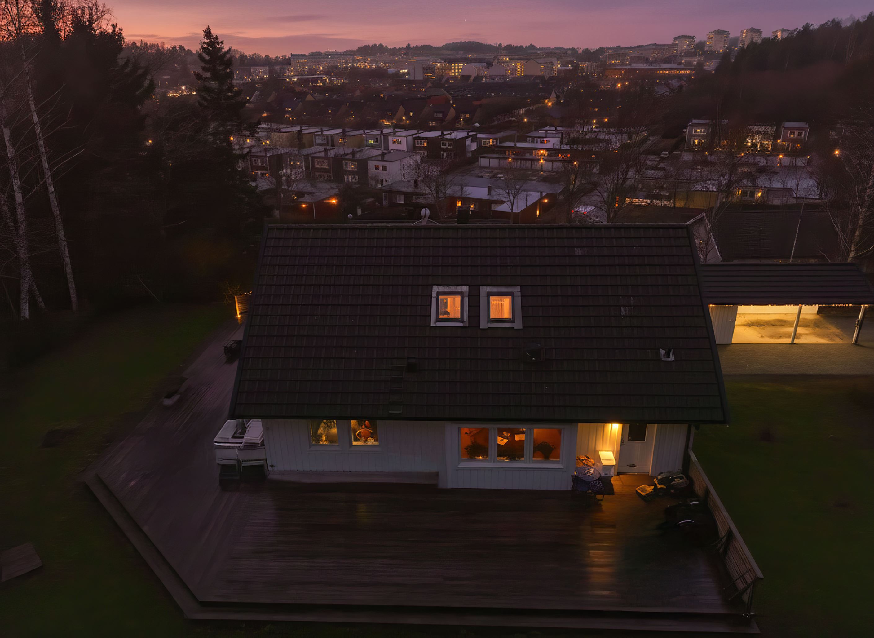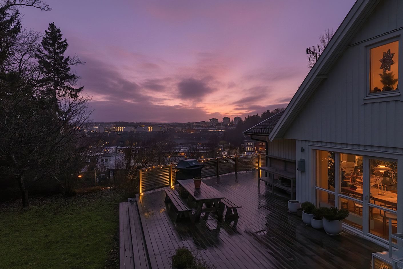 Kliv in i ett hem där utsikten över Åkersberga breder ut sig och där solen följer dig från morgon till kväll. På höjden, uppe på toppen, ligger detta välskötta hus på ca 149 mycket välplanerade kvm, inbäddat i grönska med en plan trädgård och med stora trädäck som sträcker sig runt huset. Här väntar en lugn oas – angränsande till en spännande skogsdunge – men med alla bekvämligheter nära till hands.