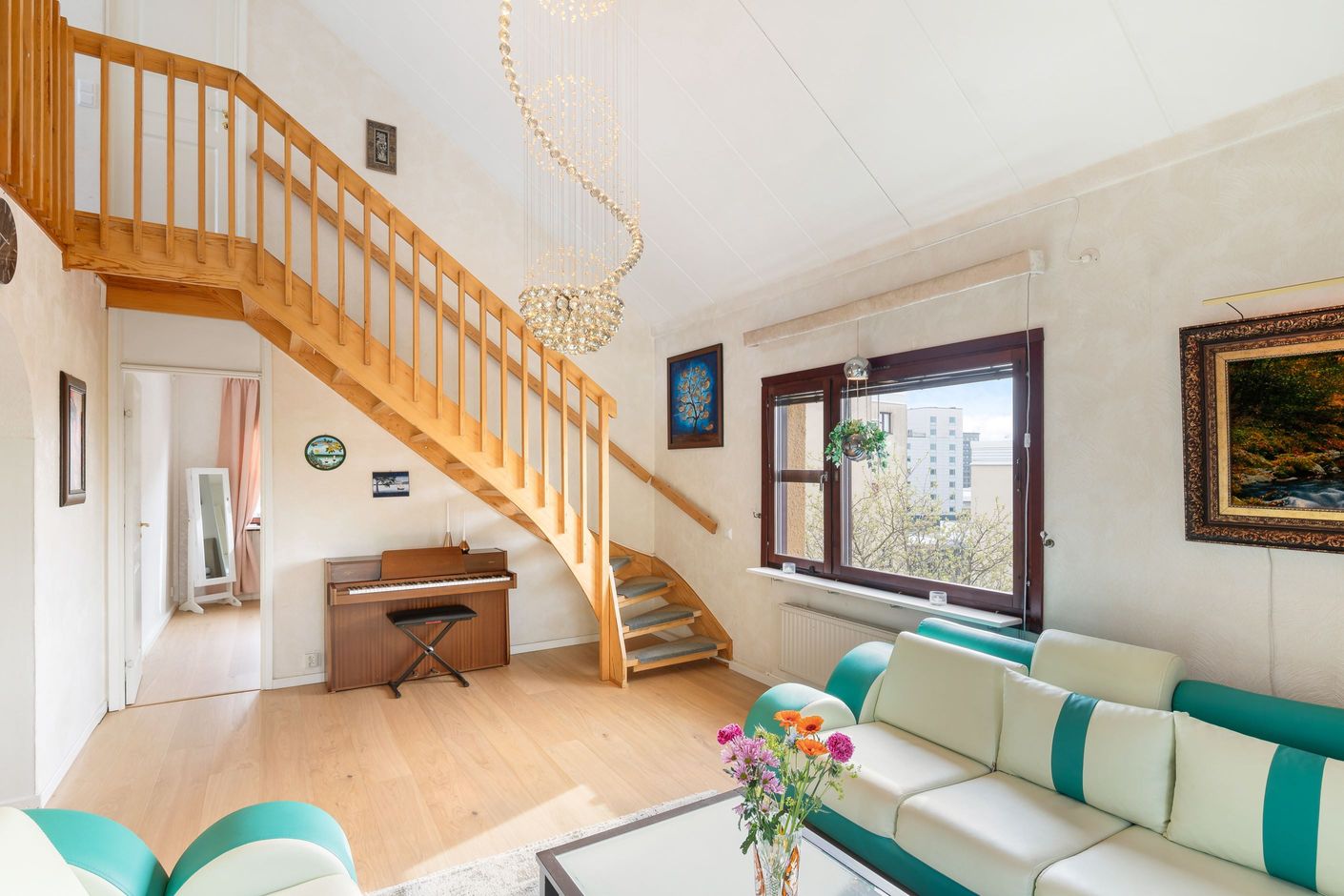 - Välkomna till denna påkostade etagevåning i Kistas bästa förening! Entréplanet har renoverats under de senaste åren med härdad 1-stavsparkett av ljus ek. Badrummet på entréplanet är utrustat med nya maskiner från Miele för ca 30.000 kr. Här finns även duschplats med glasvägg samt moderna badrumsmöbler från 2015. Vitt kök med påkostade kyl- och frysskåp från Liebherr för ca 50.000 kr. I övrigt är köket utrustat med spishäll, varmluftsugn med microvågsugn, köksfläkt samt diskmaskin. Entréplanet består av hall med säkerhetsdörr, garderober samt ett förråd. Här finns även ett stort sovrum samt det stora vardagsrummet med ca 5 meter i takhöjd! Det övre planet disponeras idag med ett sovrum samt ett gigantiskt vardagsrum. Det går enkelt att återställa vardagsrummet till 2 sovrum enligt originalplanritningen. På det övre planet finns det stora badrummet från 2014 med jacuzzi samt duschkabin med ångfunktion. Bostadens pärla är givetvis den privata och inglasade takterrassen i västerläge med eftermiddags- och kvällssol.