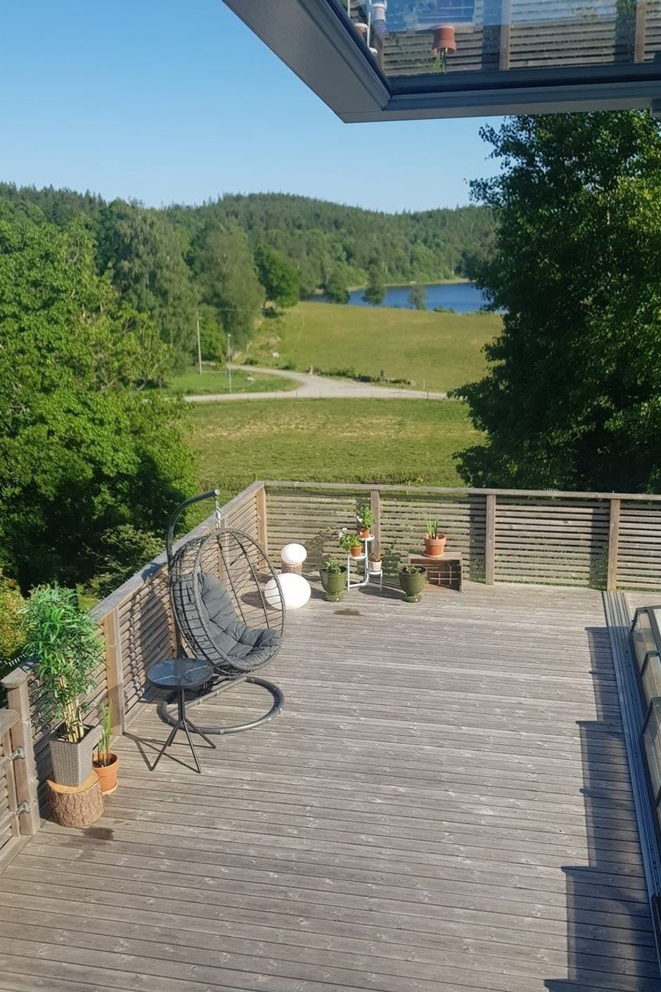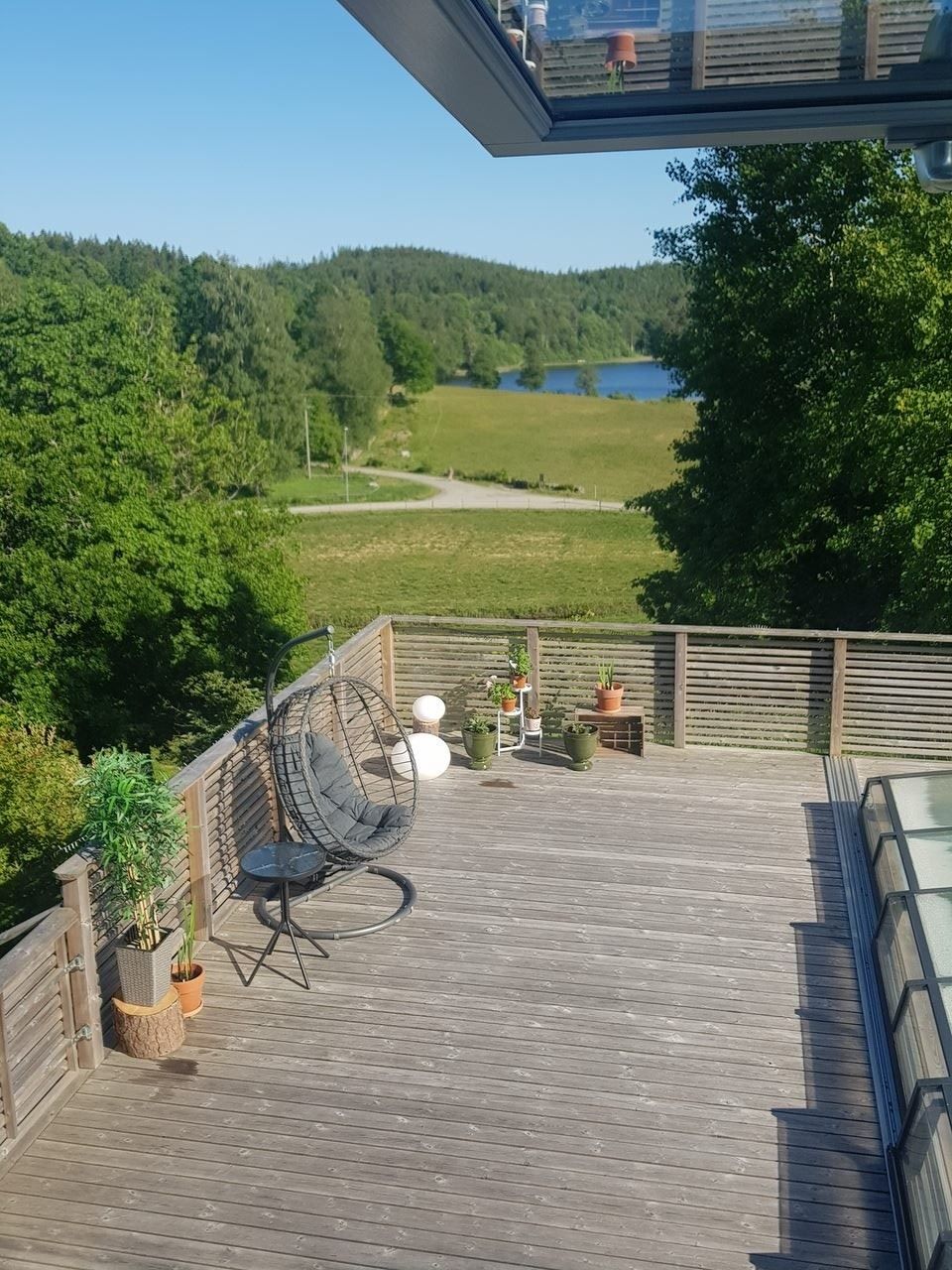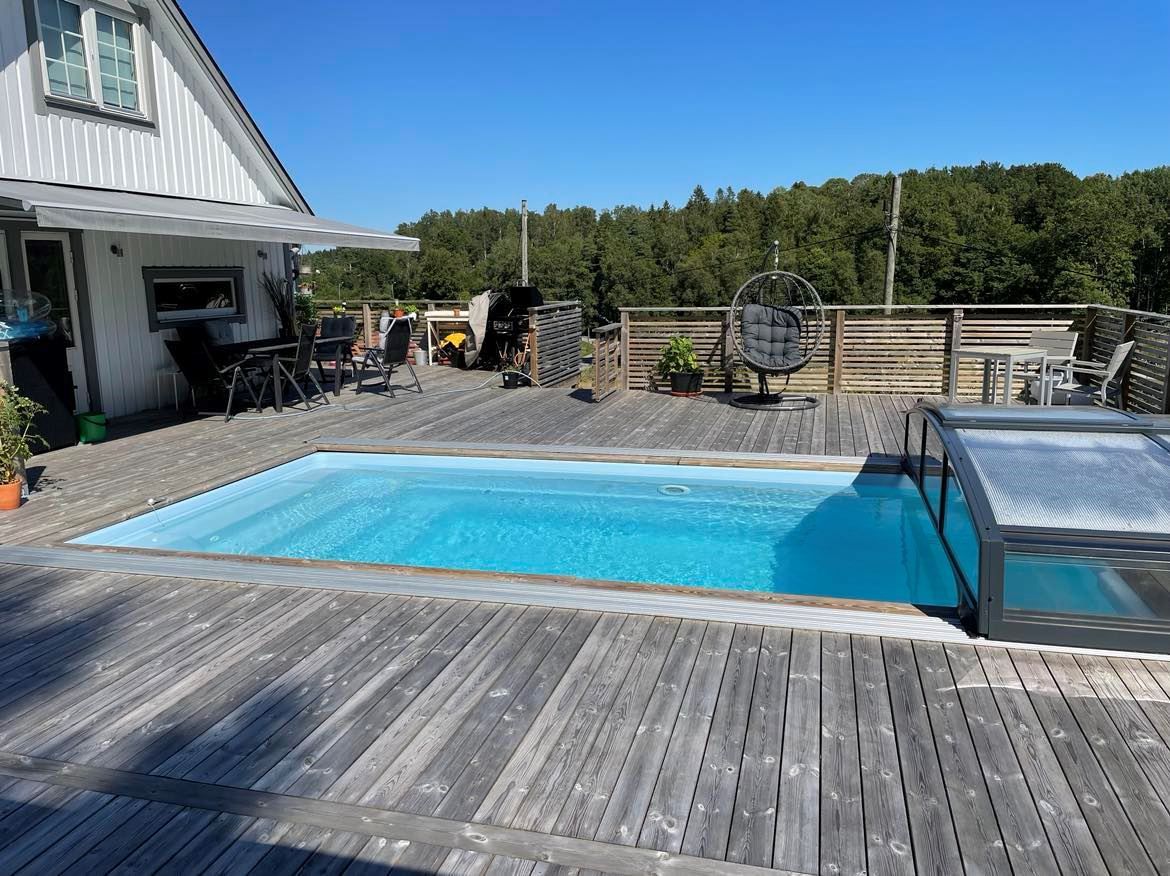 Utomhus väntar en stor terrass med pool och generöst soldäck – en privat oas där sommardagarna gärna tillbringas från morgonkaffet till sena grillkvällar. Här njuter ni av sjöutsikt och rofyllda omgivningar. Tomten bjuder in till lek och avkoppling, och i anslutning finns både dubbelgarage och friggebod som ger extra utrymme för hobby, förvaring eller gäster.