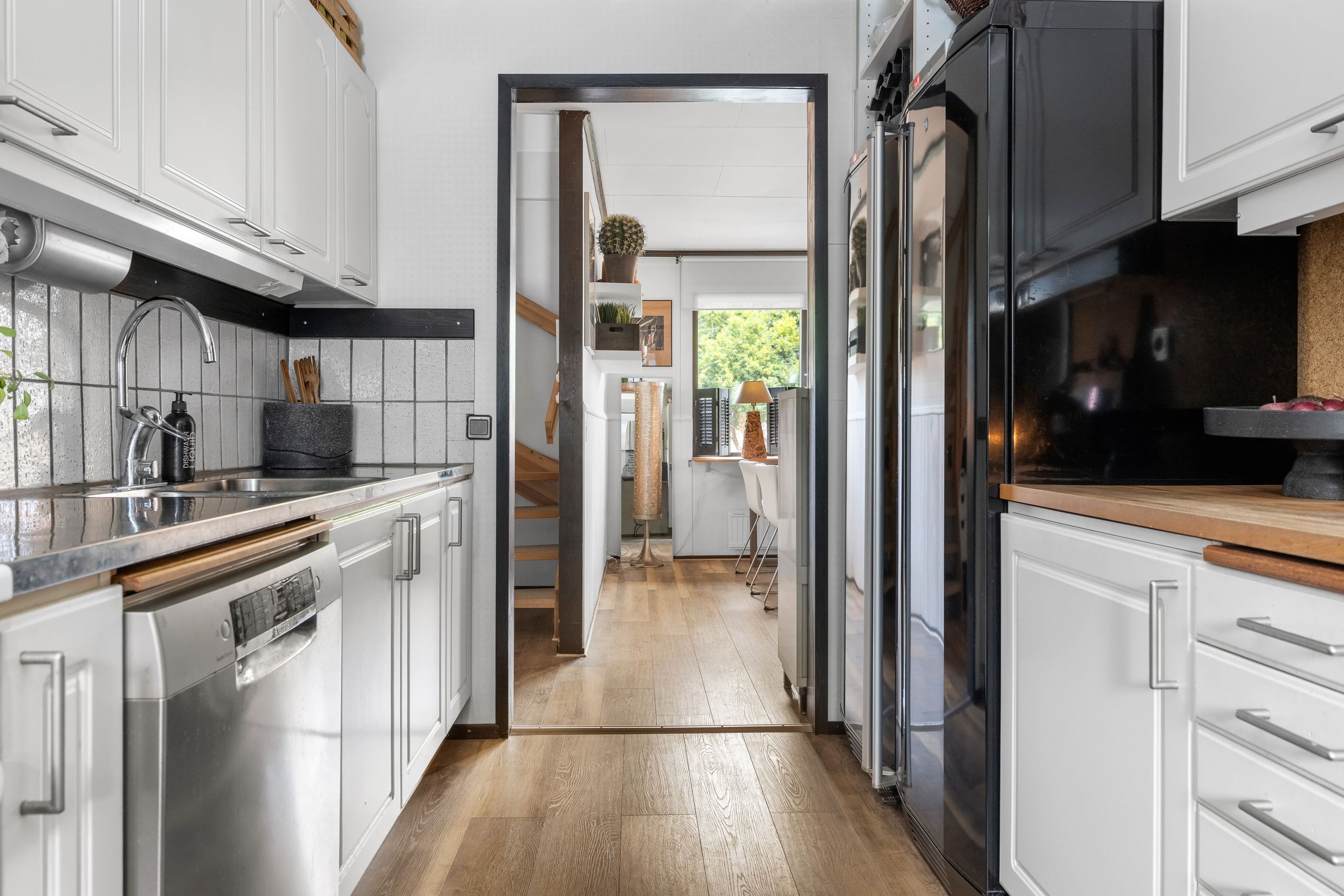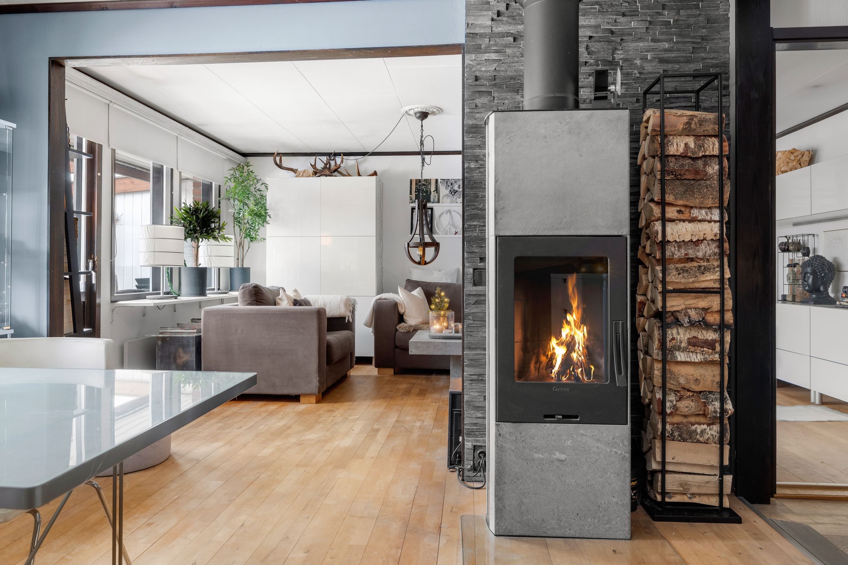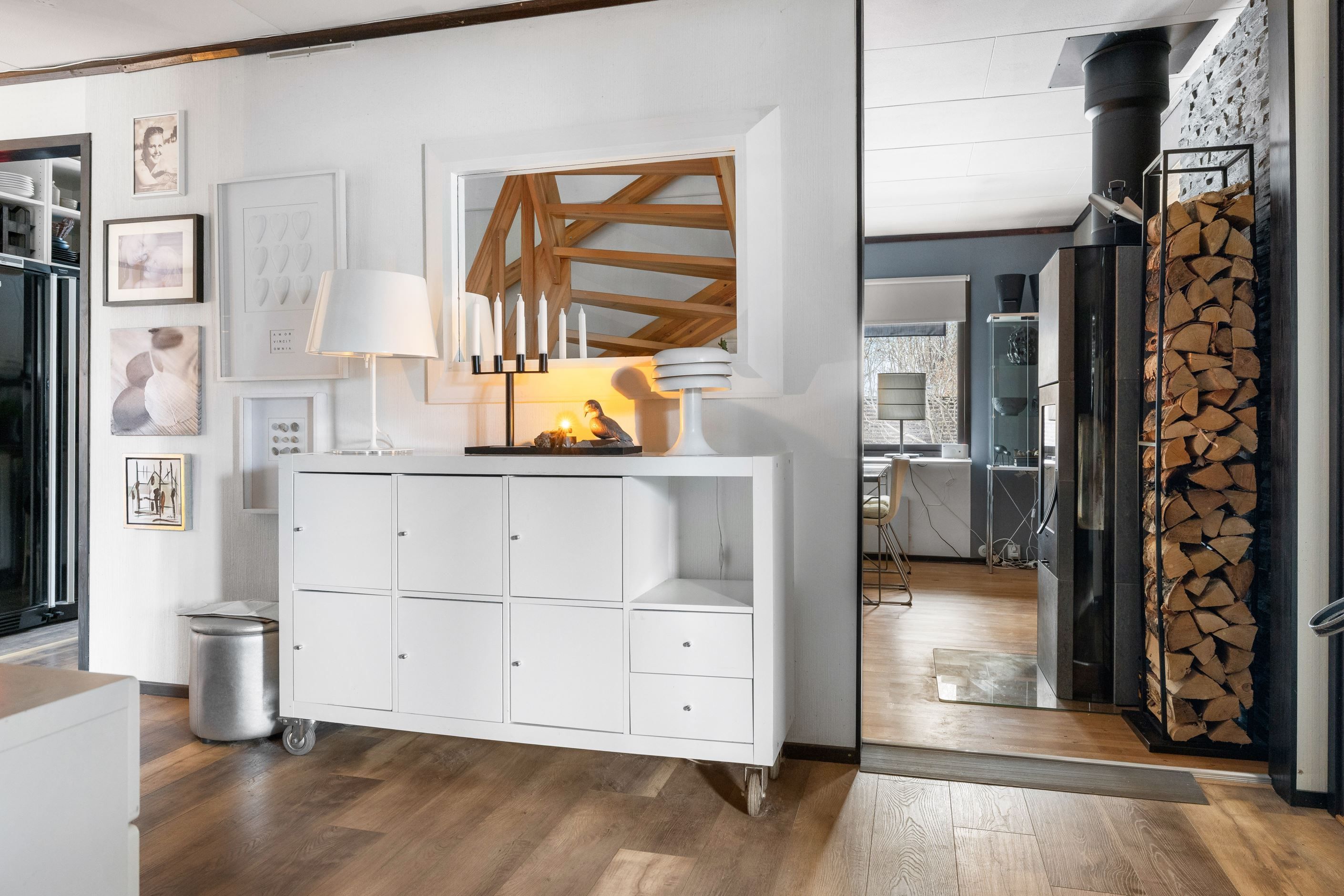 Inne möts du av en ljus och luftig planlösning med matsal med värmande braskamin i direkt anslutning till vardagsrummet. Här har nuvarande ägare öppnat upp mellanrummet och installerat en braskamin som skapar värme och trivsel. Tidigare var matsalen ett sovrum som man enkelt kan återskapa om behov finns. Vidare trevligt kök med intilliggande generös matplats.
