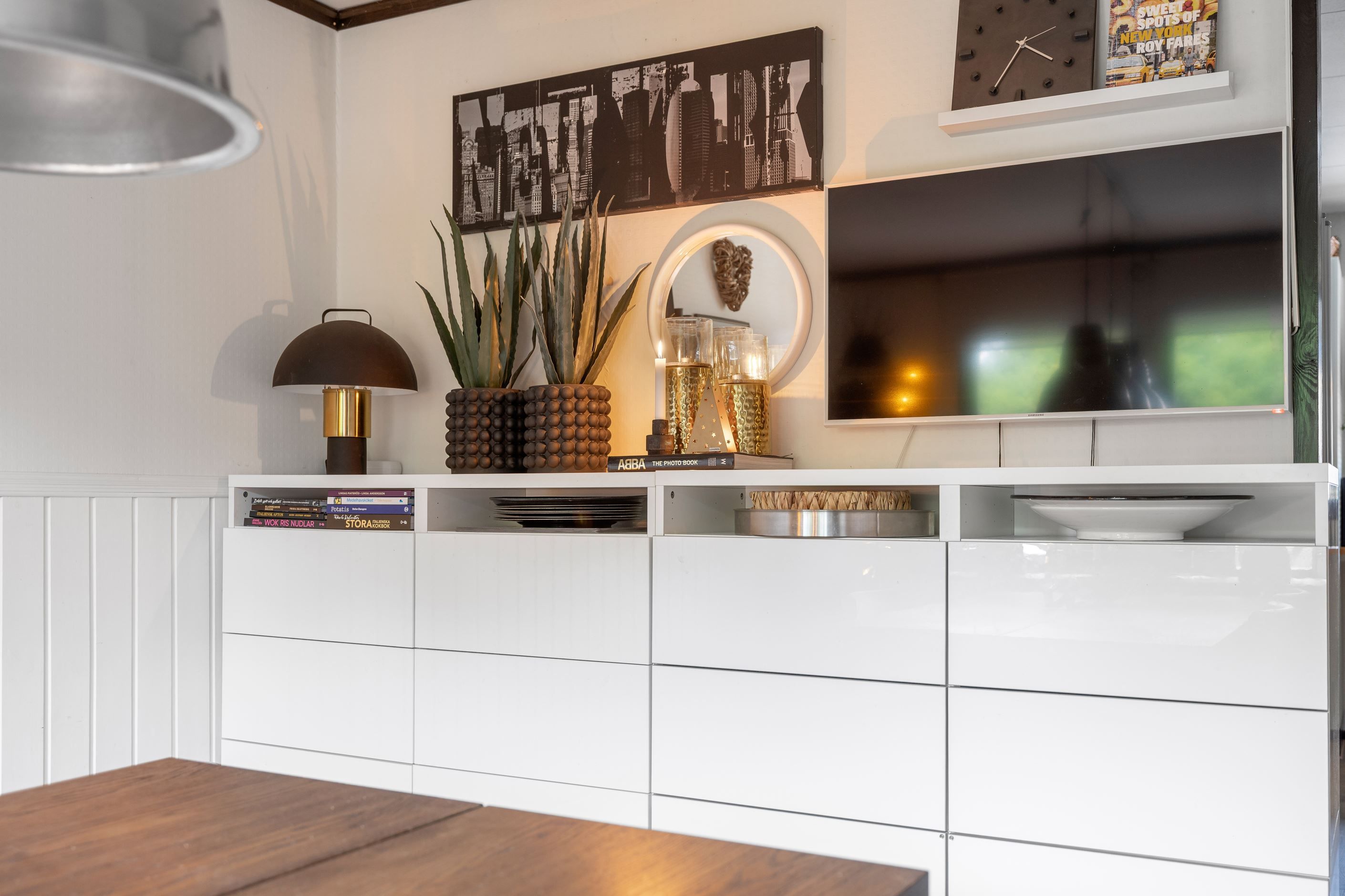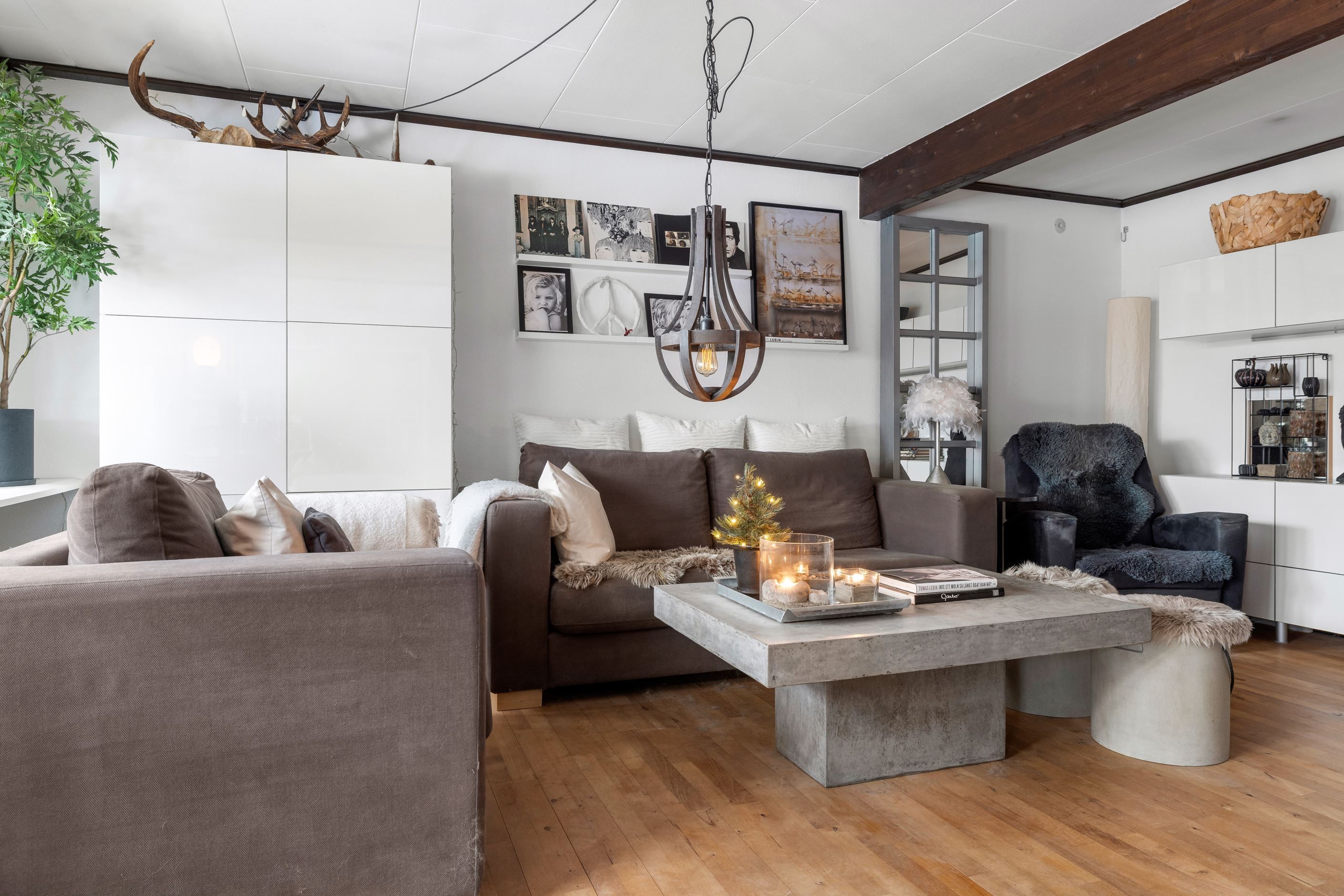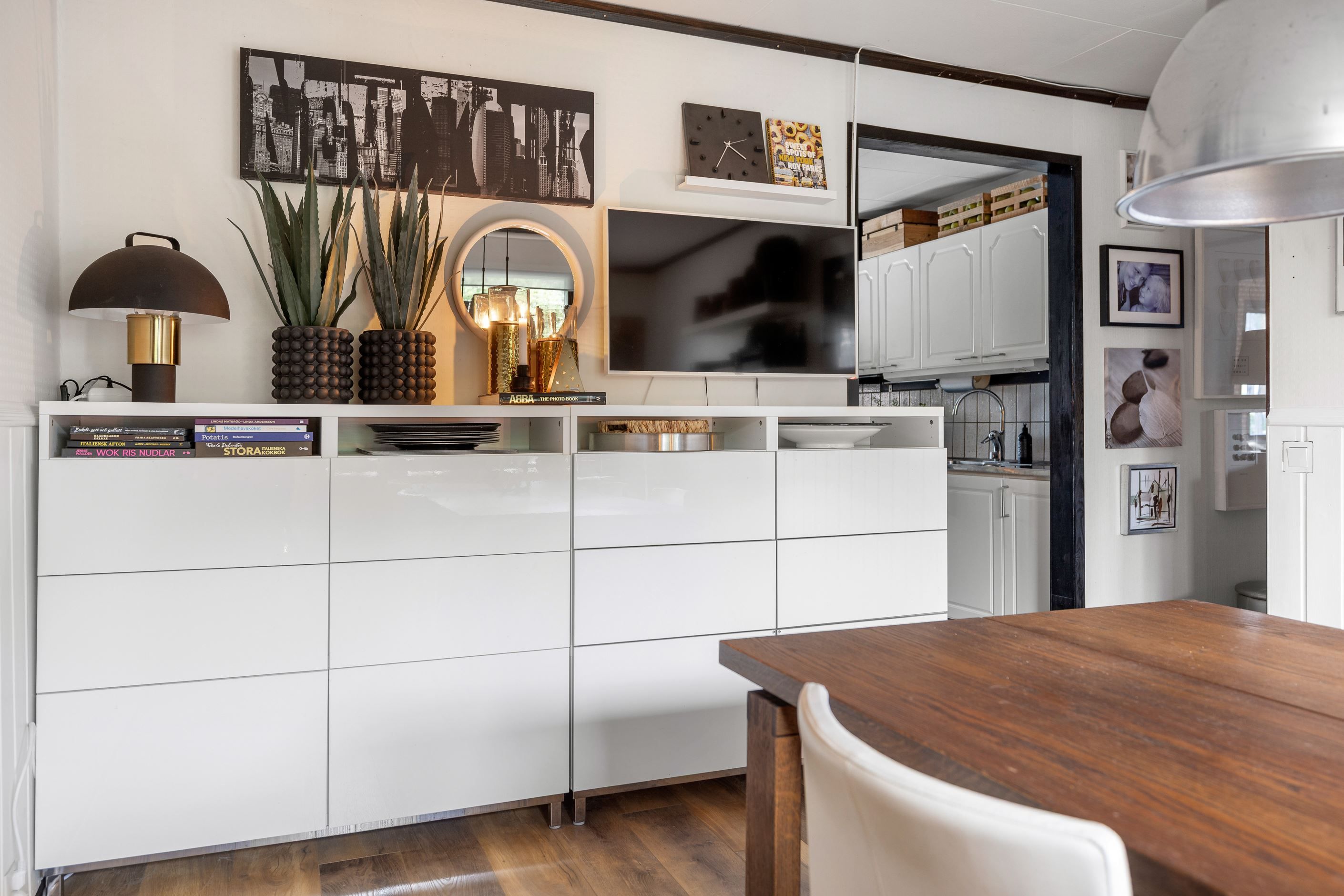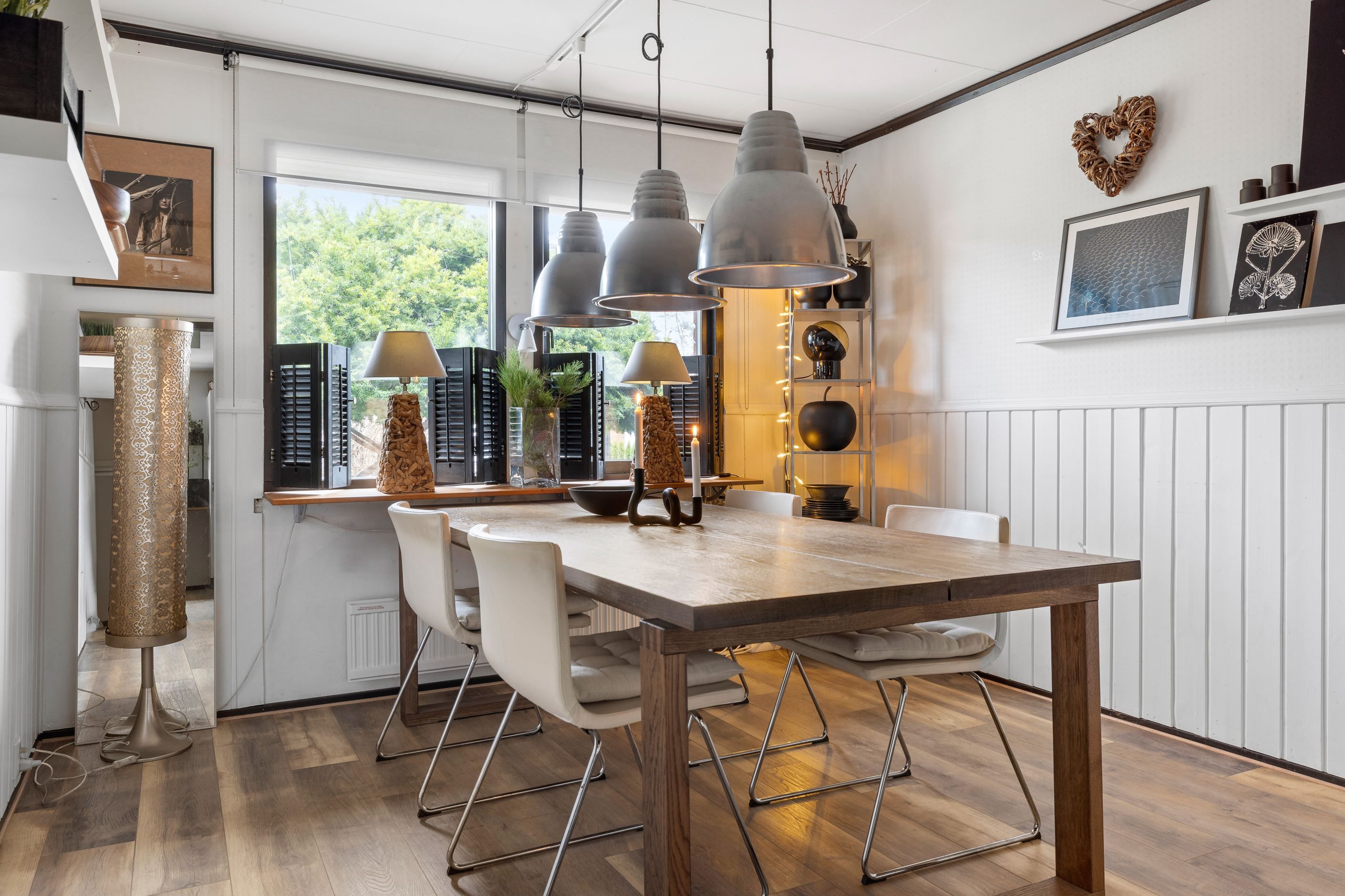 Inne möts du av en ljus och luftig planlösning med matsal med värmande braskamin i direkt anslutning till vardagsrummet. Här har nuvarande ägare öppnat upp mellanrummet och installerat en braskamin som skapar värme och trivsel. Tidigare var matsalen ett sovrum som man enkelt kan återskapa om behov finns. Vidare trevligt kök med intilliggande generös matplats.