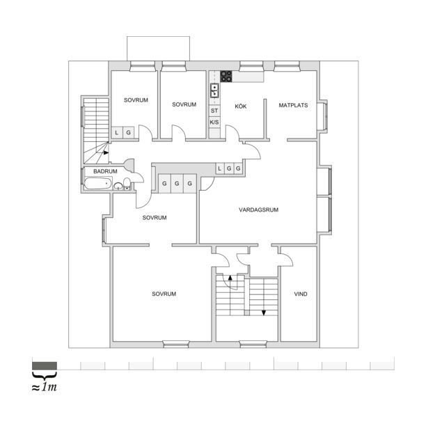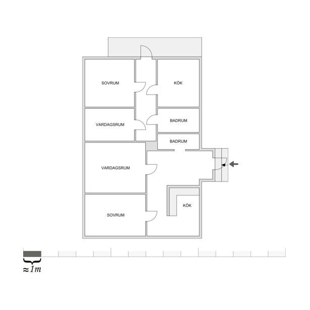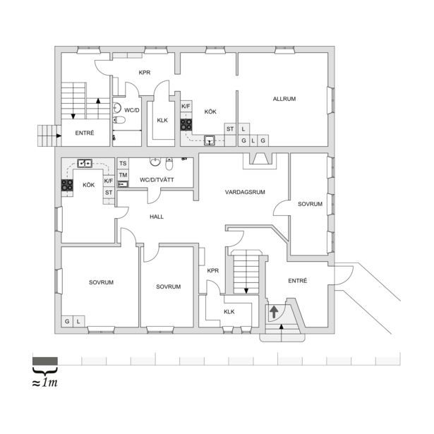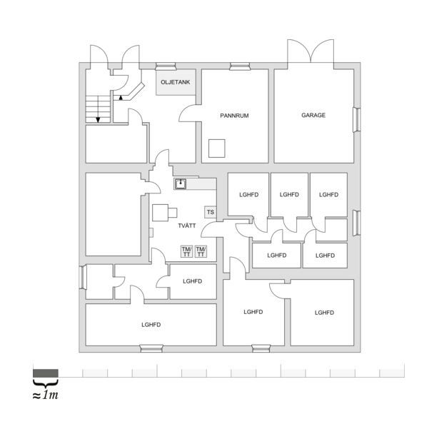 Planlösning: Fastigheten har tre separata entréer. Ingång C leder direkt till en bostad utan trapphus, medan den övre lägenheten i C-delen nås via B-uppgångens trappa. A-uppgången betjänar de äldre lägenheterna i huset.