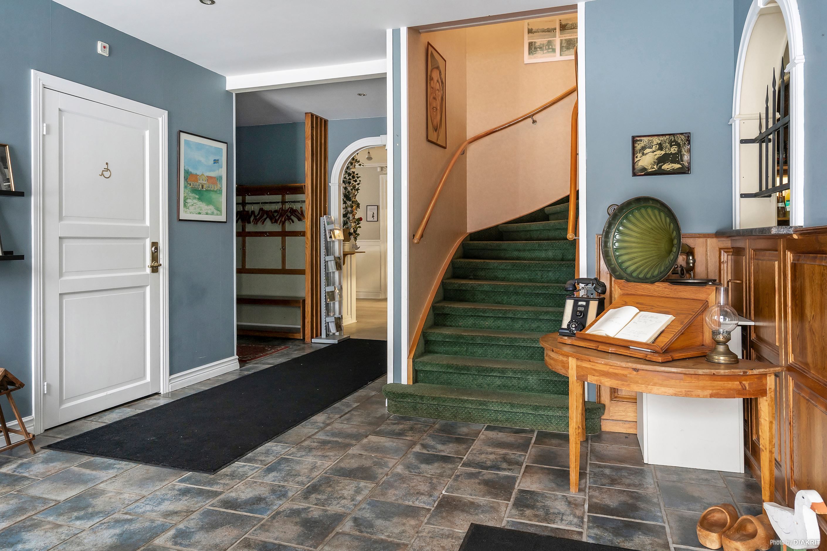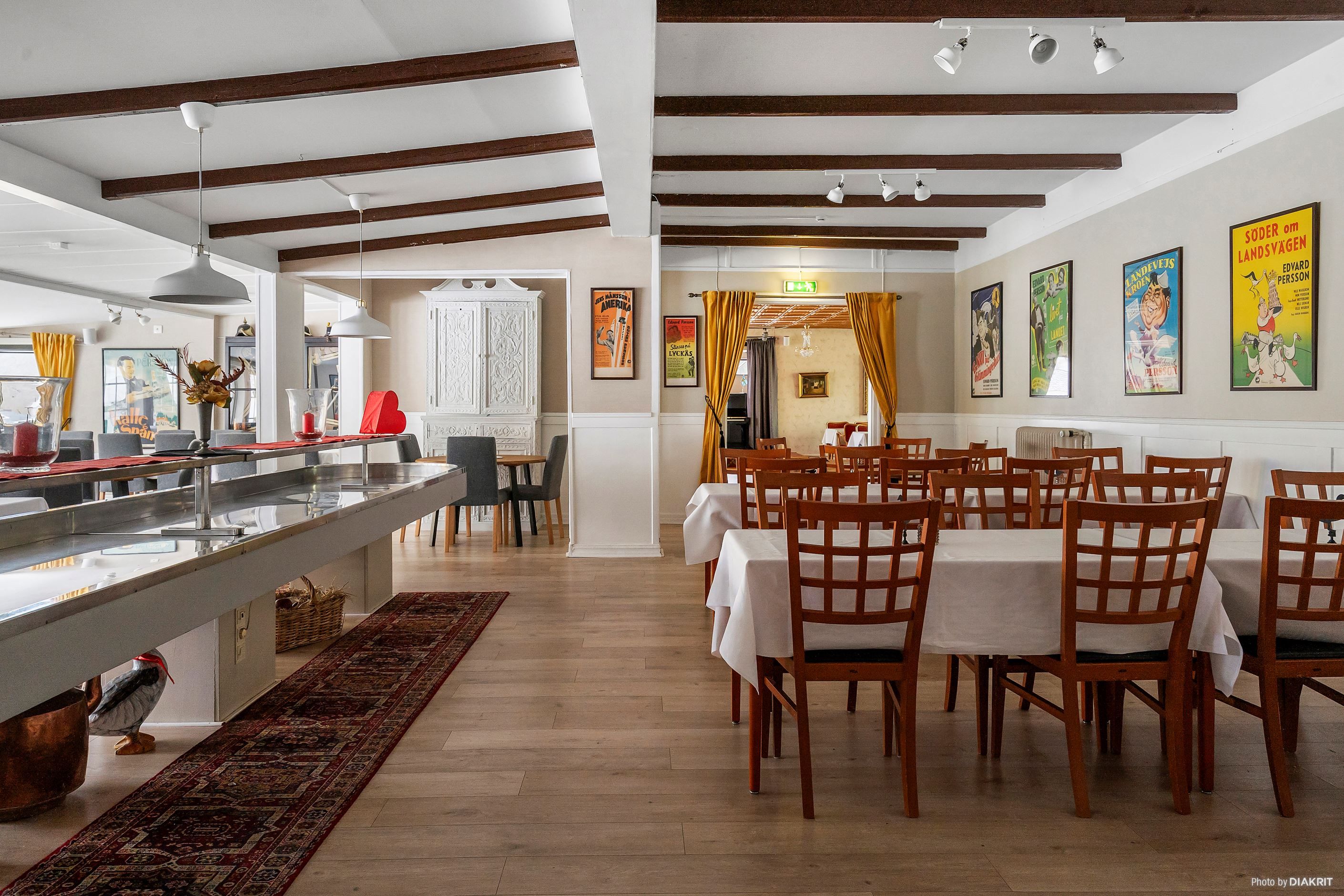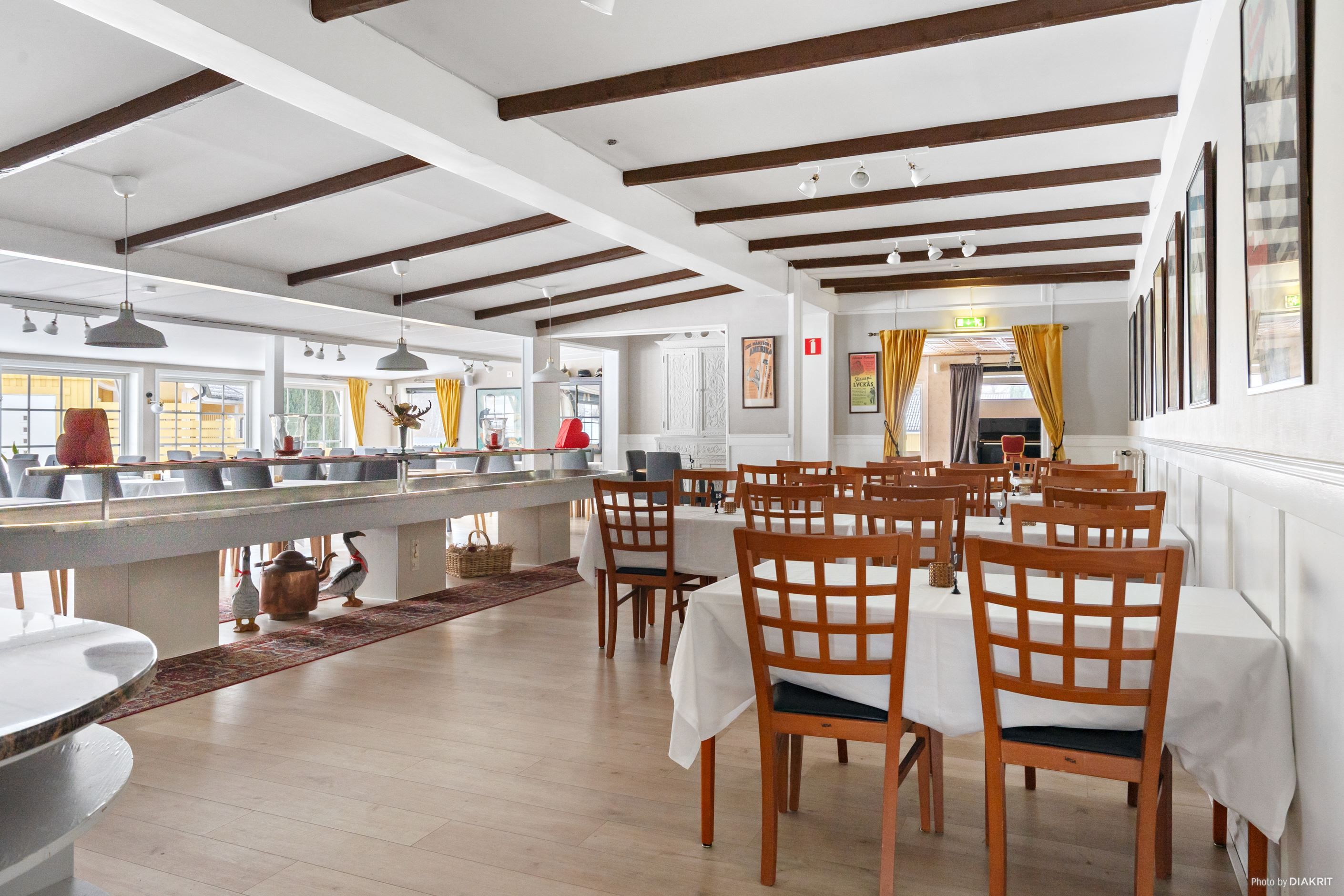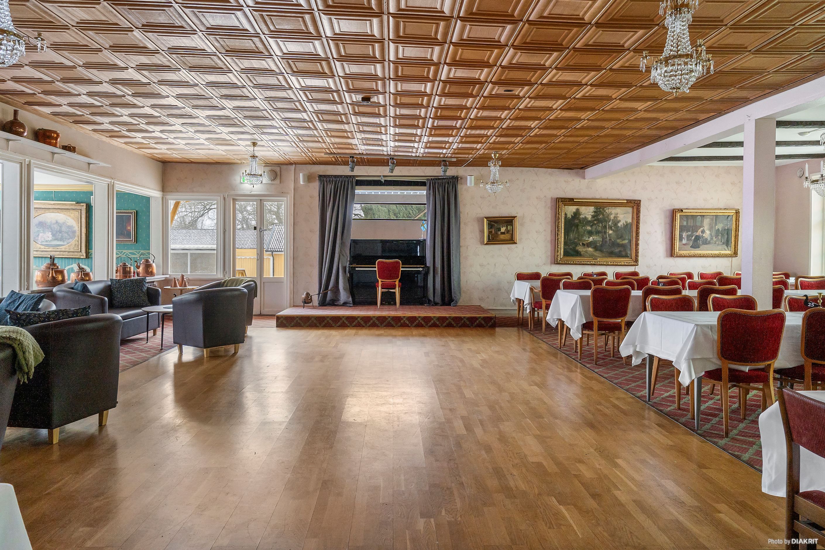 Gästgiveriet inrymmer en rymlig restaurangdel fördelad på tre matsalar med kapacitet för cirka 200 sittande gäster, kompletterad med ett välutrustat restaurangkök, renoverat kylrum samt frys med nytt aggregat, samt bar med intilliggande finrum. På ovanvåningen finns konferensavdelning med tre konferensrum, kontor samt sju hotellrum. Källarplanet erbjuder personalutrymmen, omklädningsrum, tvättstuga, pannrum samt förråd.