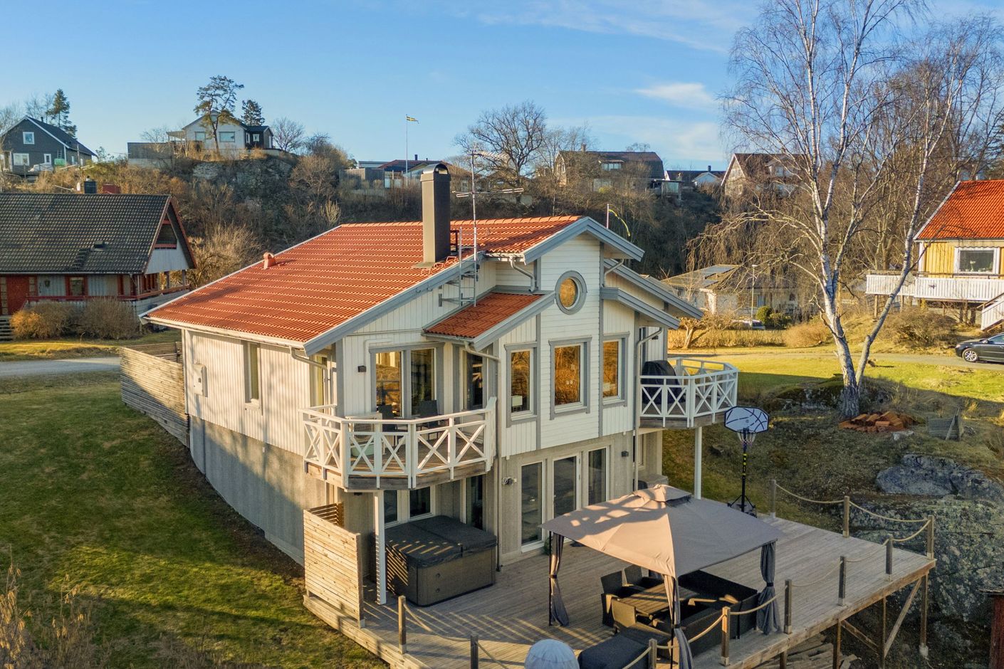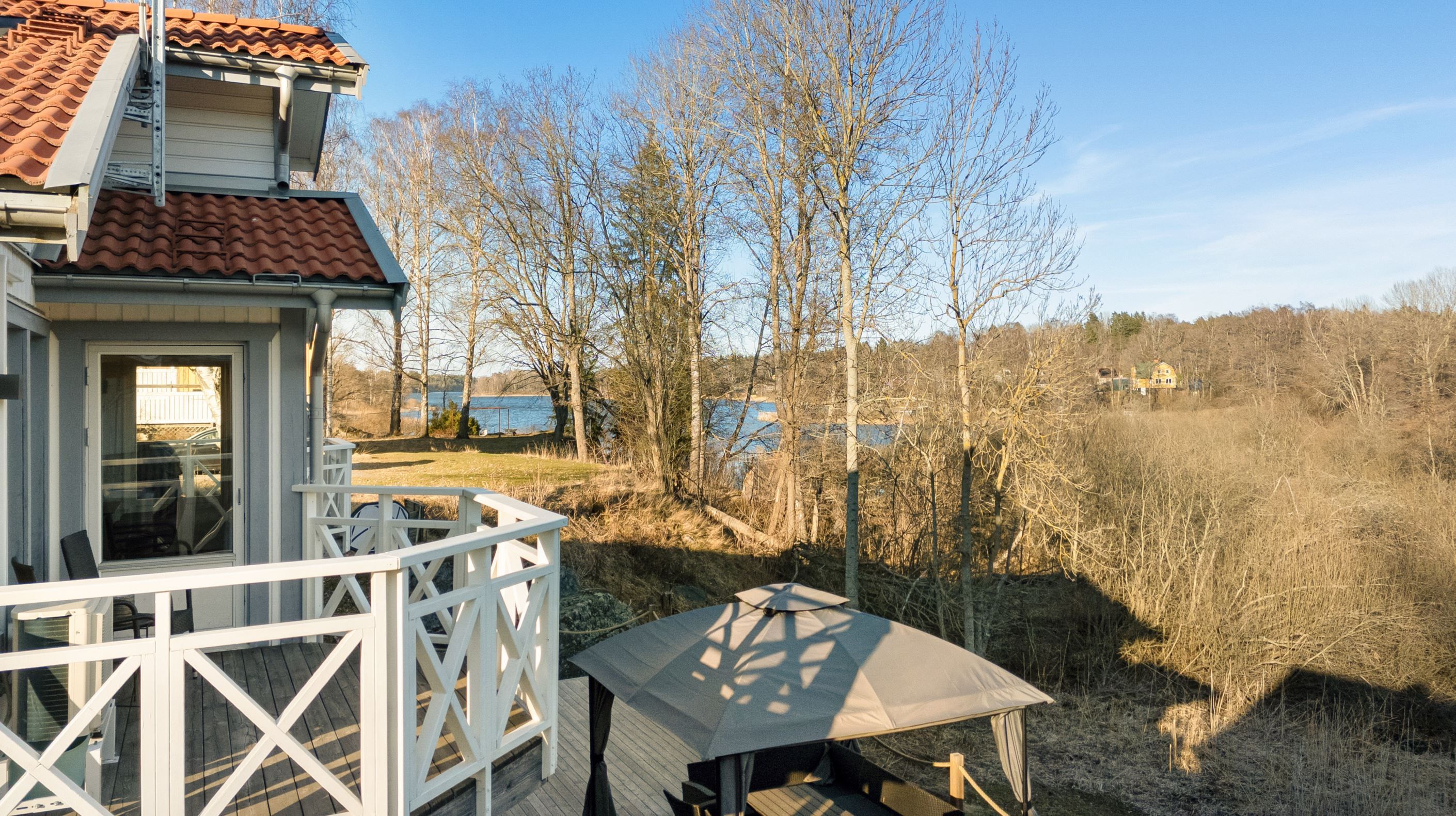 Utemiljön är en naturlig förlängning av huset. Altaner på fram- och baksida om sammanlagt cirka 80 kvm följer solen från morgon till kväll, och från balkongerna njuter du av utsikten över Drevviken. På den trädäckade altanen på baksidan finns dessutom ett spabad som ger extra komfort året om.