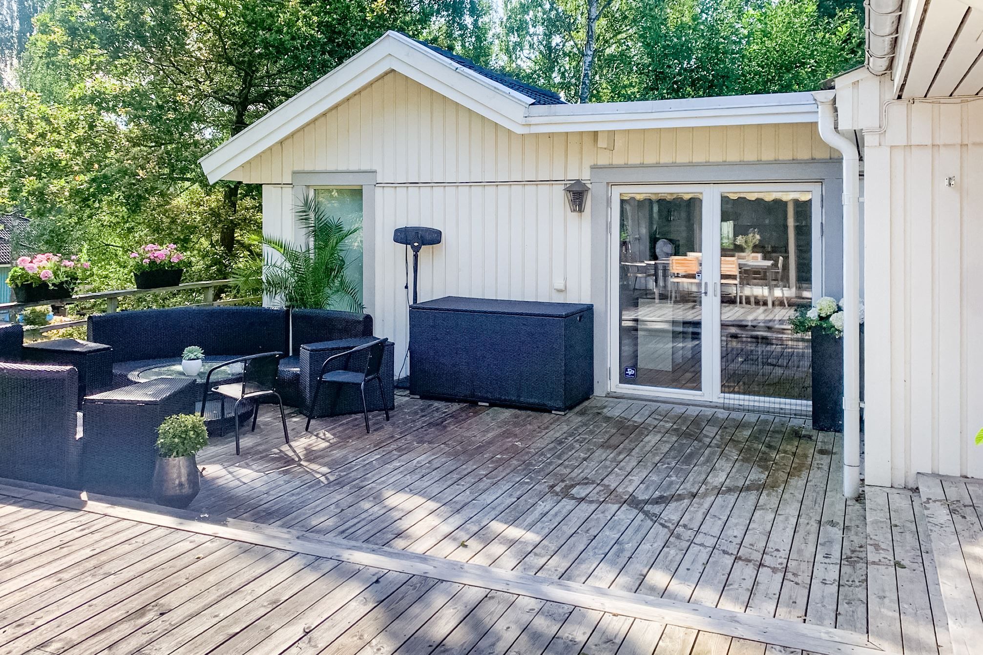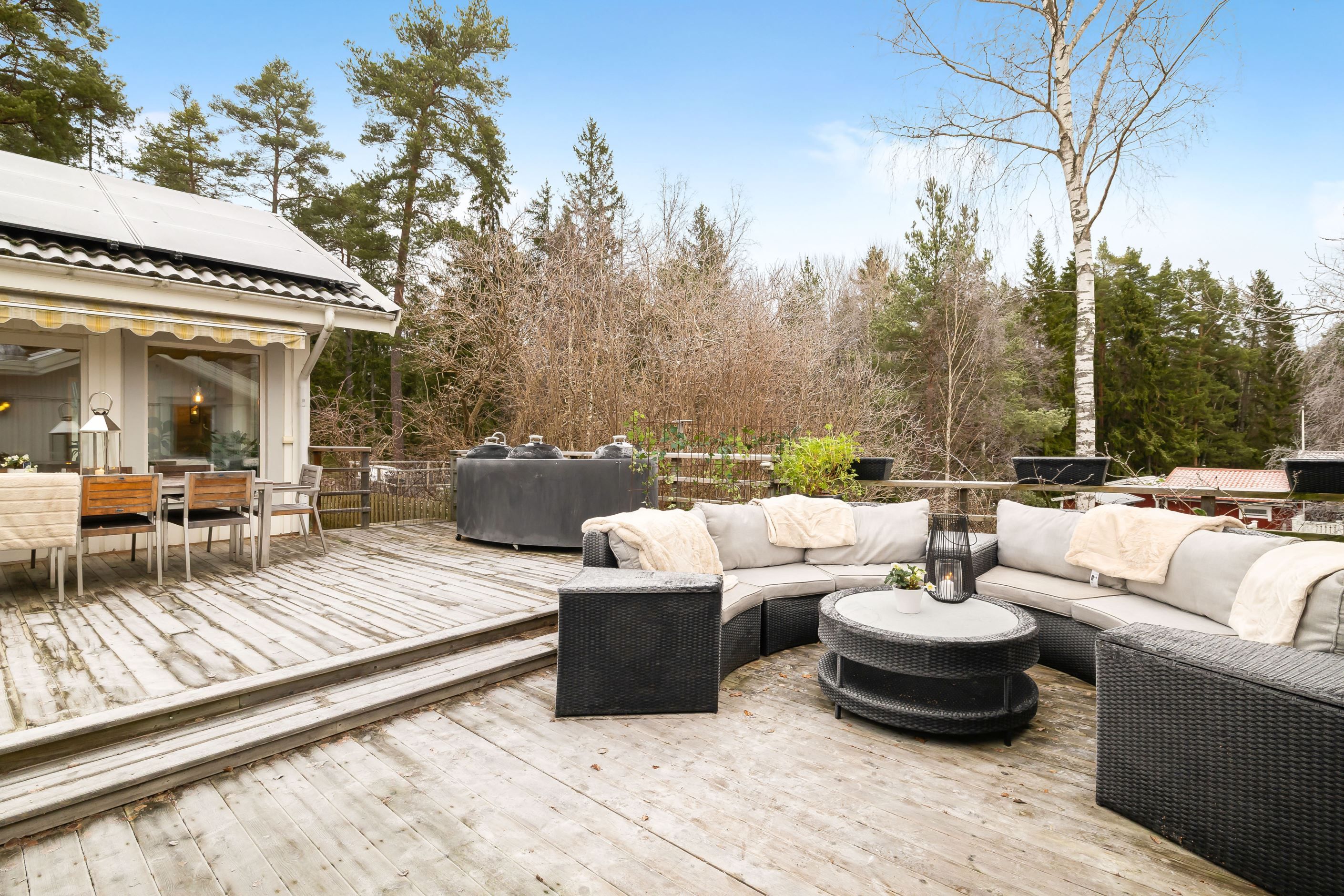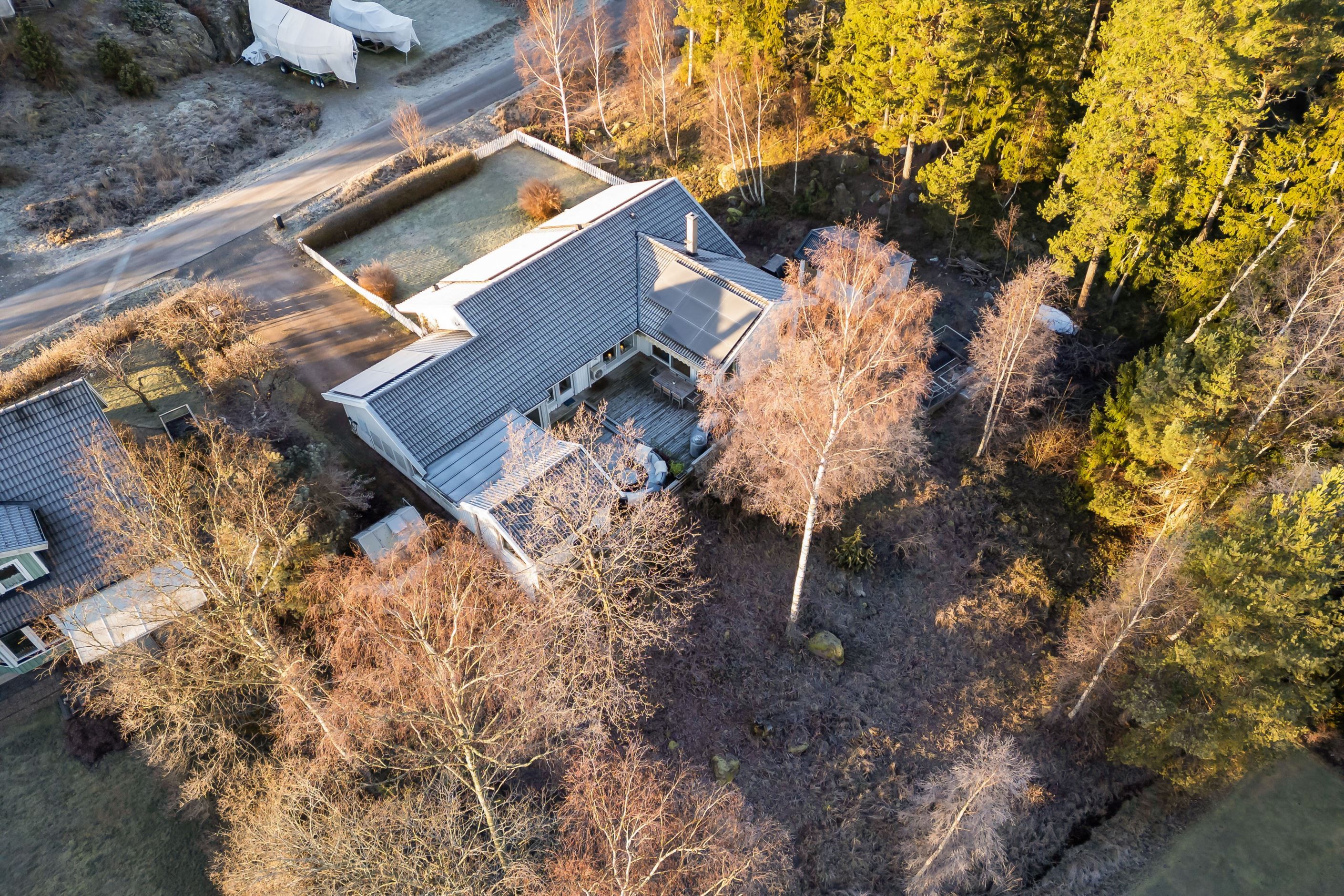 Den plana, inhägnade gräsmattan passar utmärkt för lek, spel, hundar och avkoppling. Den stora öppna altanen blir husets hjärta under sommarhalvåret. På tomten finns dessutom både förråd och vedförråd som ger gott om plats för förvaring.