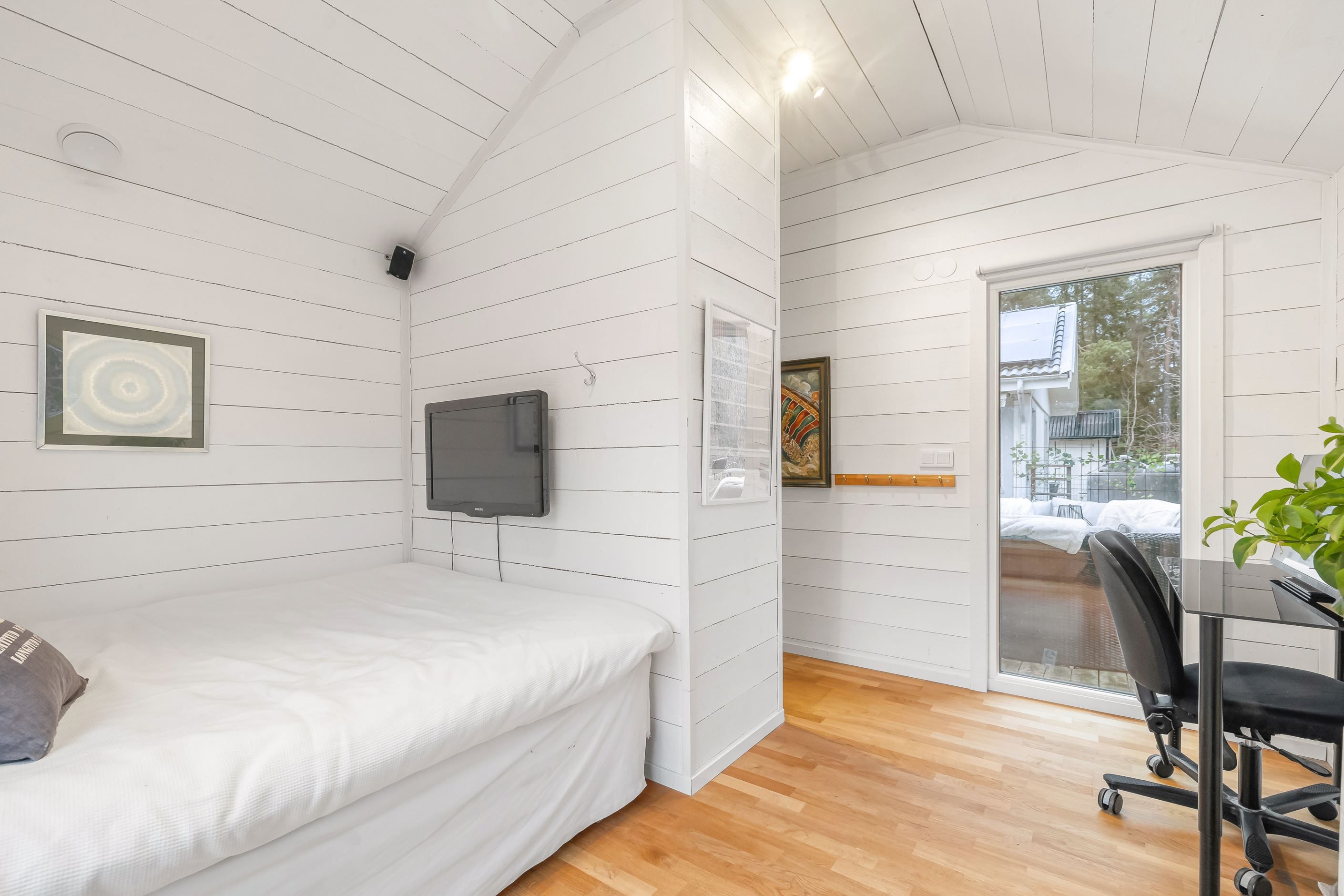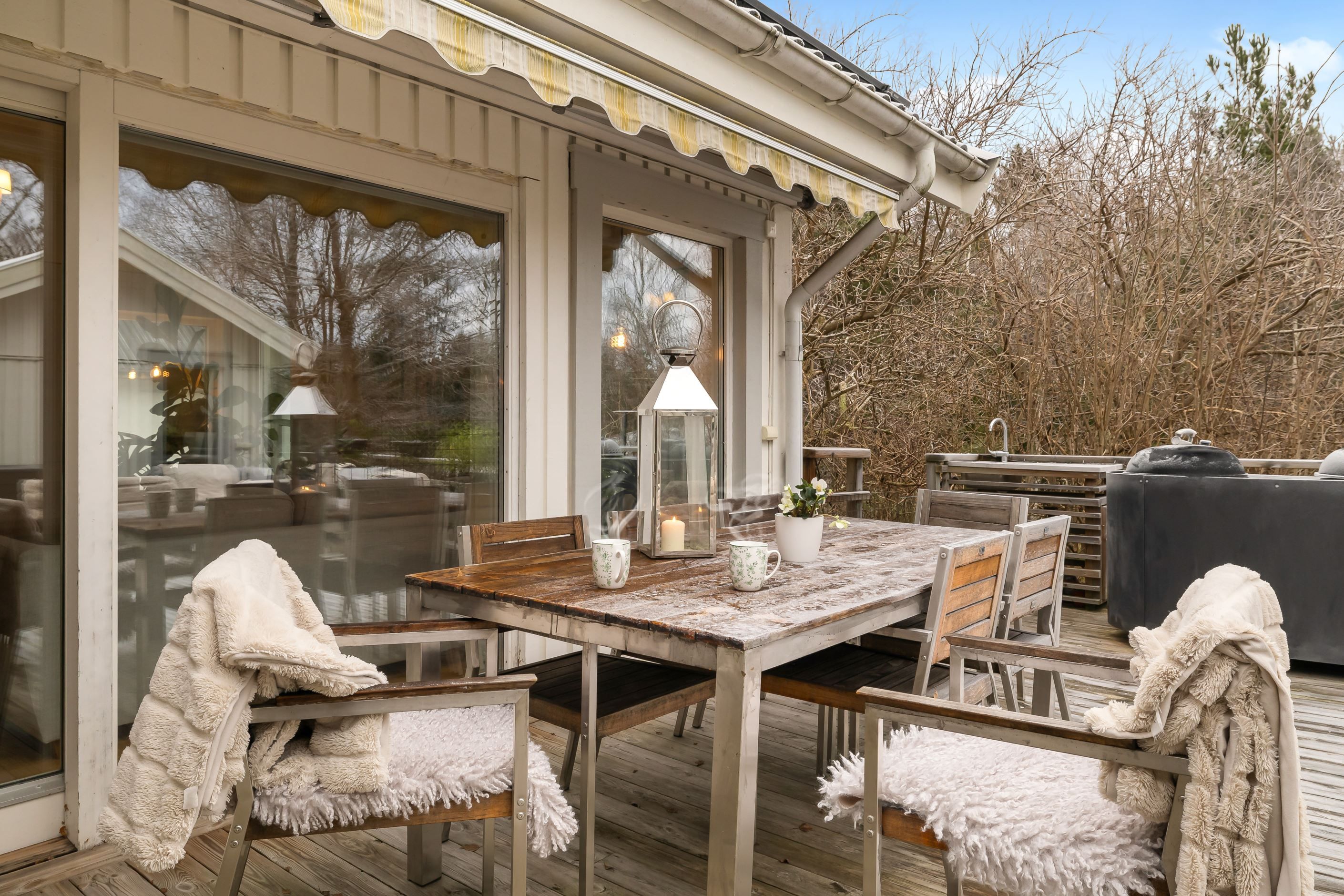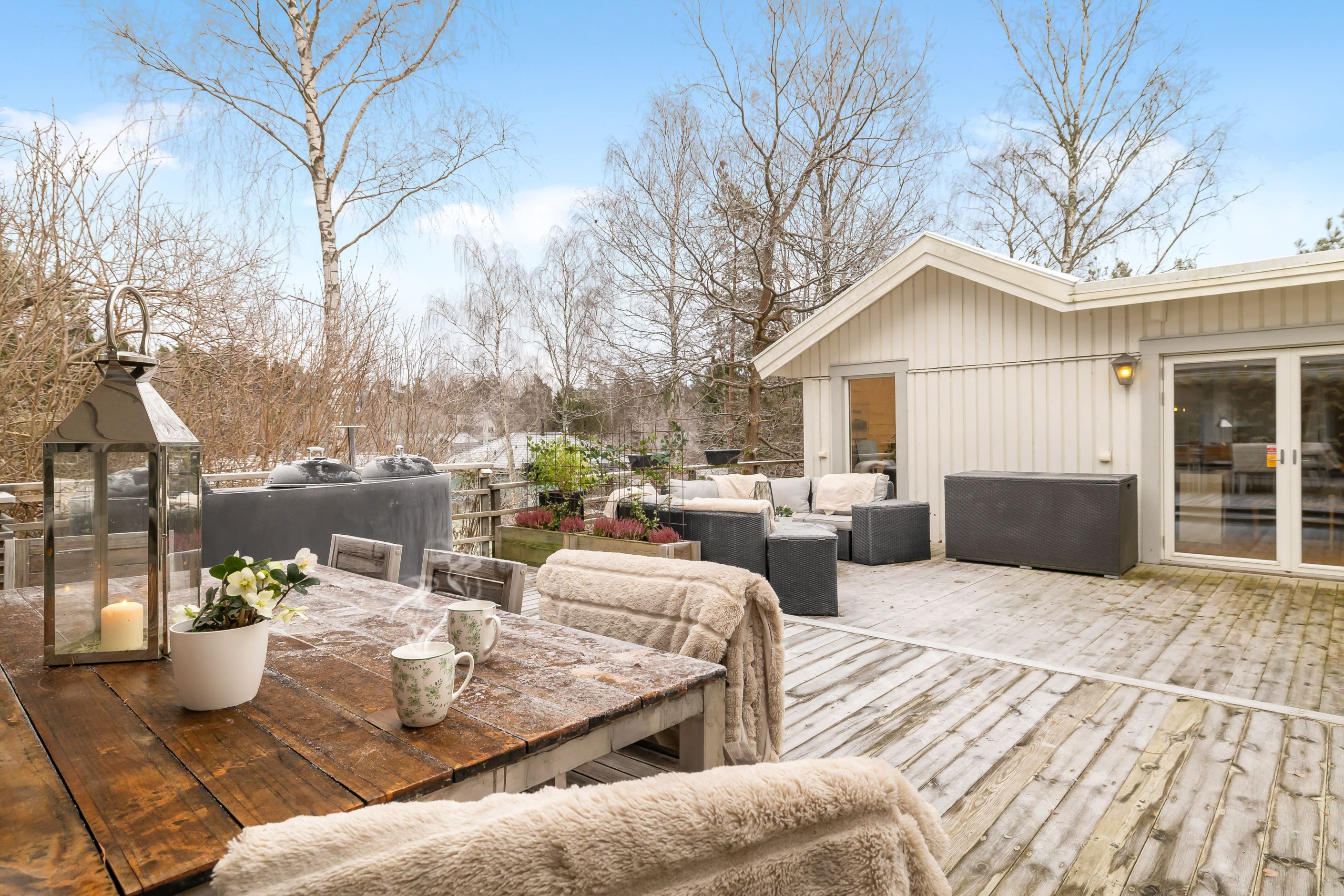 Den plana, inhägnade gräsmattan passar utmärkt för lek, spel, hundar och avkoppling. Den stora öppna altanen blir husets hjärta under sommarhalvåret. På tomten finns dessutom både förråd och vedförråd som ger gott om plats för förvaring.