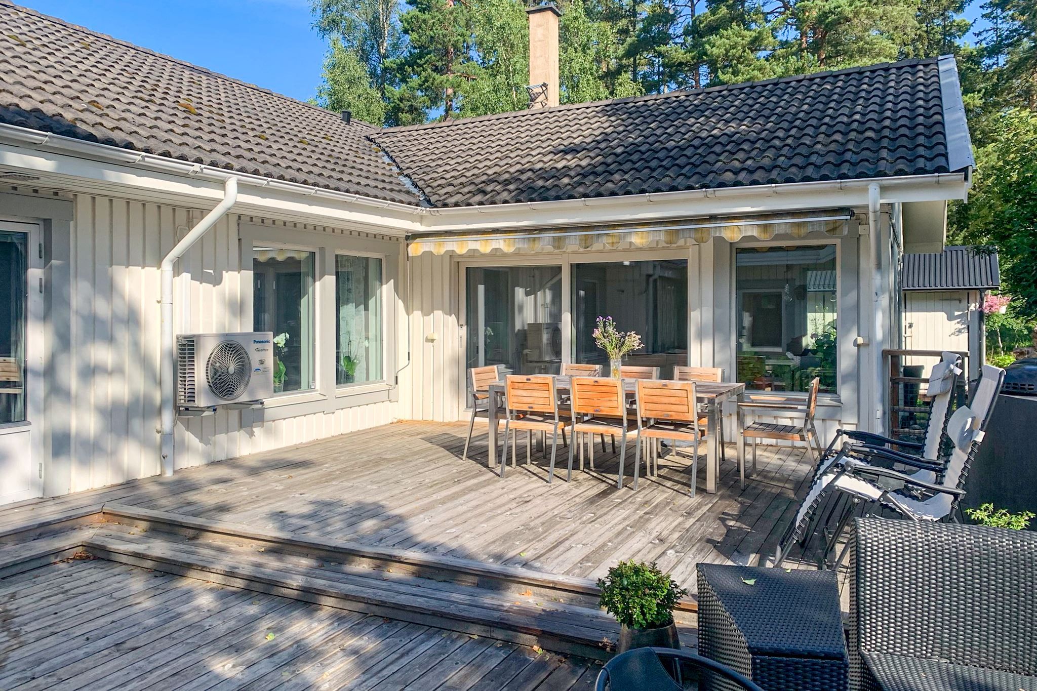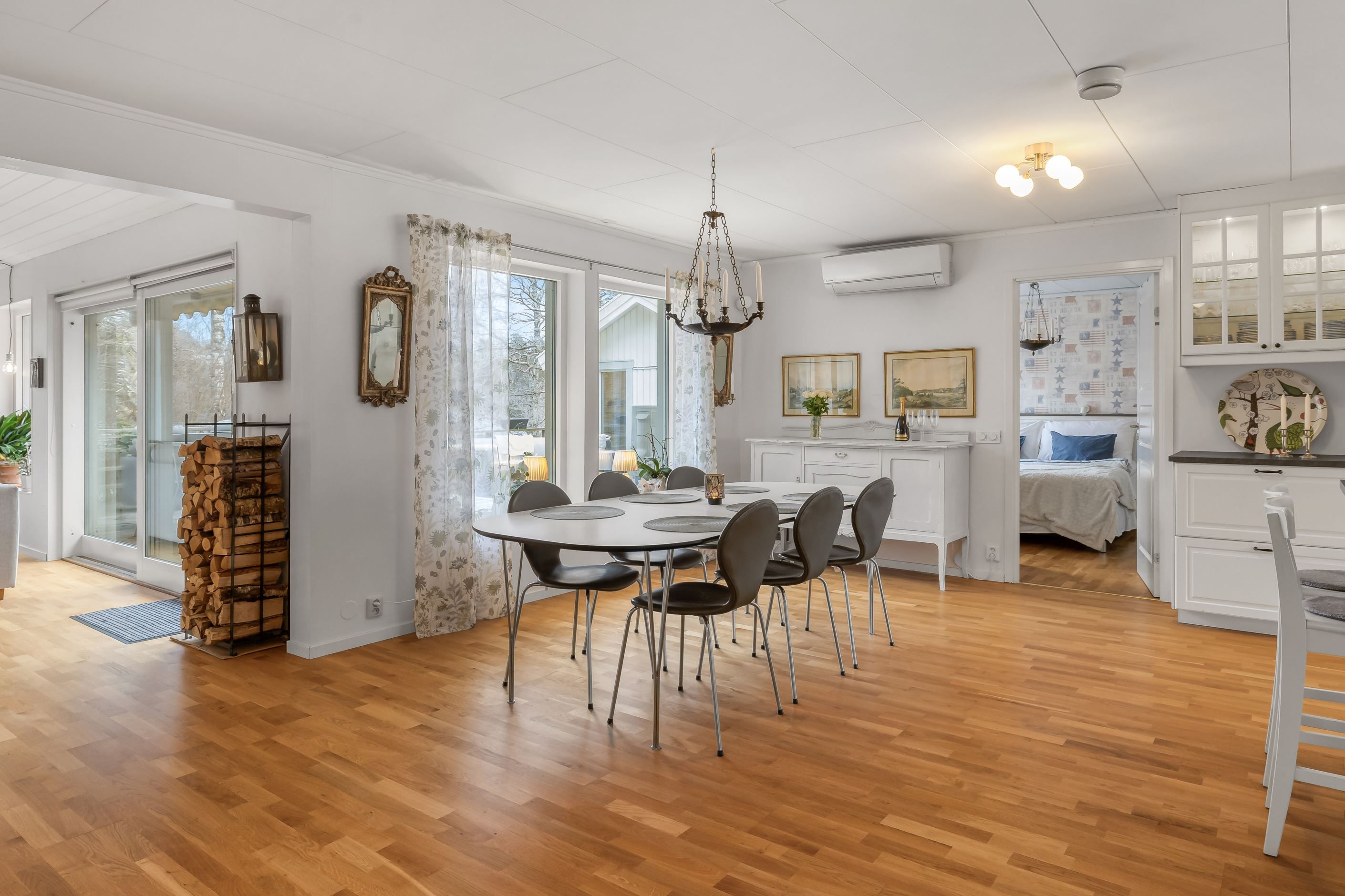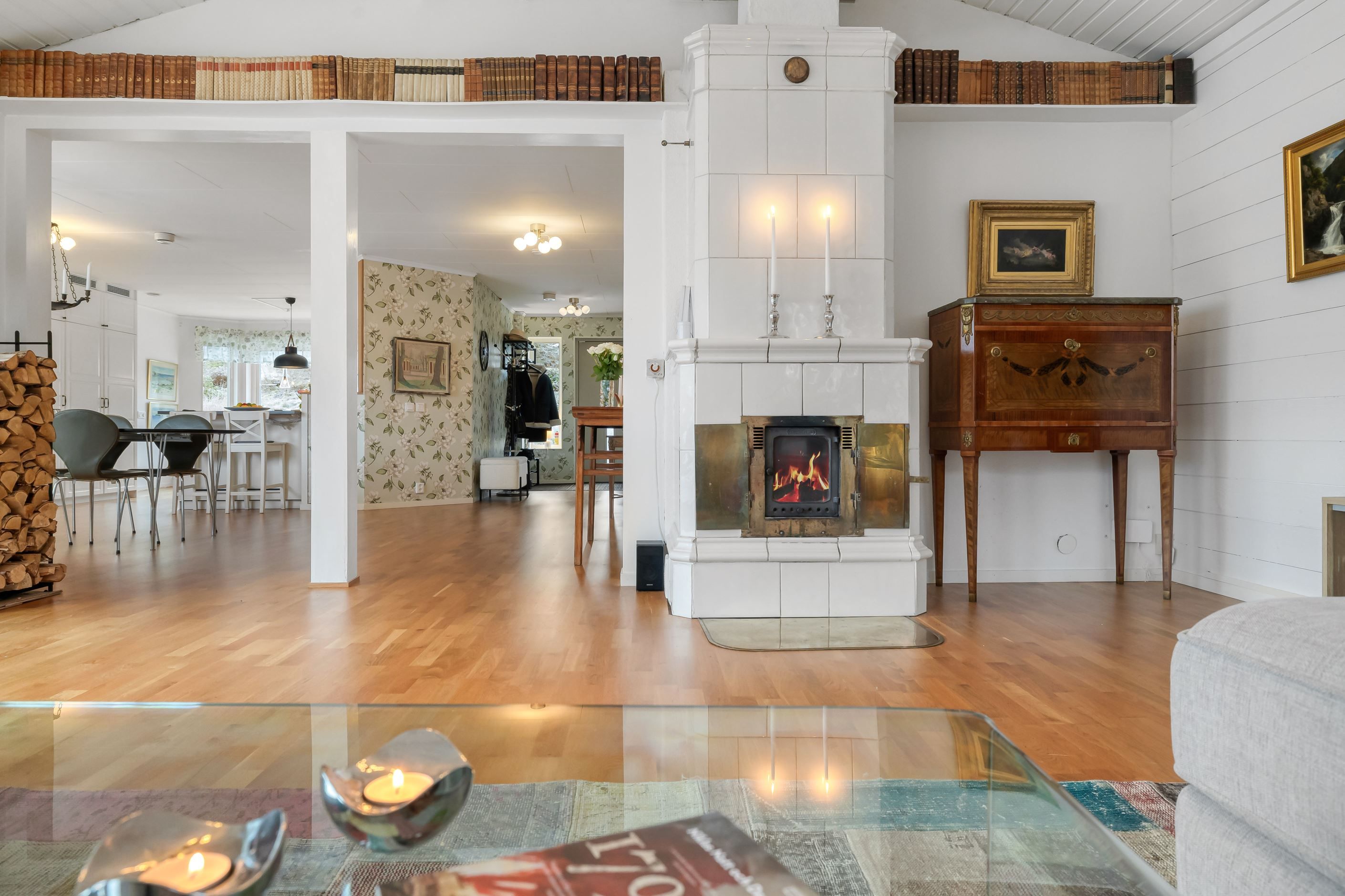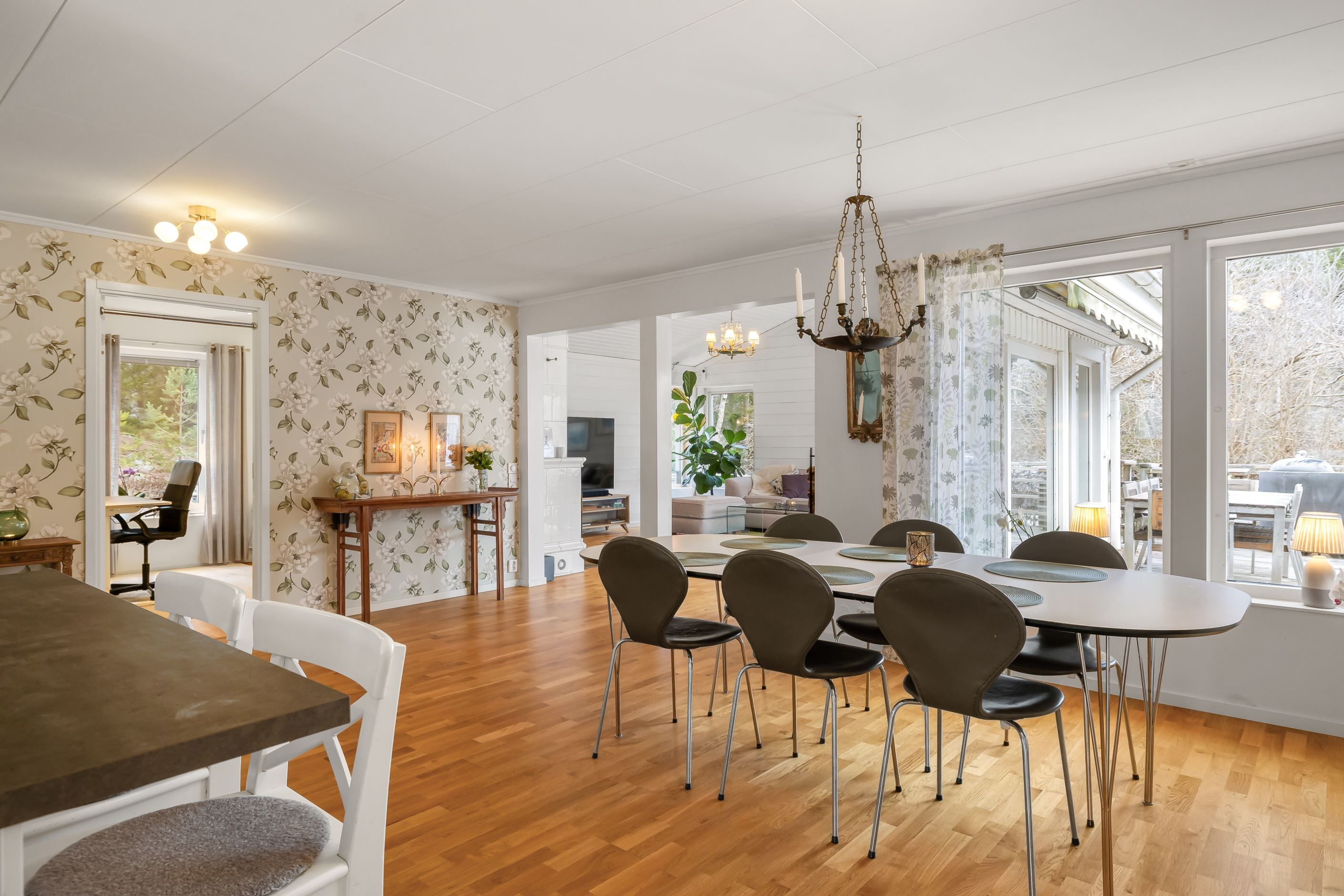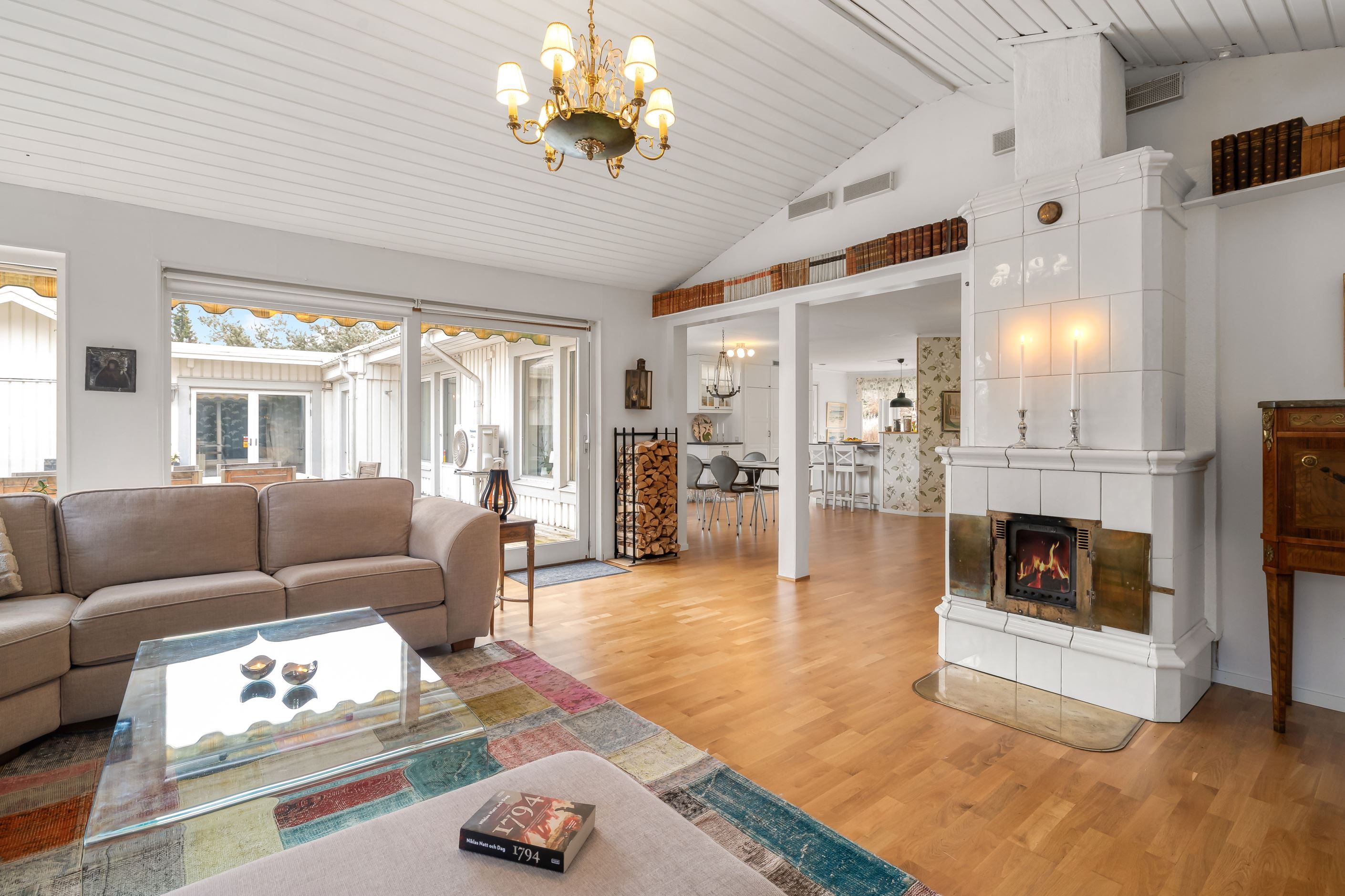 Huset erbjuder hela 7 sovrum, 3 badrum, allrum samt öppen planlösning mellan kök och vardagsrum, som har vacker kakelugn och härlig takhöjd – ett socialt och välplanerat hem där både vardag och fest får plats. Den stora samvaroytan är perfekt för underbara middagar, sommarkvällar och stora fester med familj och vänner.