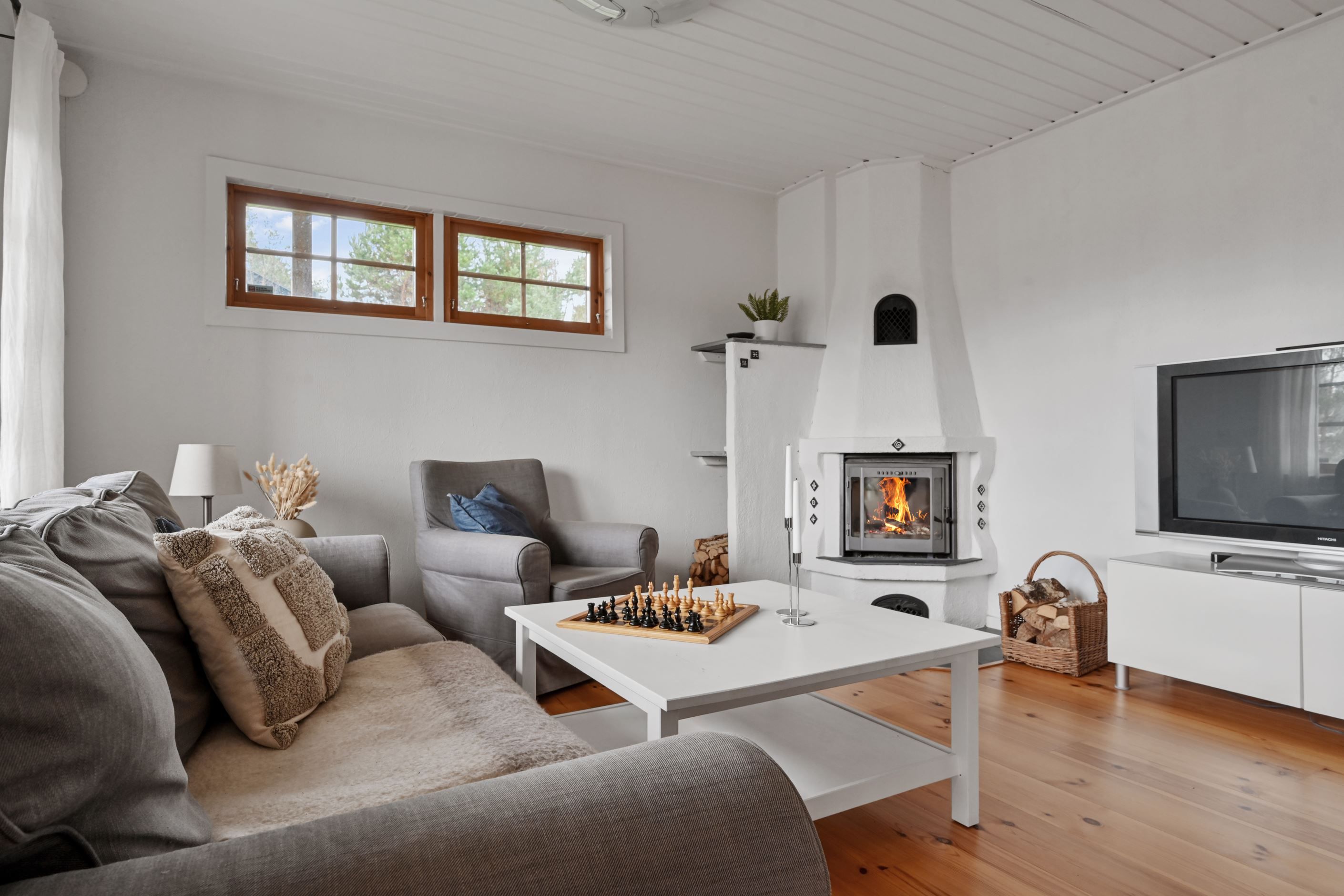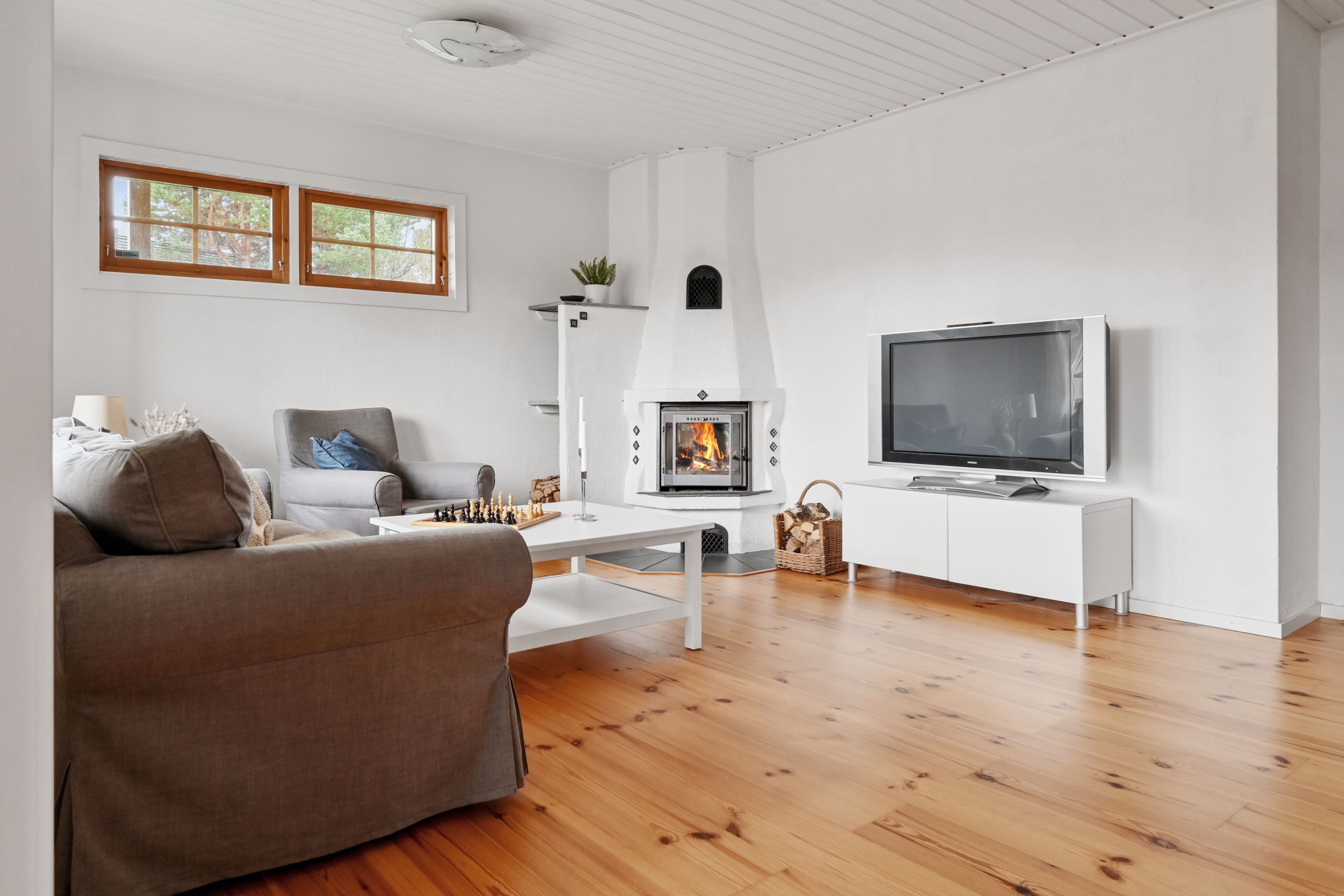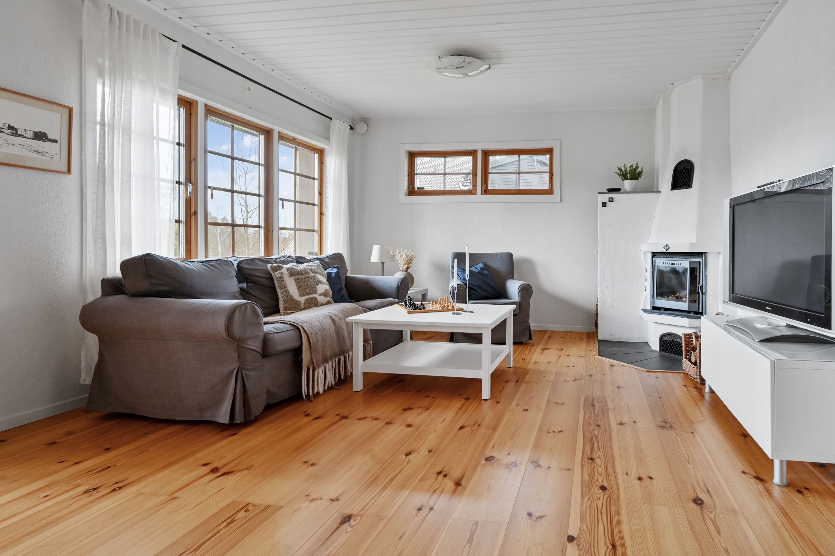 I ett av husets allrum skapas en varm och ombonad känsla tack vare den öppna spisen med insatskassett – en självklar samlingspunkt under årets svalare månader. Bostaden rymmer idag tre sovrum med goda möjligheter att skapa fler vid behov, vilket ger flexibilitet för den växande familjen eller för dig som önskar hemmakontor eller gästrum.