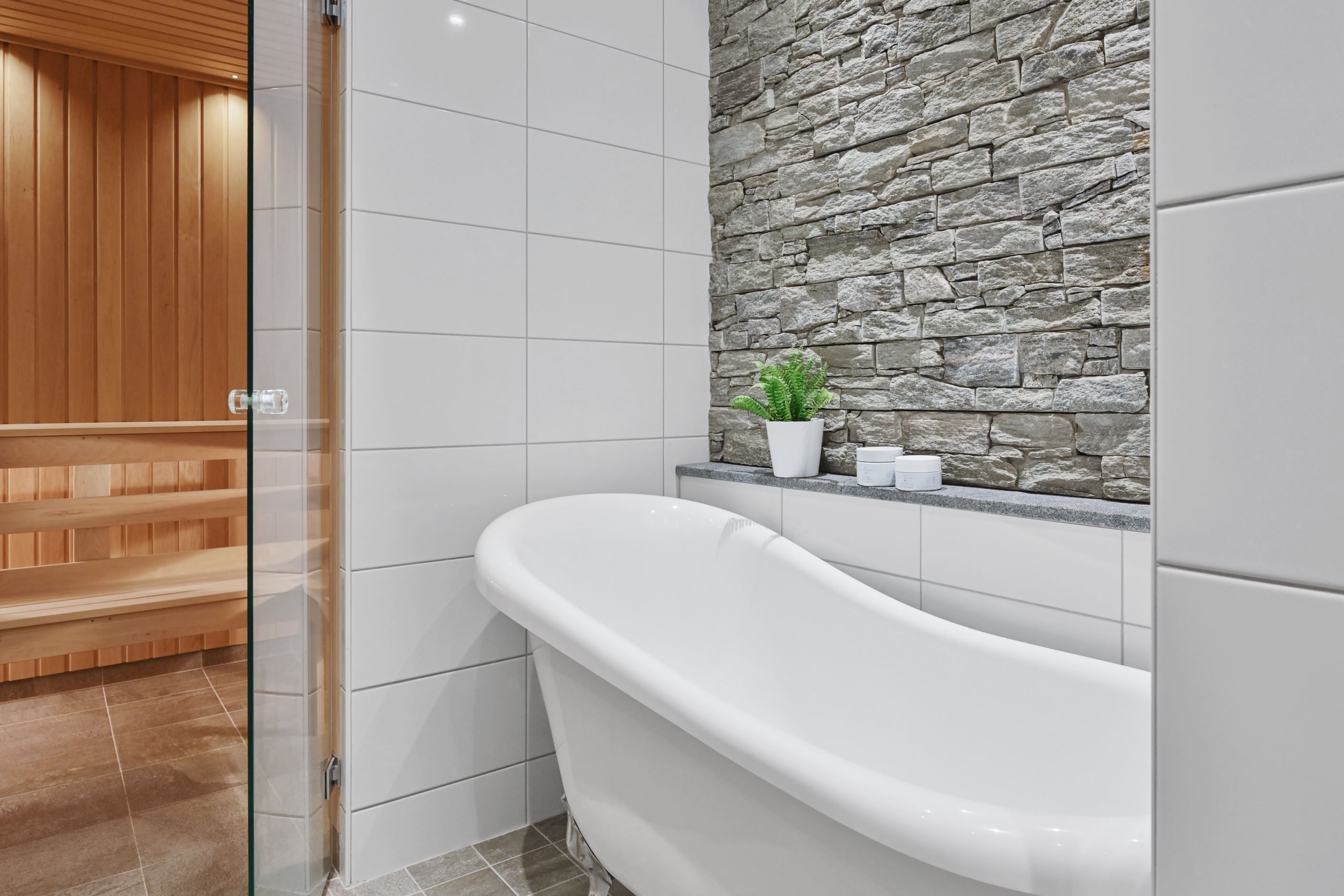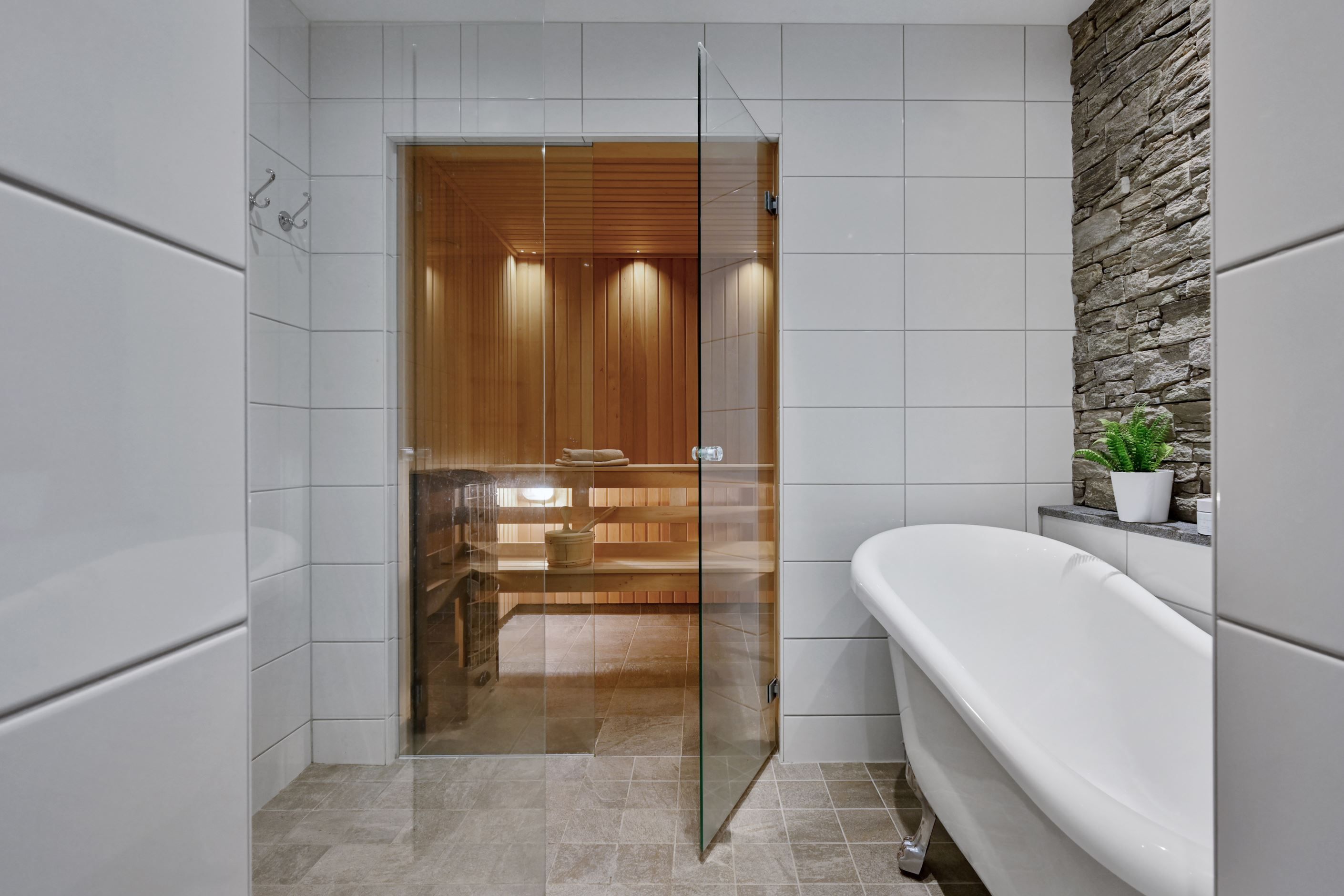 Spa badrum med badkar, dusch och bastu