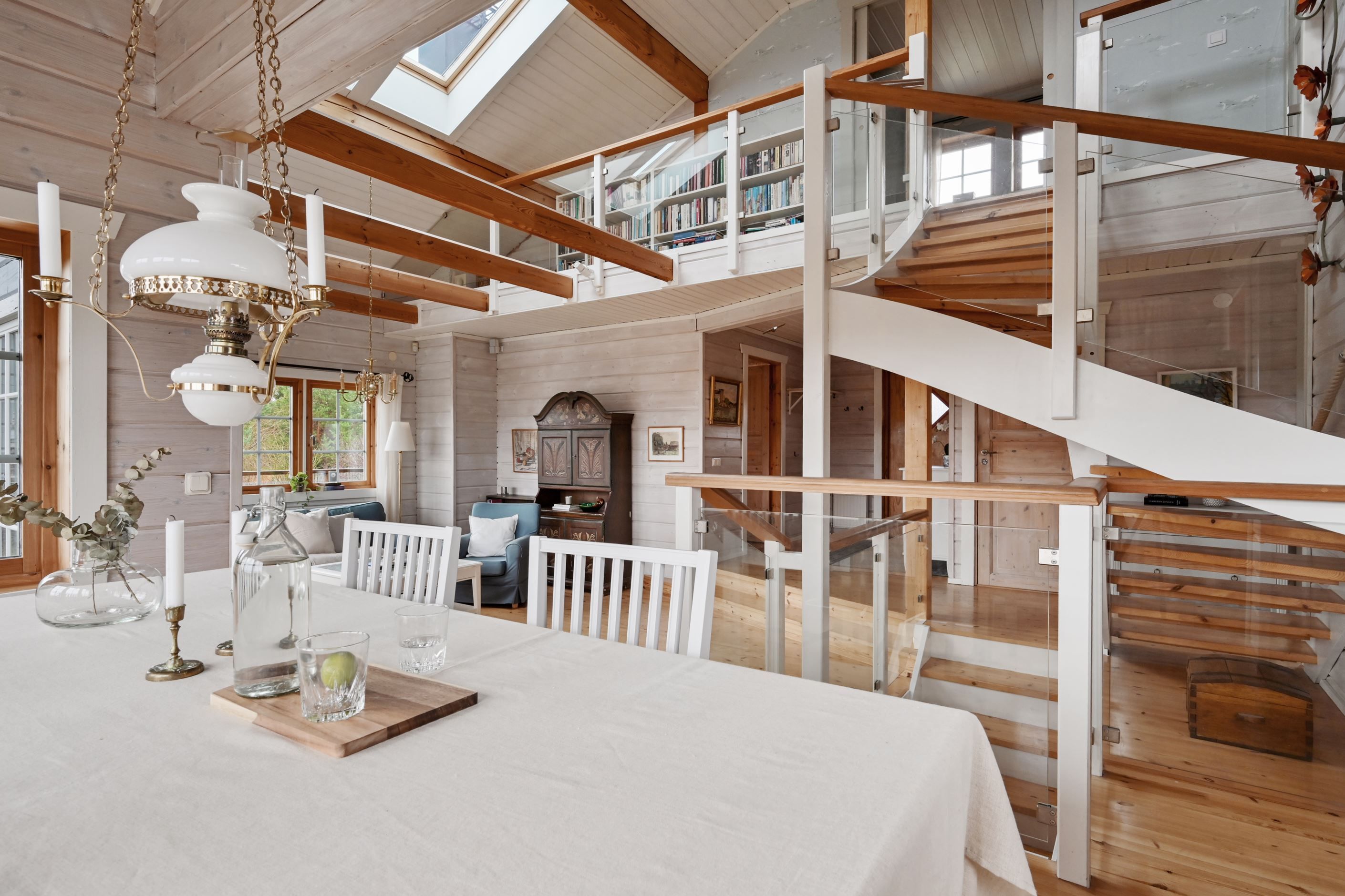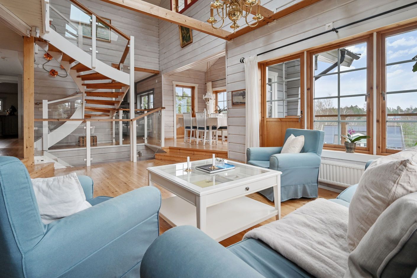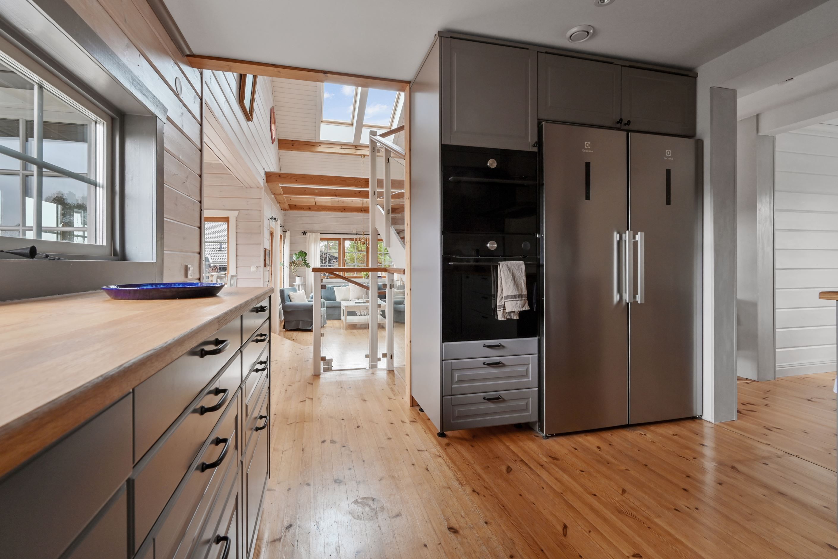 Huset bjuder på öppna och sociala ytor där kök och vardagsrum möts i en inbjudande planlösning. Det stilrena köket renoverades 2022 och är utformat för både matlagning och umgänge. Vardagsrummet präglas av hög takhöjd och ett härligt ljusinsläpp som skapar en luftig och trivsam atmosfär. Här finns gott om plats för större sällskap och två naturliga matplatser som gör hemmet perfekt för både familjeliv och middagar med vänner.