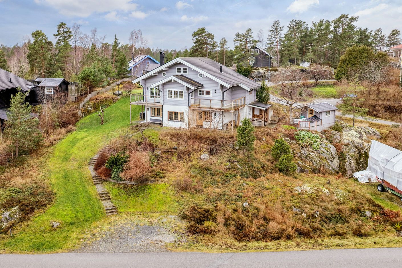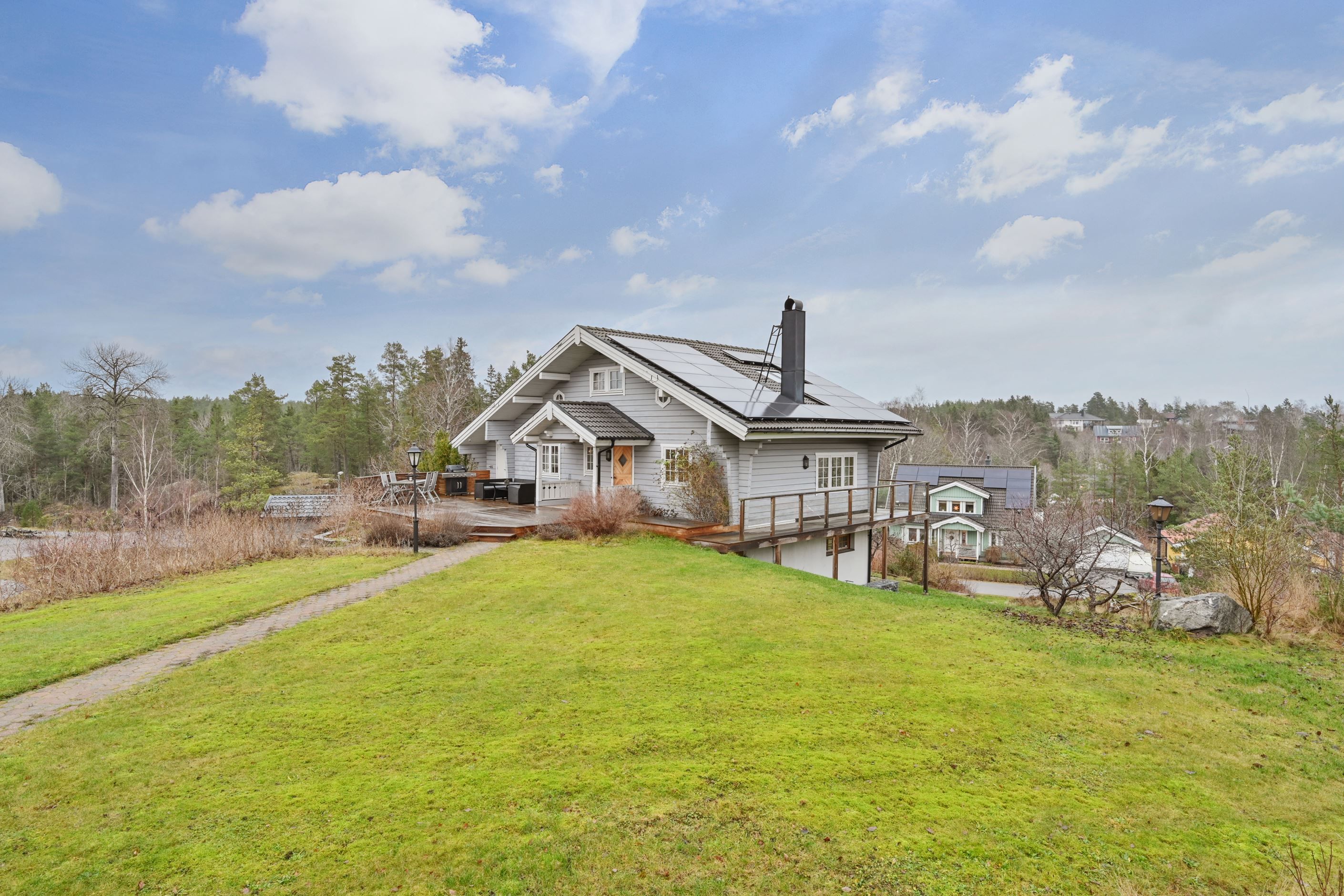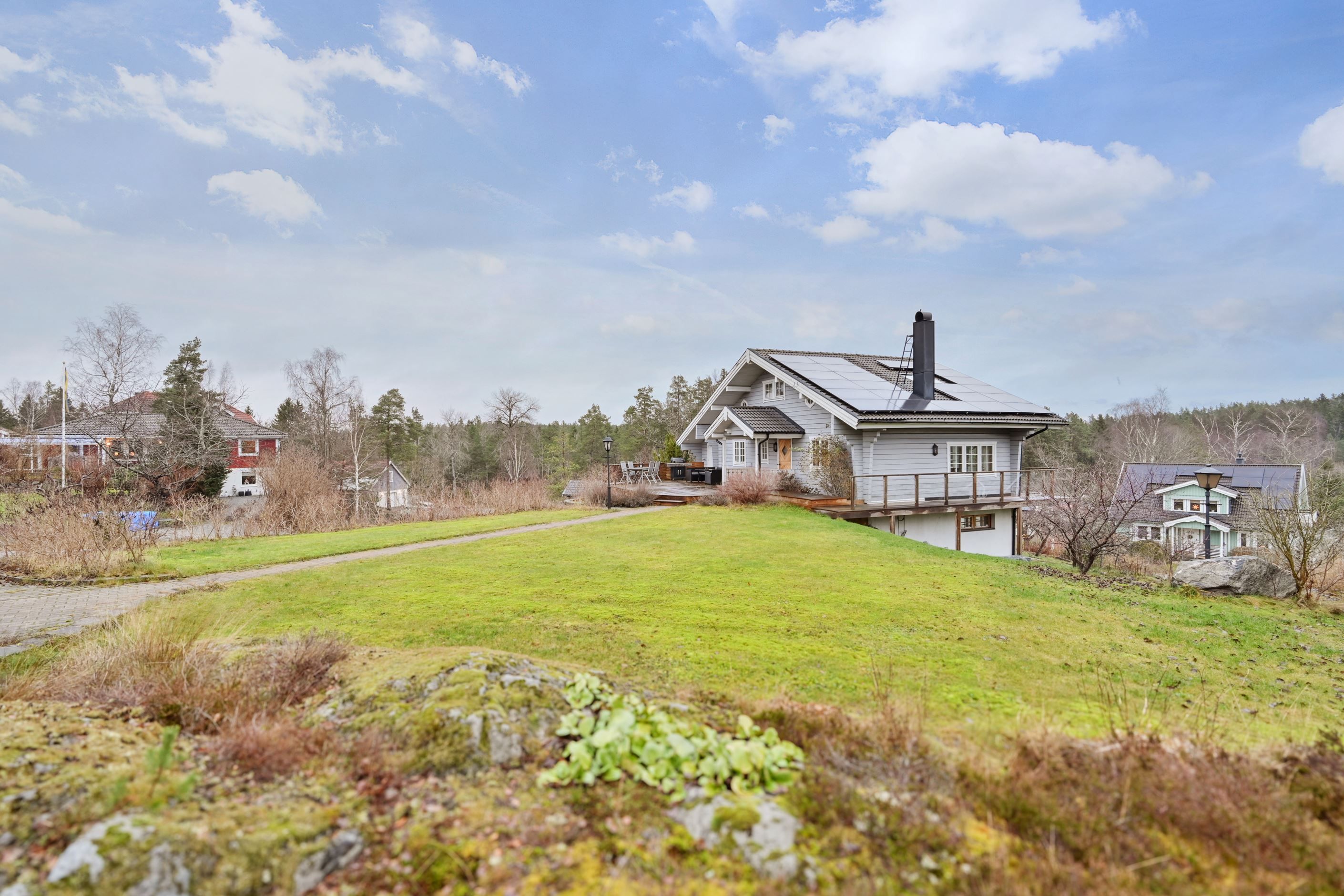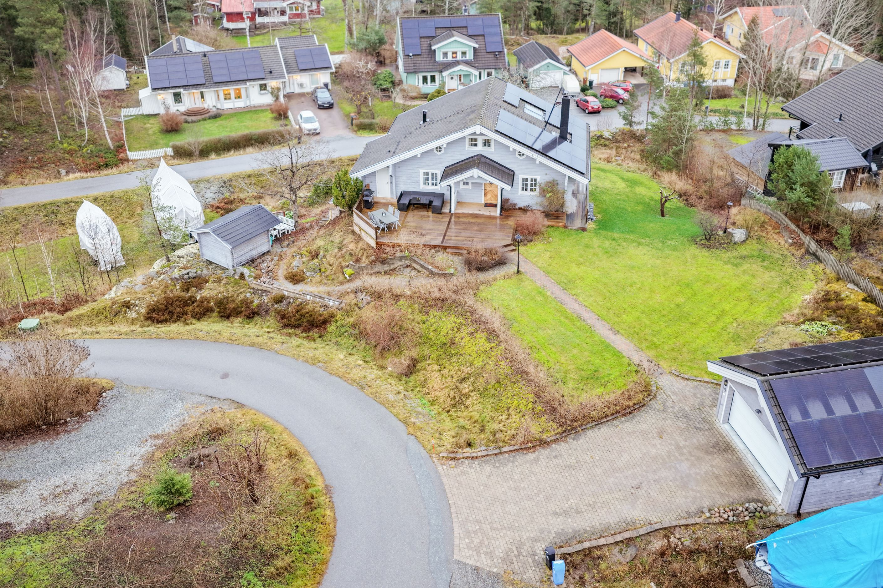 Utemiljön är något alldeles extra. Den stora tomten erbjuder gott om plats med två parkeringsplatser med plats för flertalet bilar möjlighet att ha egen båt på tomten. Laddmöjligheter för elbil och du laddar bilarna med egen el från solpanelerna från april-september. För den som önskar finns dessutom ett rymligt dubbelgarage om cirka 41 kvm med elport. På balkongerna njuter du morgonsolen och altanen bjuder på ett fantastiskt solläge från förmiddagen till sena kvällen. Bergvärme, solpaneler och energiklass B, larm och laddplatser bidrar till ett bekvämt och hållbart boende.