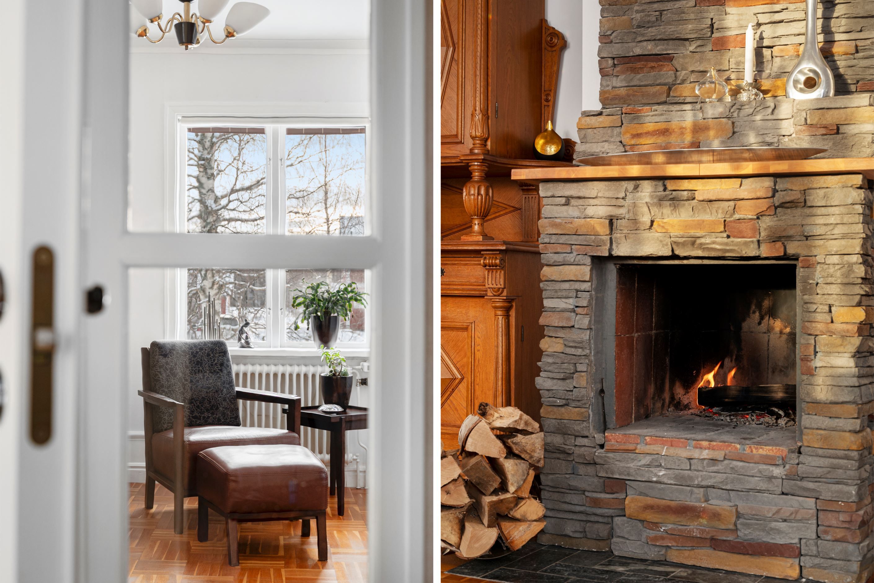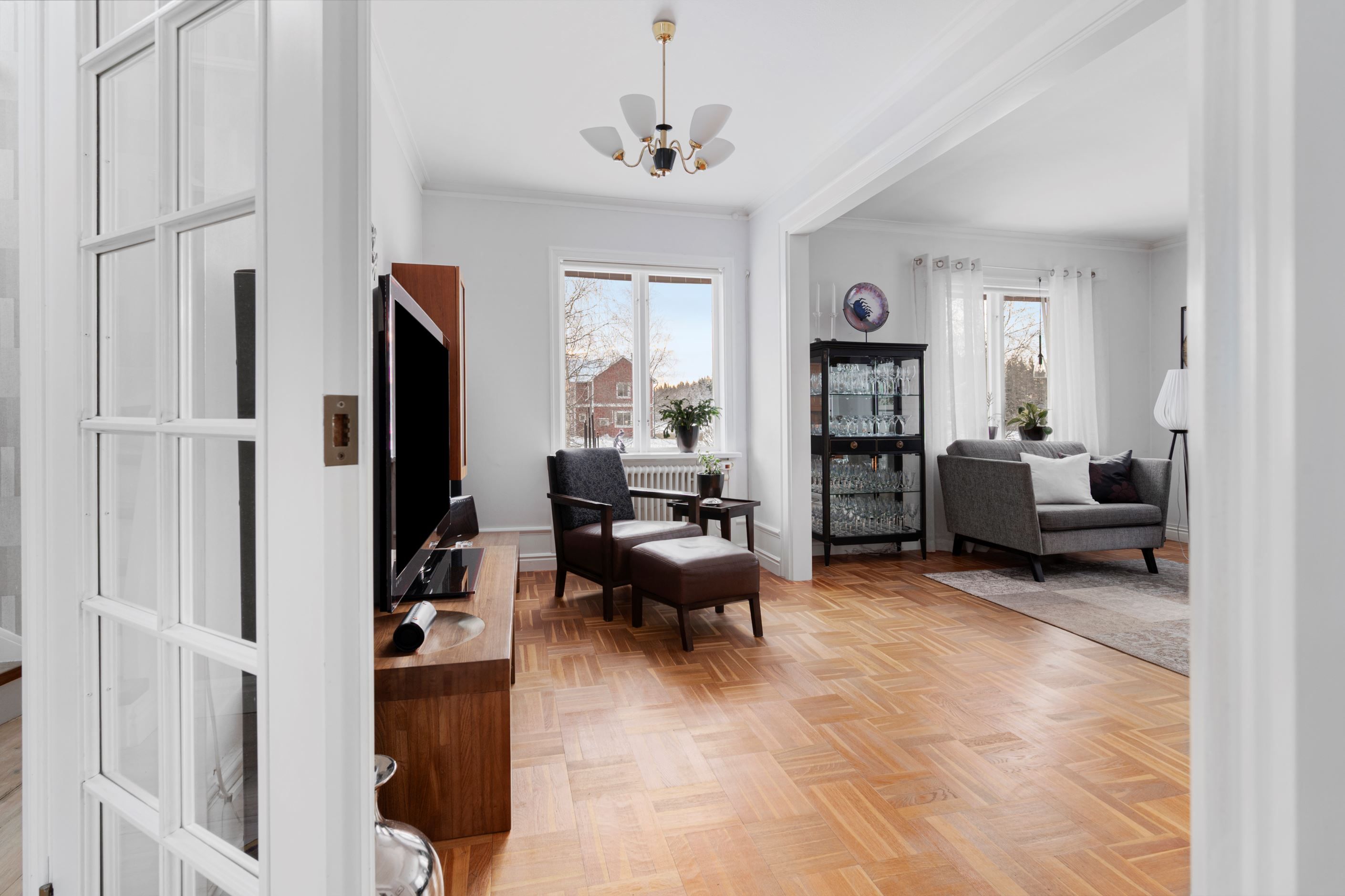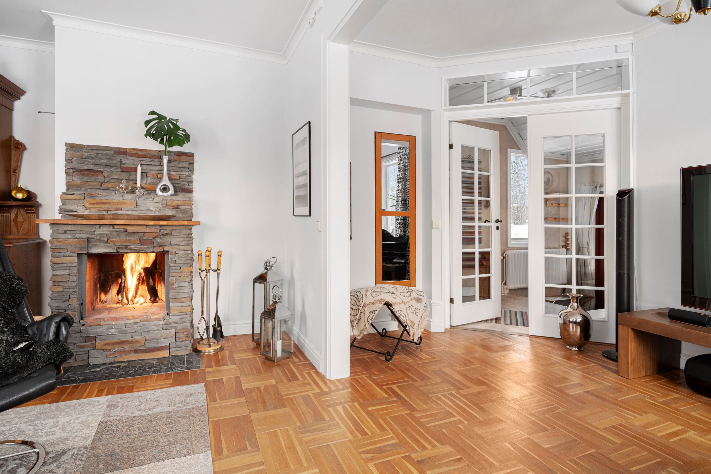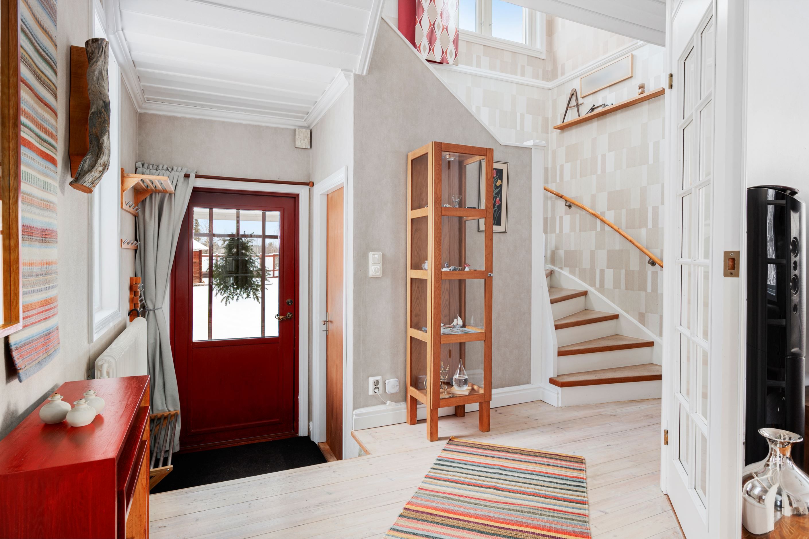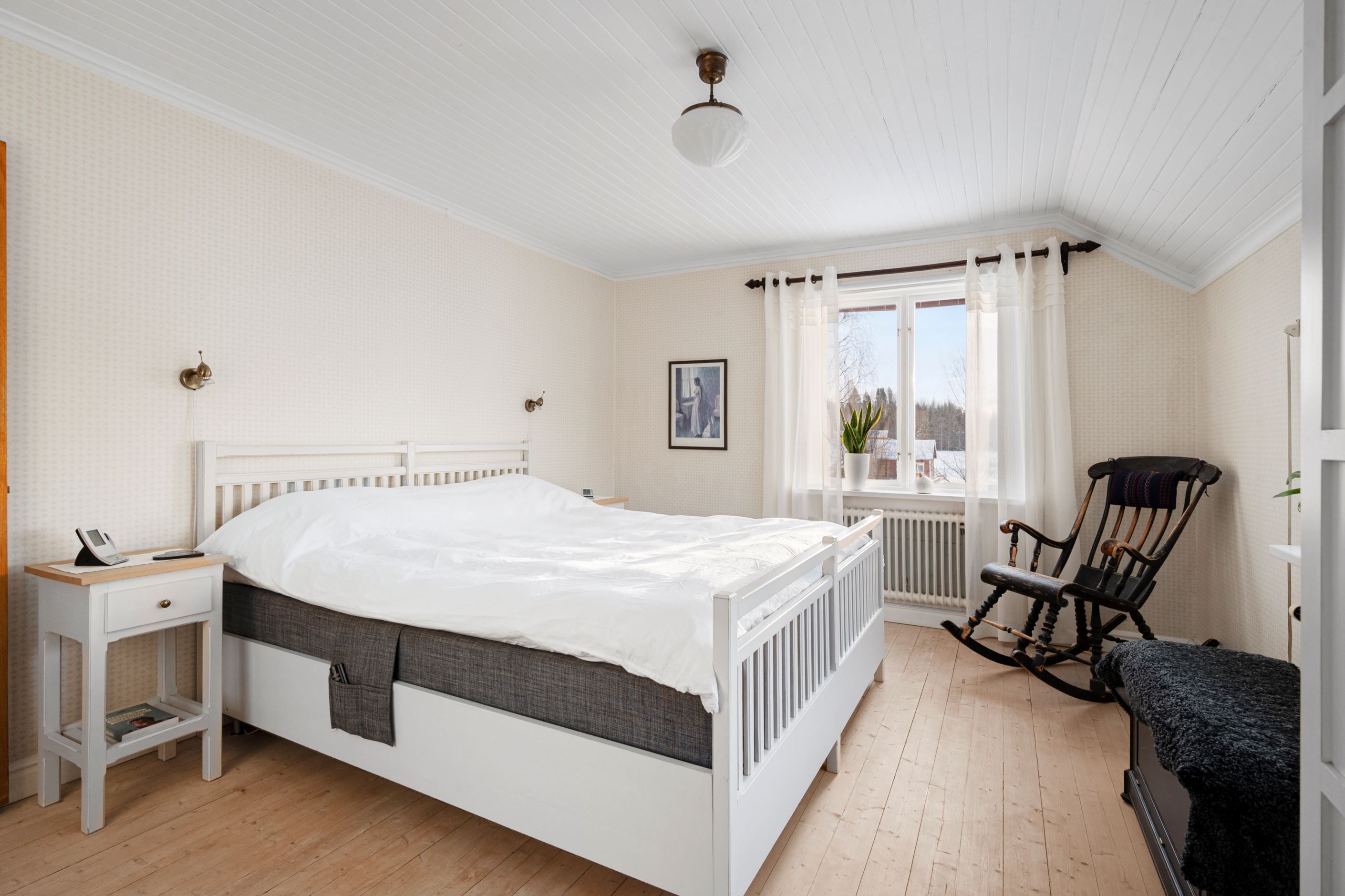 Den ståtliga huvudbyggnaden i två plan med källare uppfördes före 1928 och har sedan dess varsamt renoverats med respekt för husets själ. Den gedigna timmerstommen har kompletterats med tilläggsisolering, och de äldre restaurerade fönstren bevarar både ljusinsläpp och tidsenlig karaktär. Invändigt möts du av ljusa trägolv, tapeter i klassisk stil och en generös takhöjd som ger rymd och atmosfär.