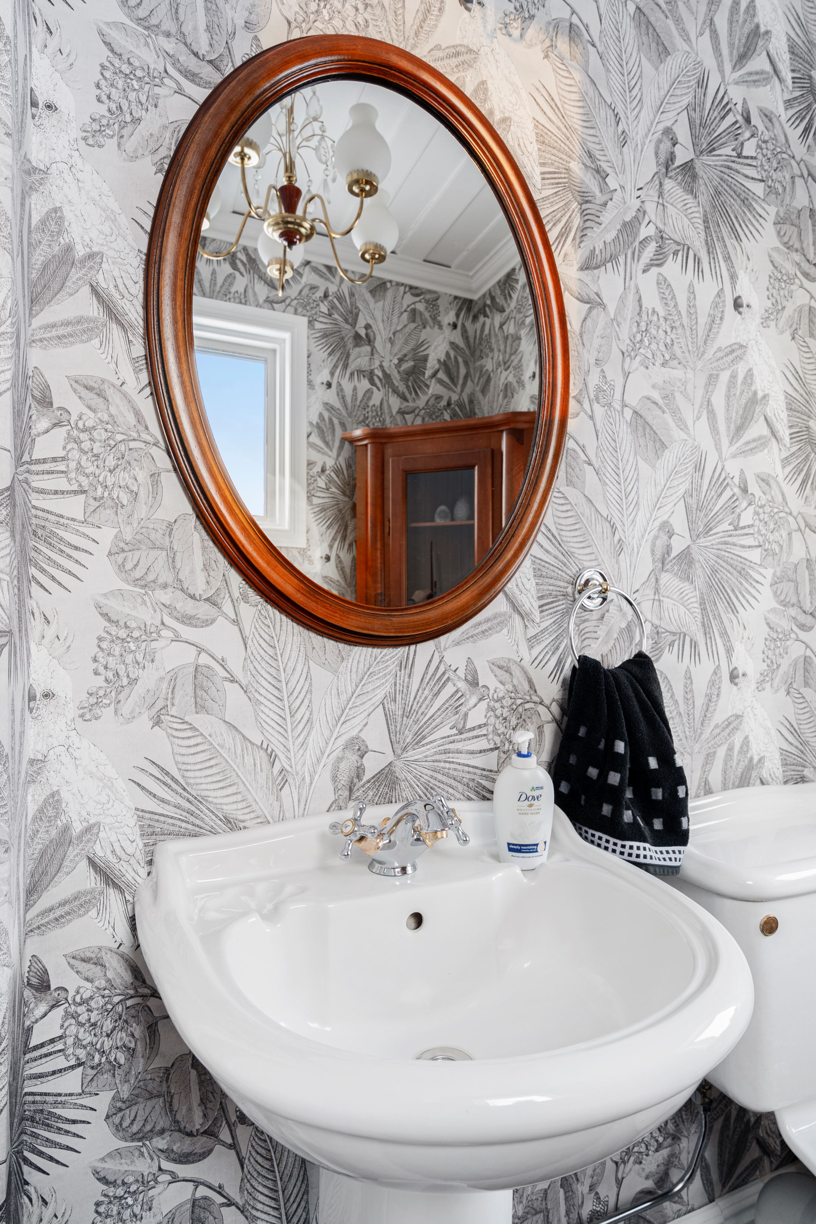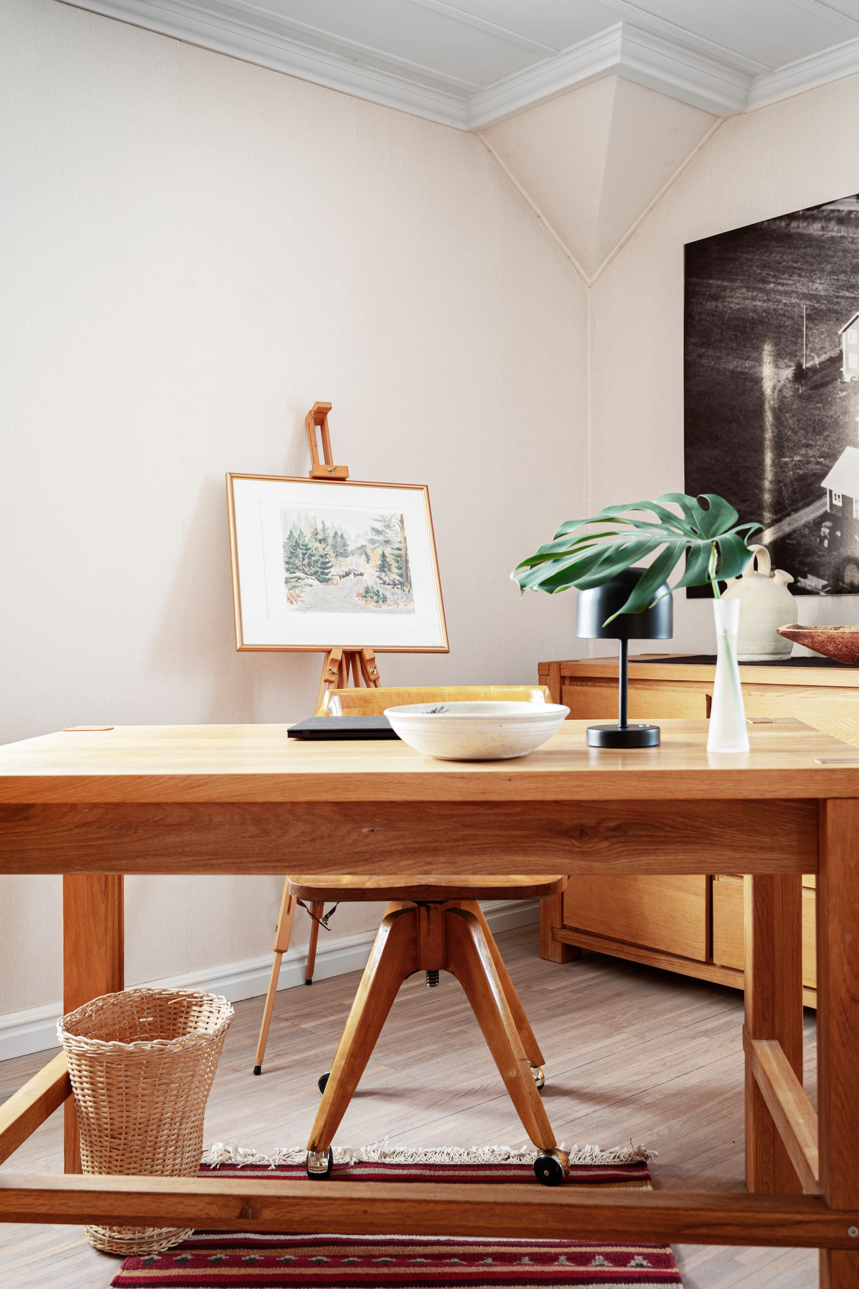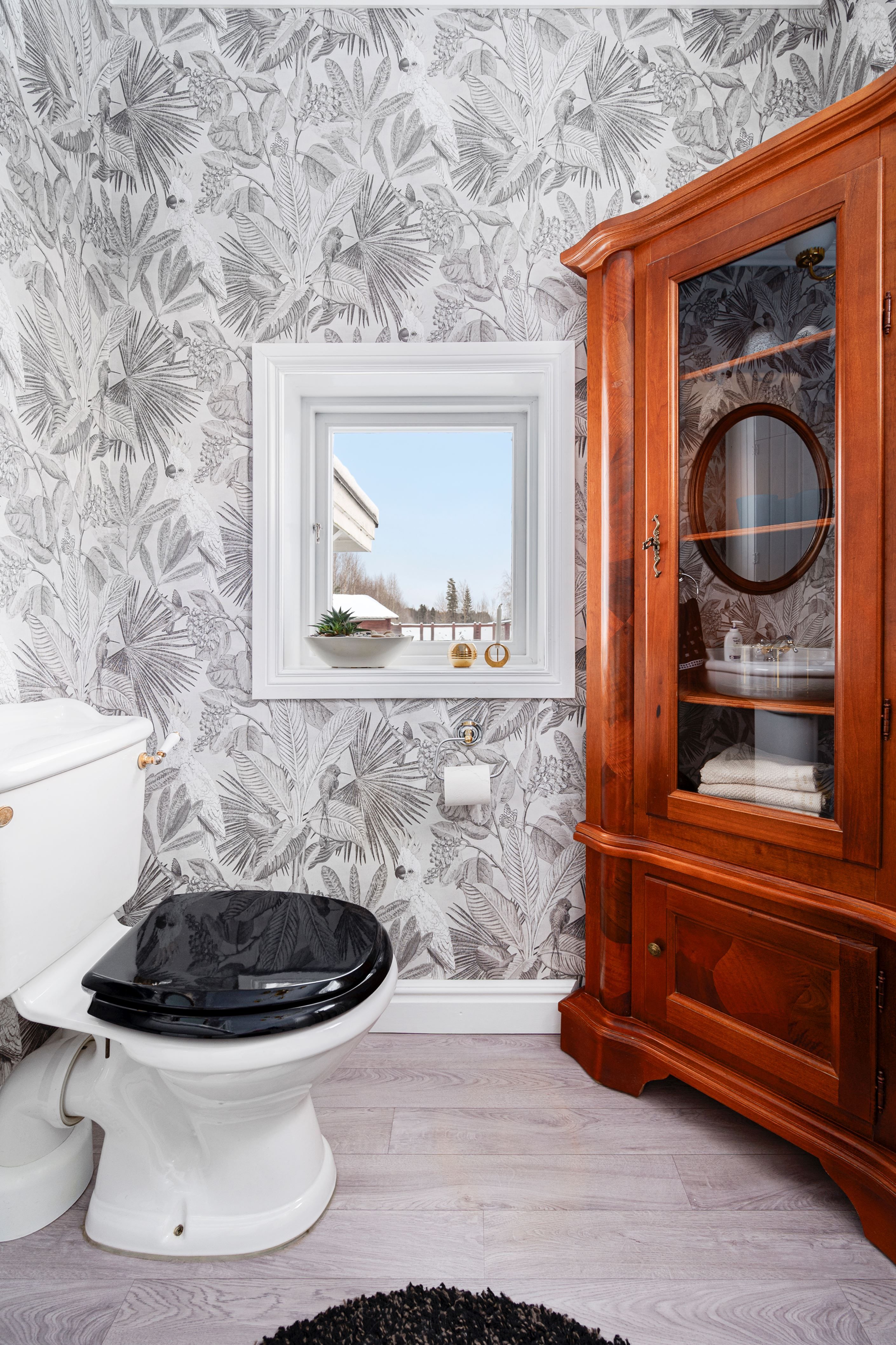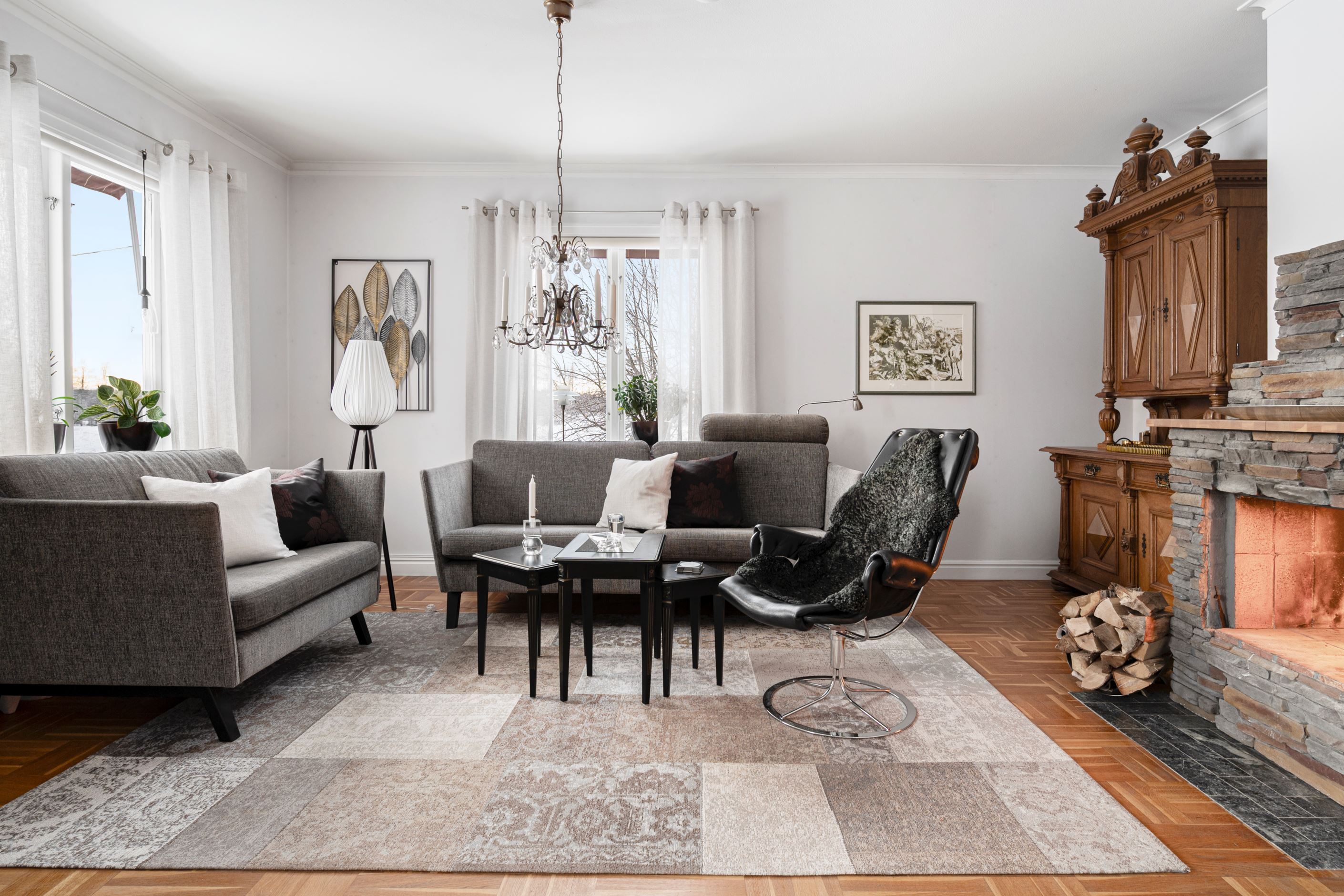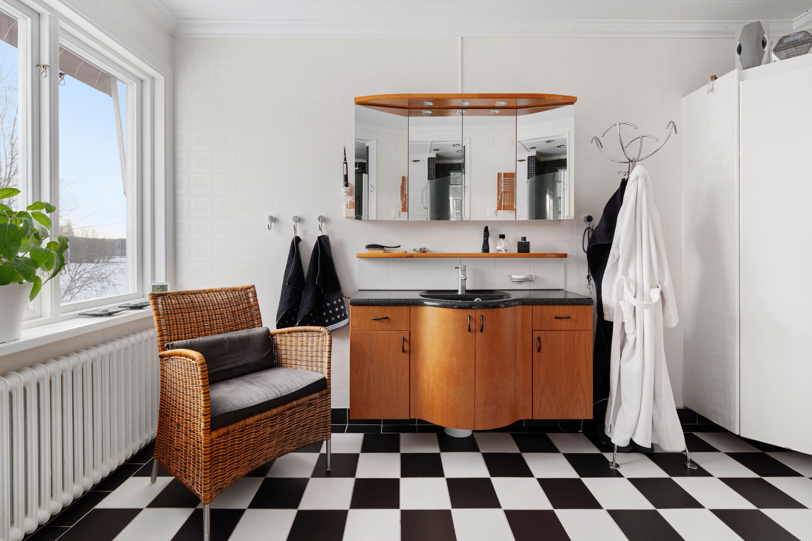 Den ståtliga huvudbyggnaden i två plan med källare uppfördes före 1928 och har sedan dess varsamt renoverats med respekt för husets själ. Den gedigna timmerstommen har kompletterats med tilläggsisolering, och de äldre restaurerade fönstren bevarar både ljusinsläpp och tidsenlig karaktär. Invändigt möts du av ljusa trägolv, tapeter i klassisk stil och en generös takhöjd som ger rymd och atmosfär.