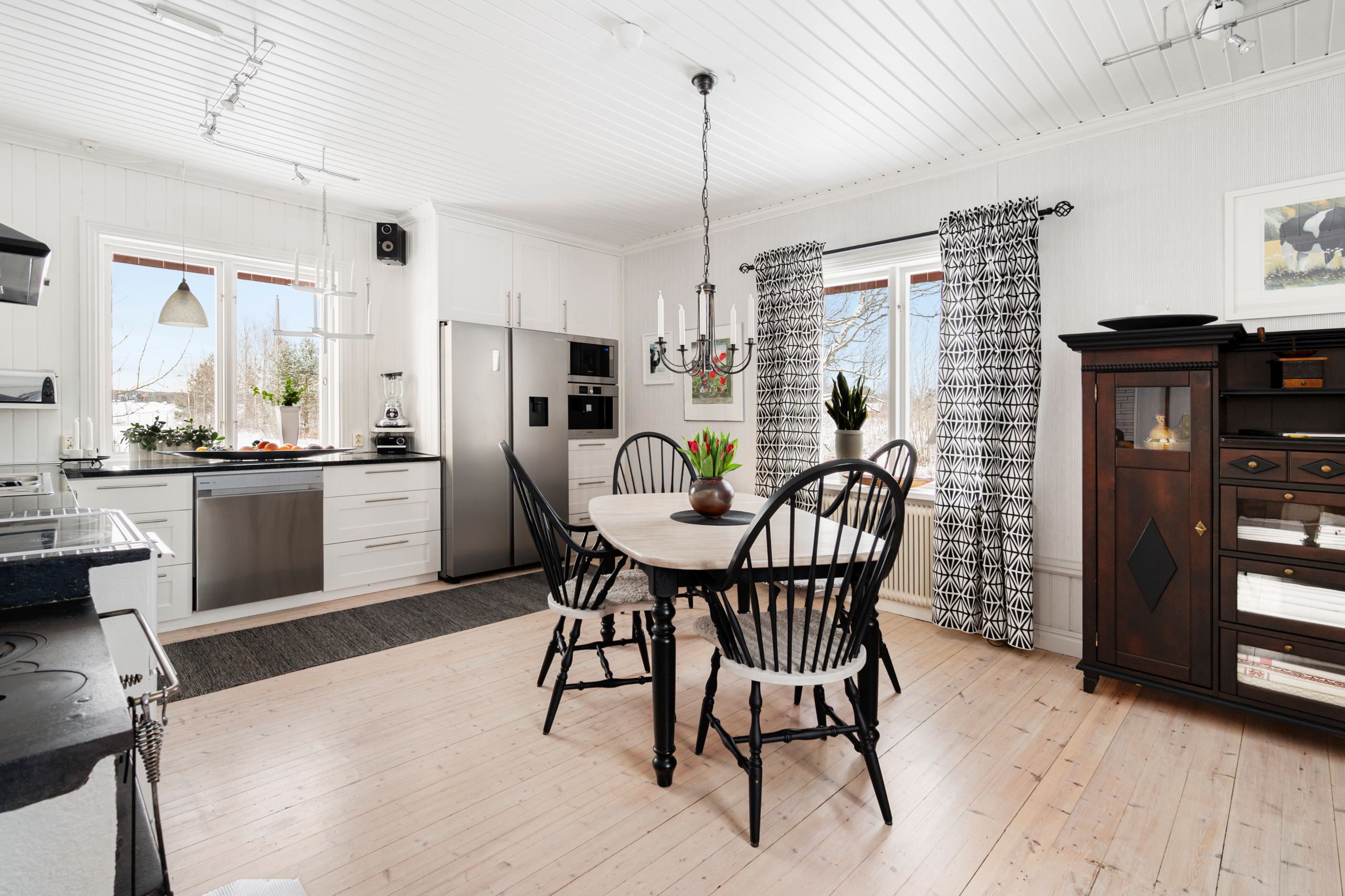 Köket är modernt och smakfullt med generösa arbetsytor, rostfria vitvaror och vedspis/öppenspis som ger både värme och trivsel. Huset rymmer tre rymliga sovrum, ett stilrent badrum med hörnbadkar och dusch, samt flera sociala ytor med vacker utsikt över den omgivande naturen.