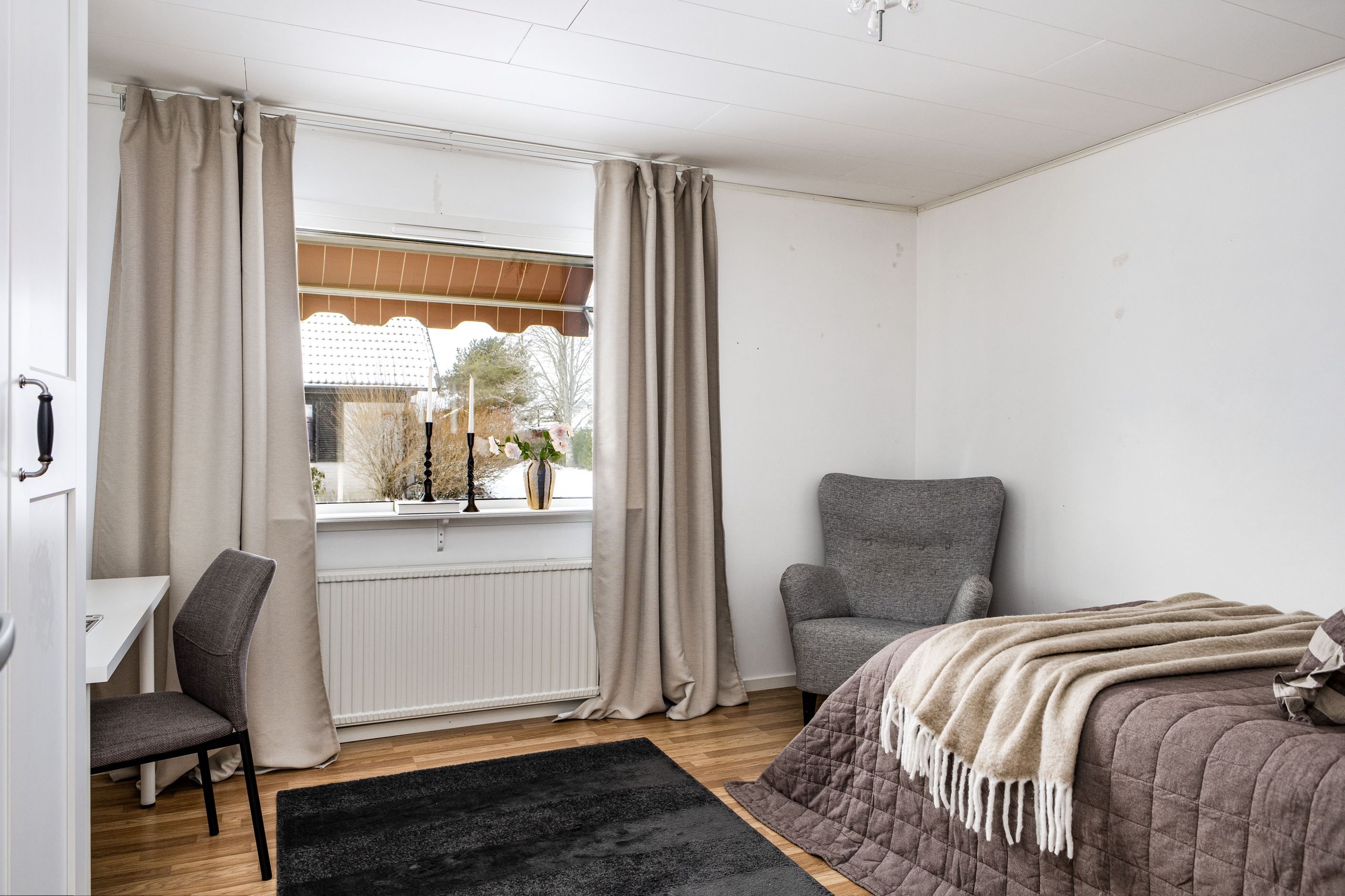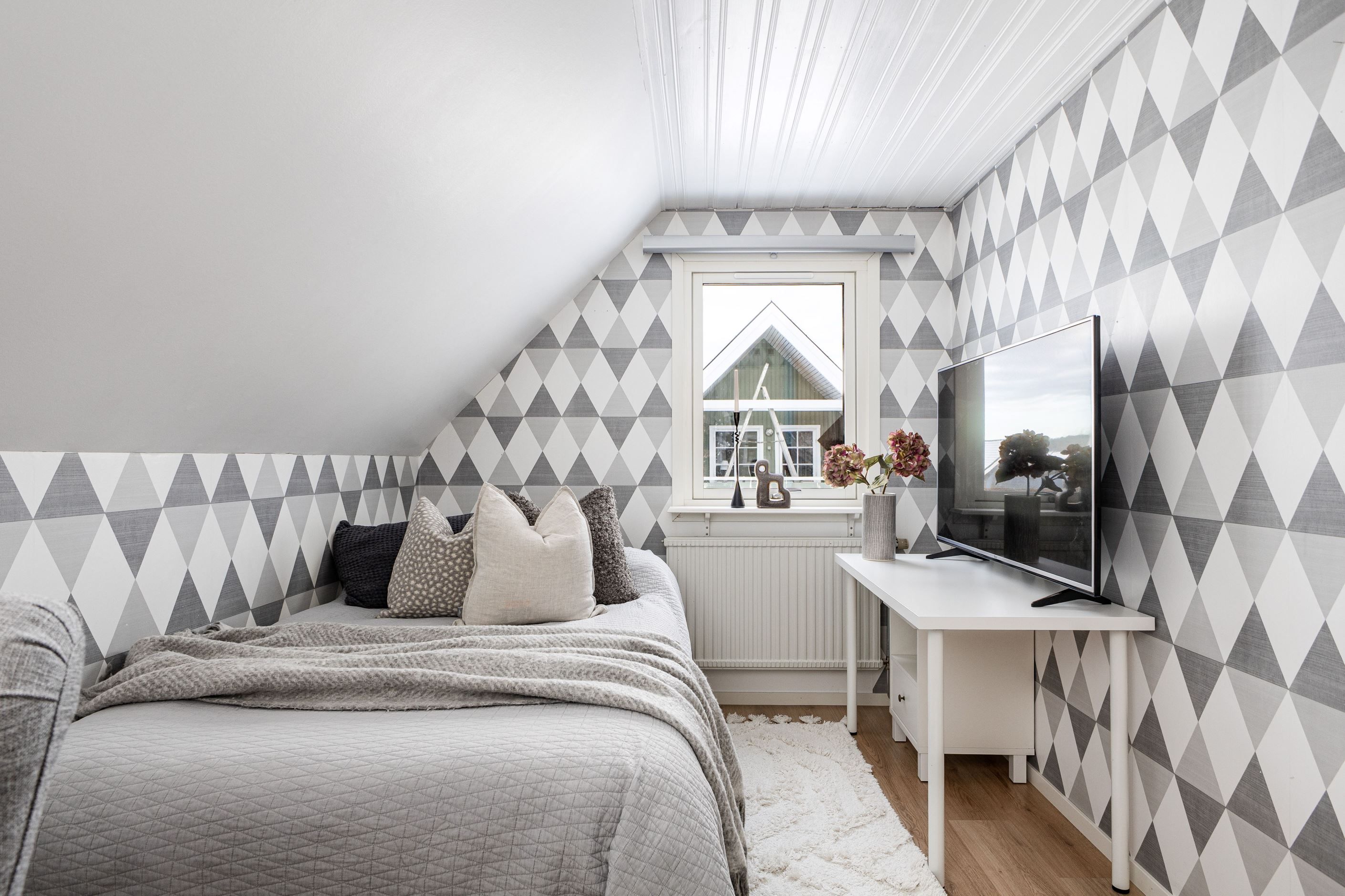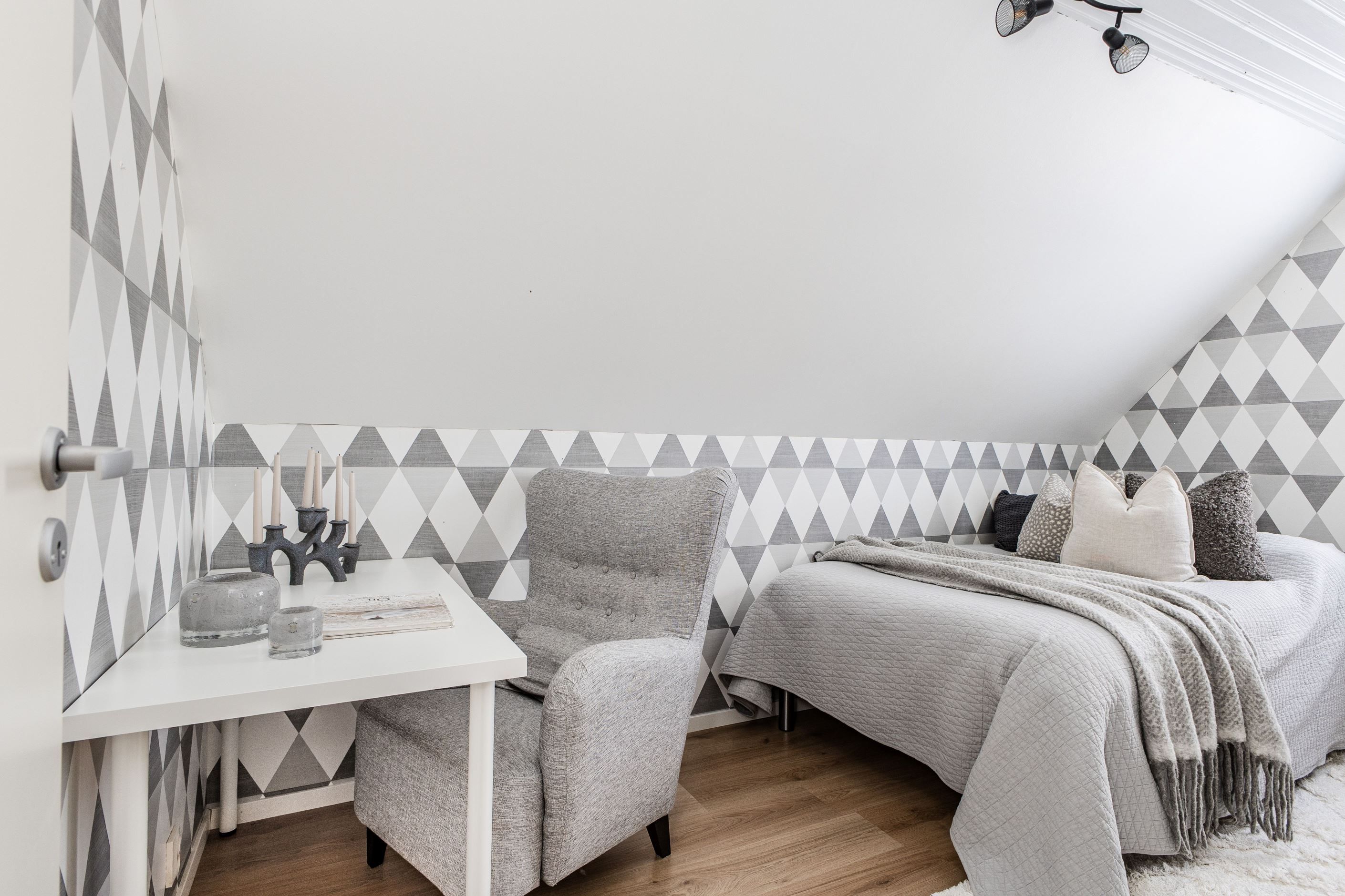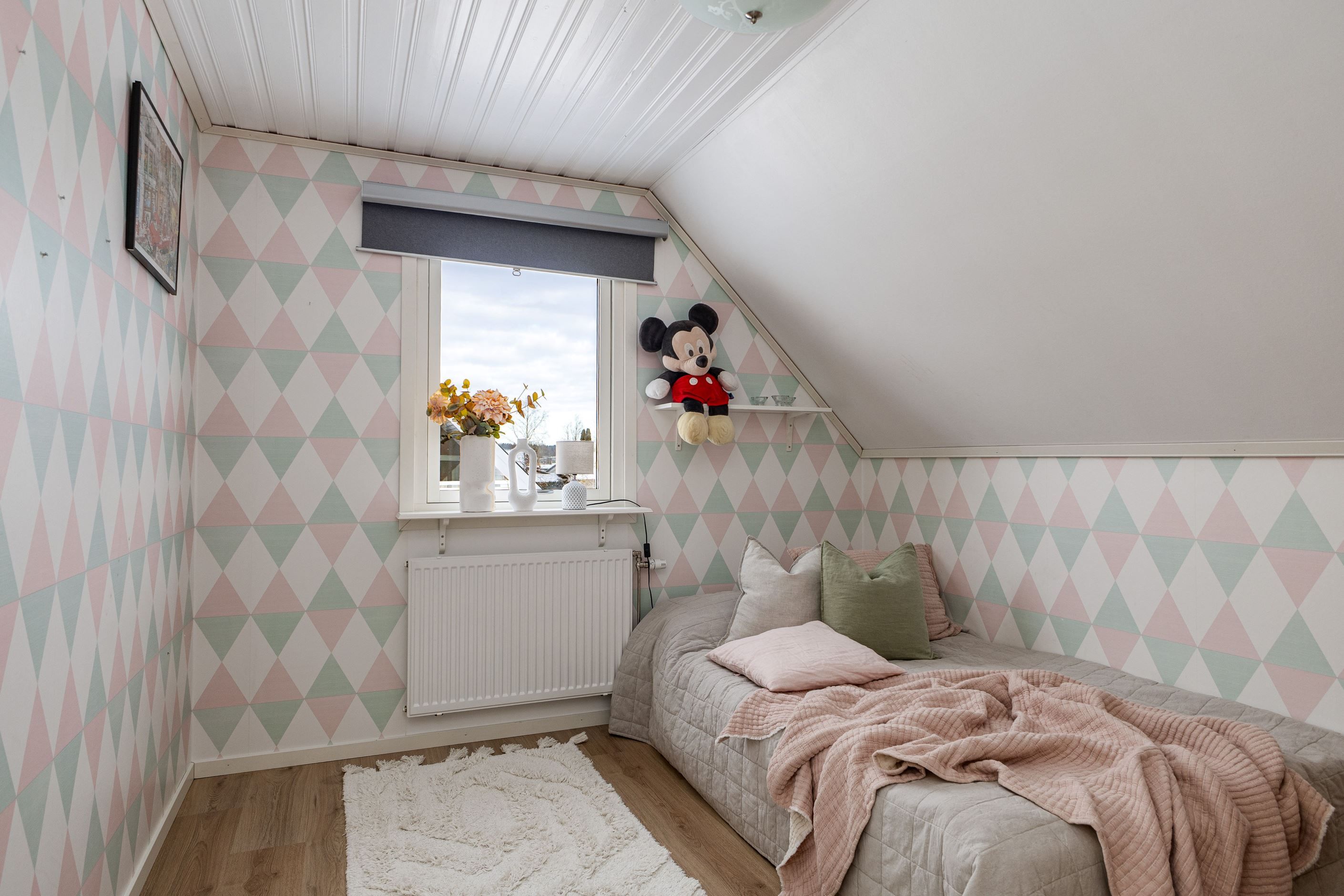 På övre plan finns ett trivsamt allrum samt tre rymliga sovrum som med fördel kan användas som sovrum, gästrum eller hemmakontor. Här finns även ett badrum utrustat med kommod, wc och badkar.