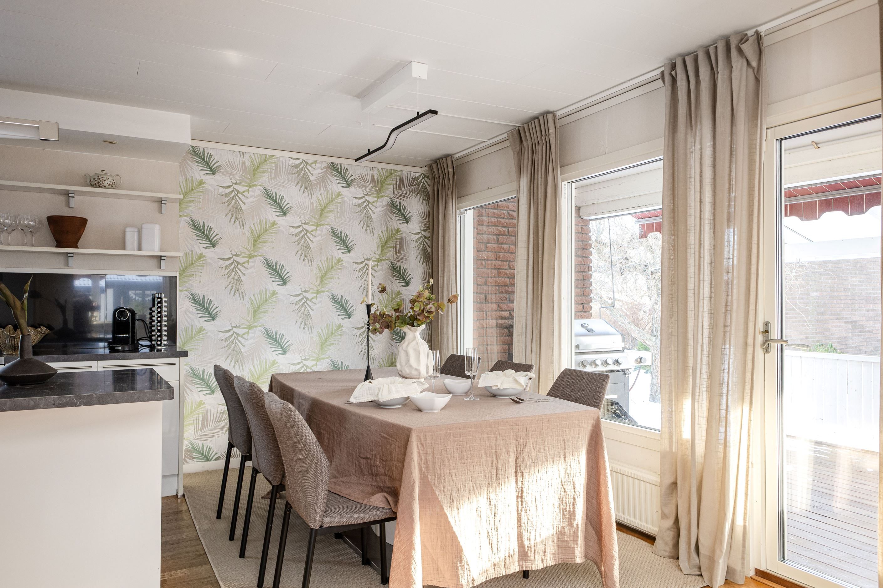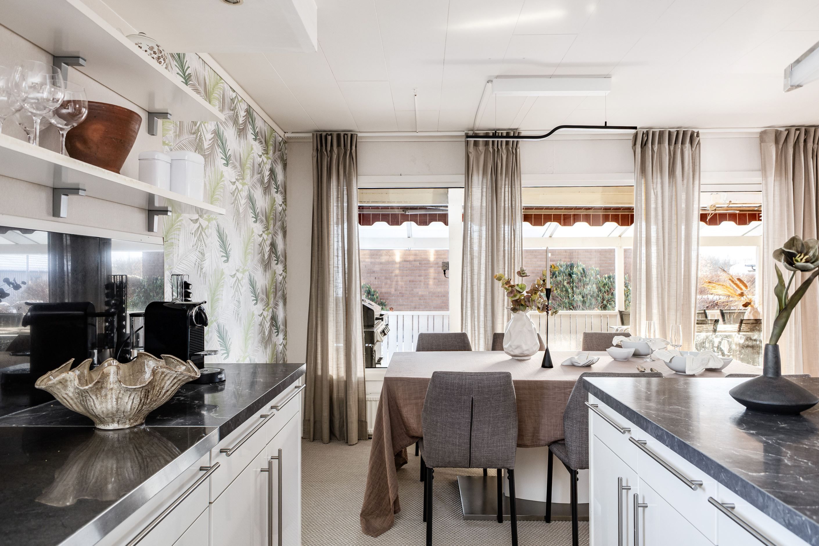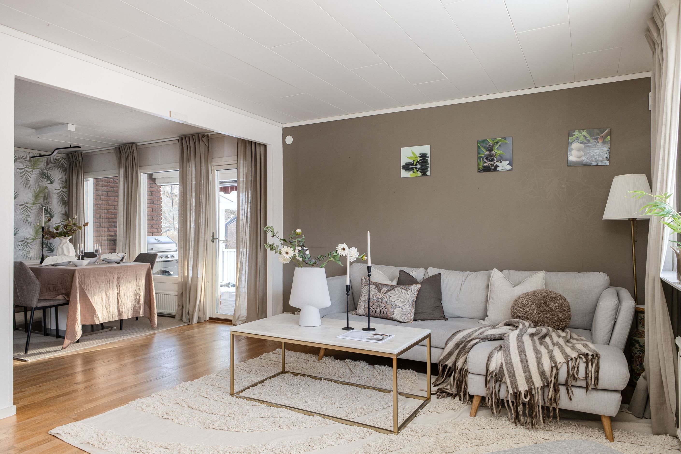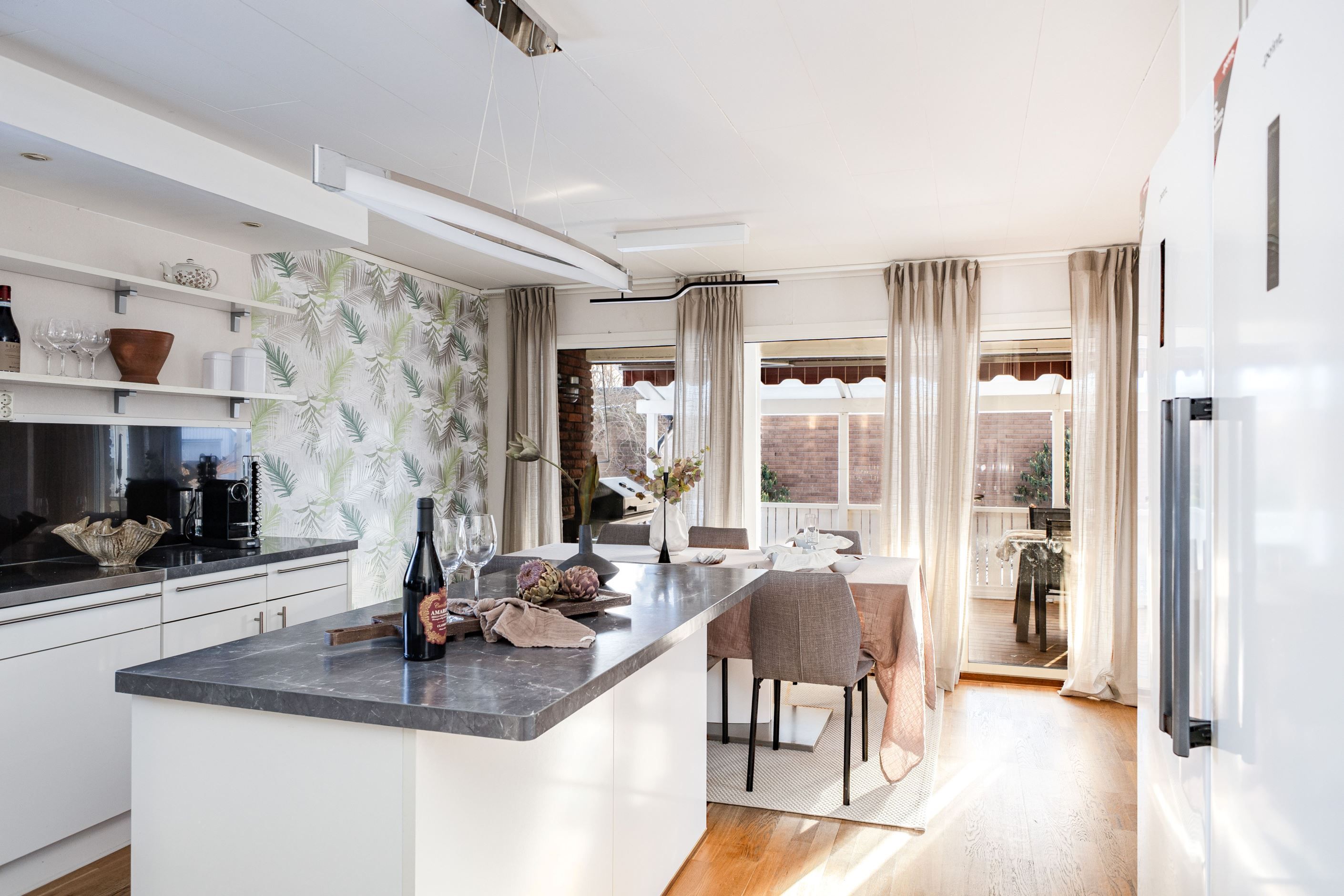 Köket är smakfullt inrett med generösa arbetsytor och en praktisk köksö som underlättar både matlagning och servering. Här finns plats för matgrupp för vardagens måltider, och via den direkta utgången till altanen blir det enkelt att ta middagen ut under årets varmare månader. Vardagsrummet, i öppen anslutning till matsalen, präglas av stora fönsterpartier som ger ett härligt ljusinsläpp och skapar en varm och inbjudande atmosfär.