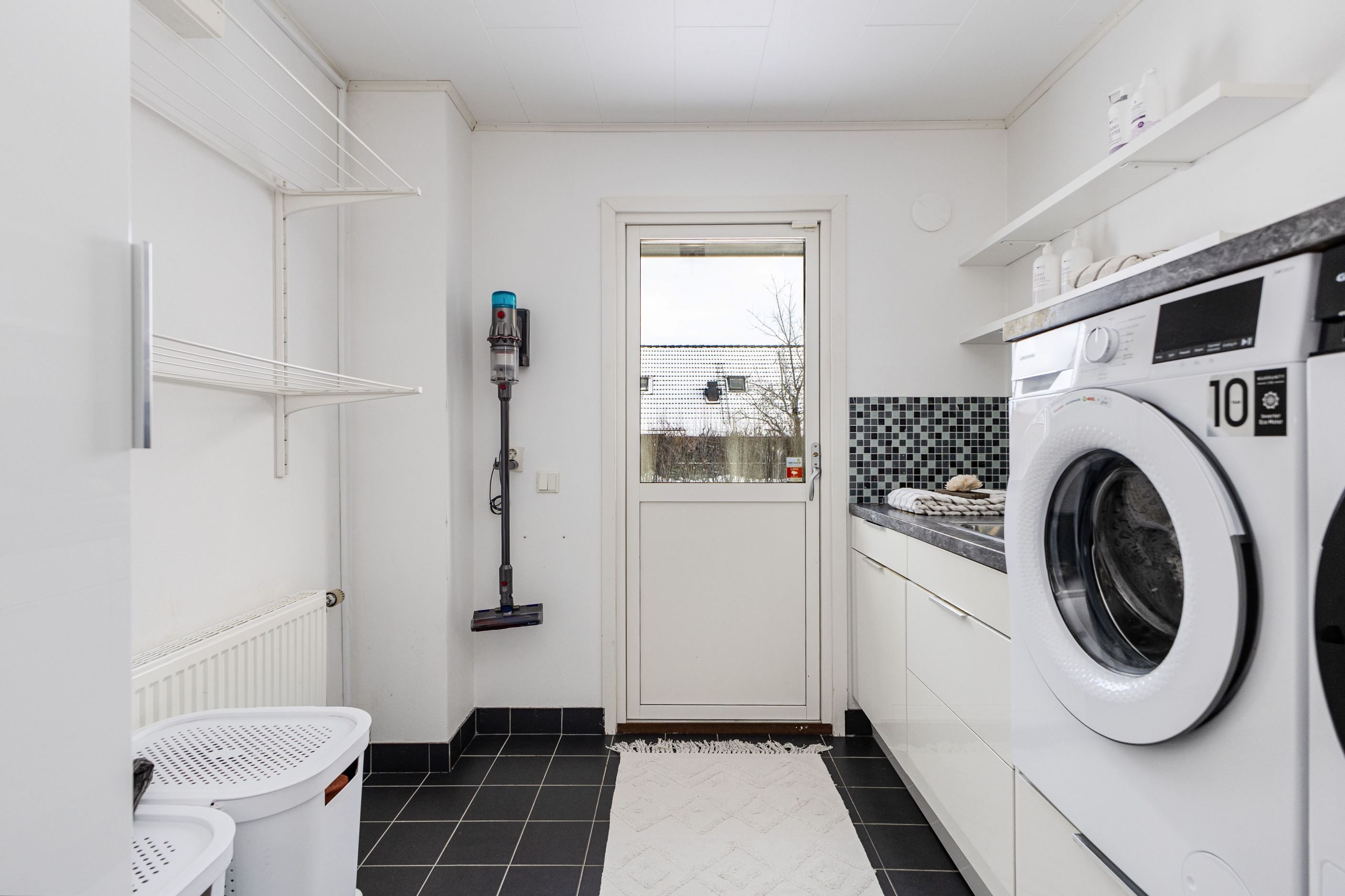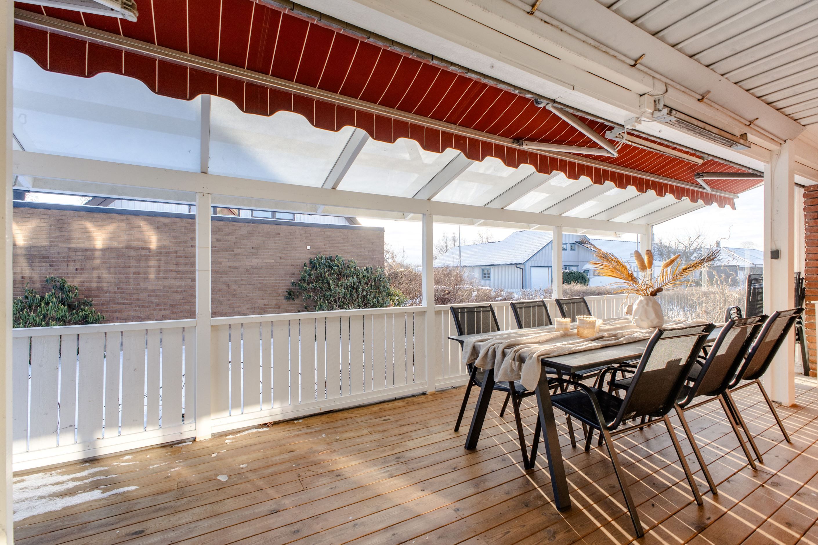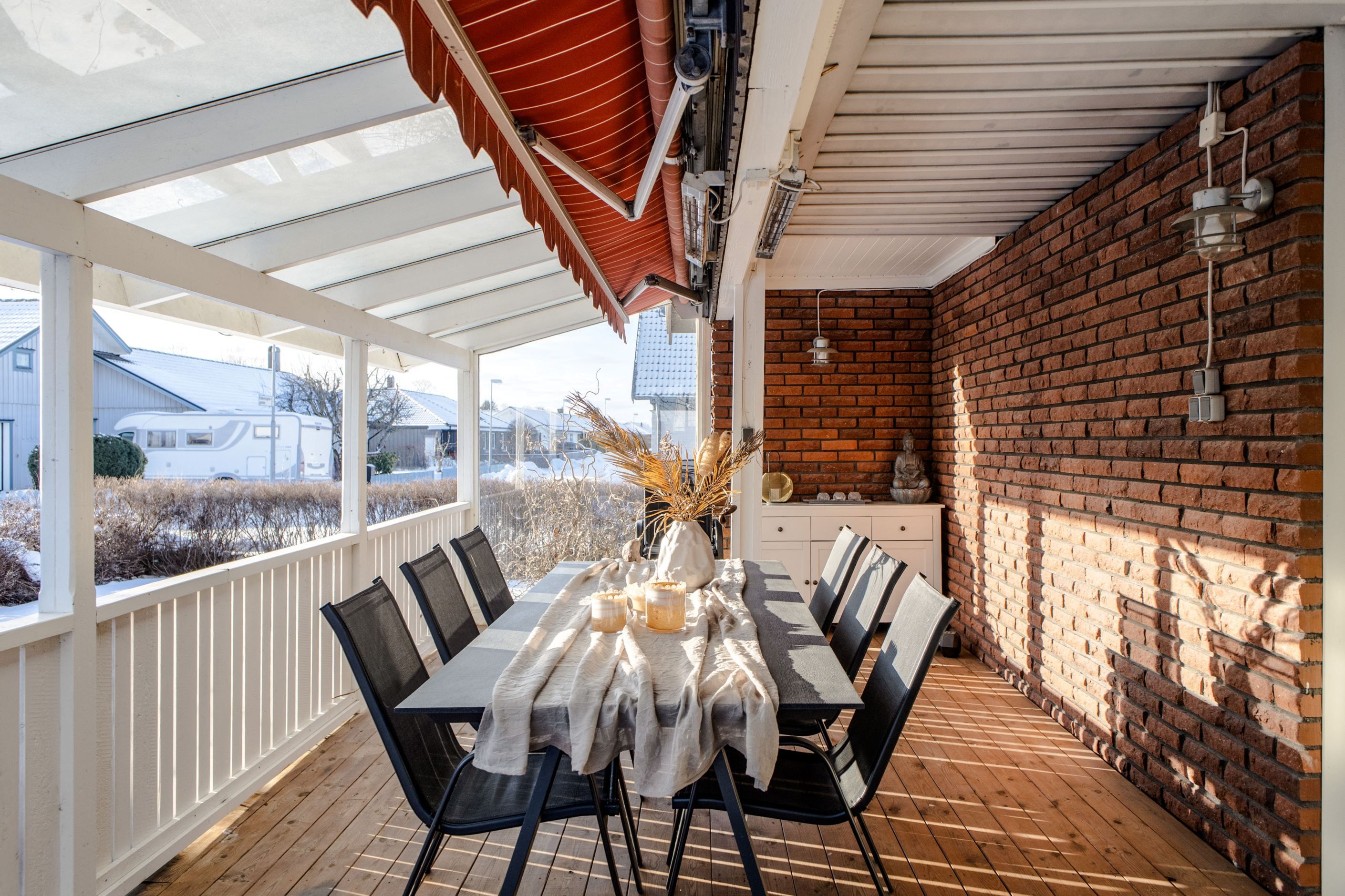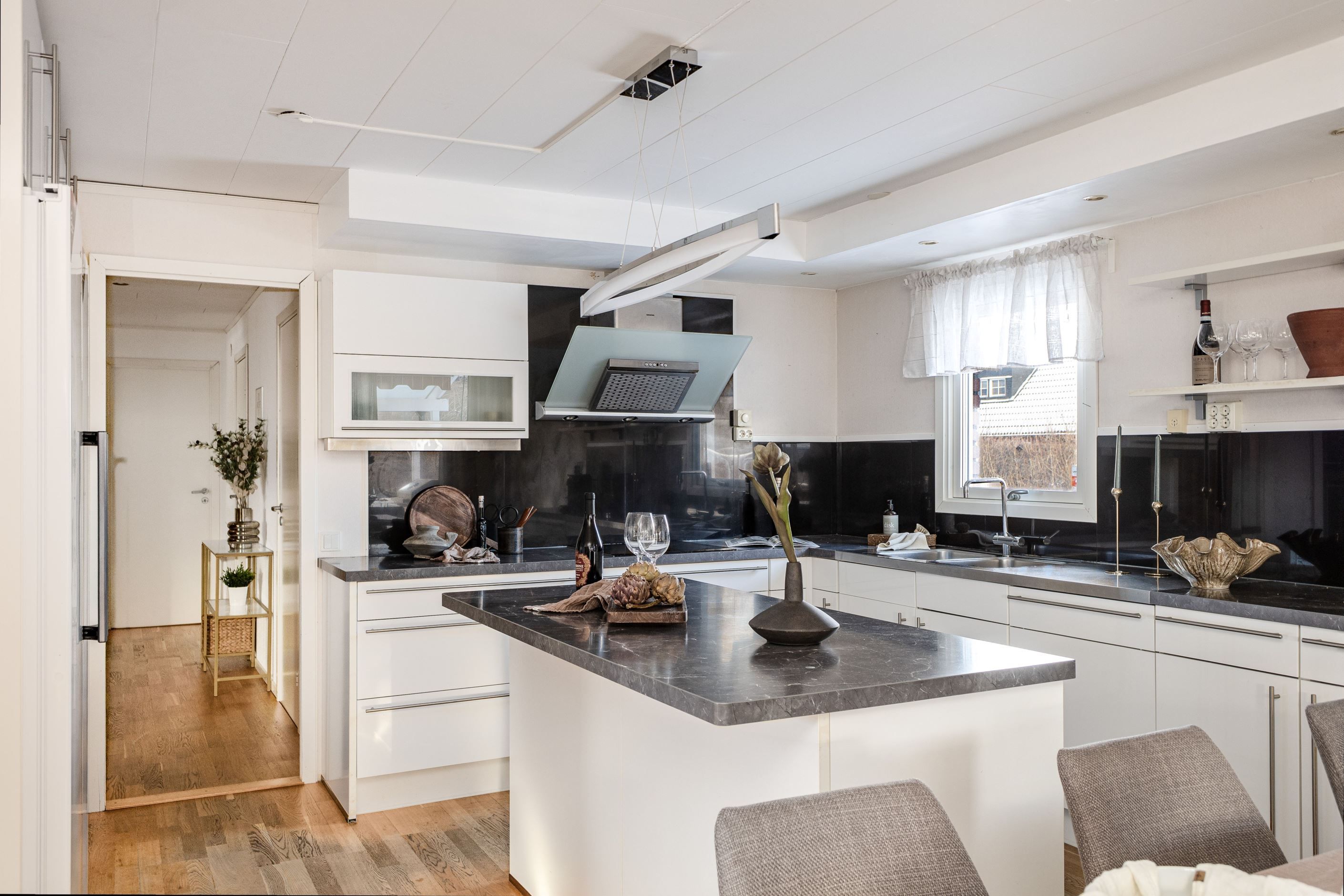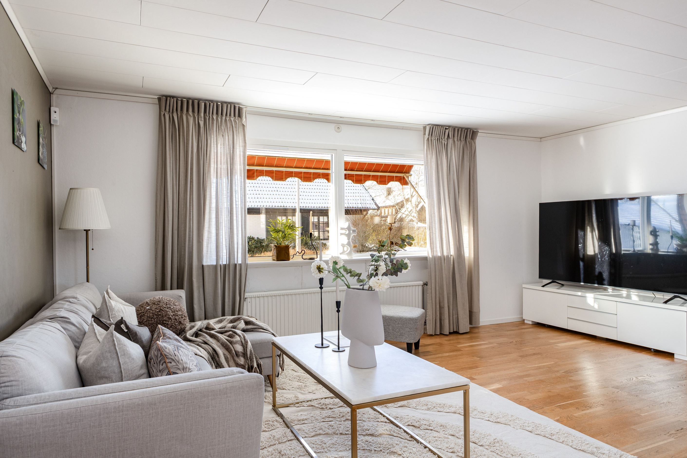 Köket är smakfullt inrett med generösa arbetsytor och en praktisk köksö som underlättar både matlagning och servering. Här finns plats för matgrupp för vardagens måltider, och via den direkta utgången till altanen blir det enkelt att ta middagen ut under årets varmare månader. Vardagsrummet, i öppen anslutning till matsalen, präglas av stora fönsterpartier som ger ett härligt ljusinsläpp och skapar en varm och inbjudande atmosfär.
