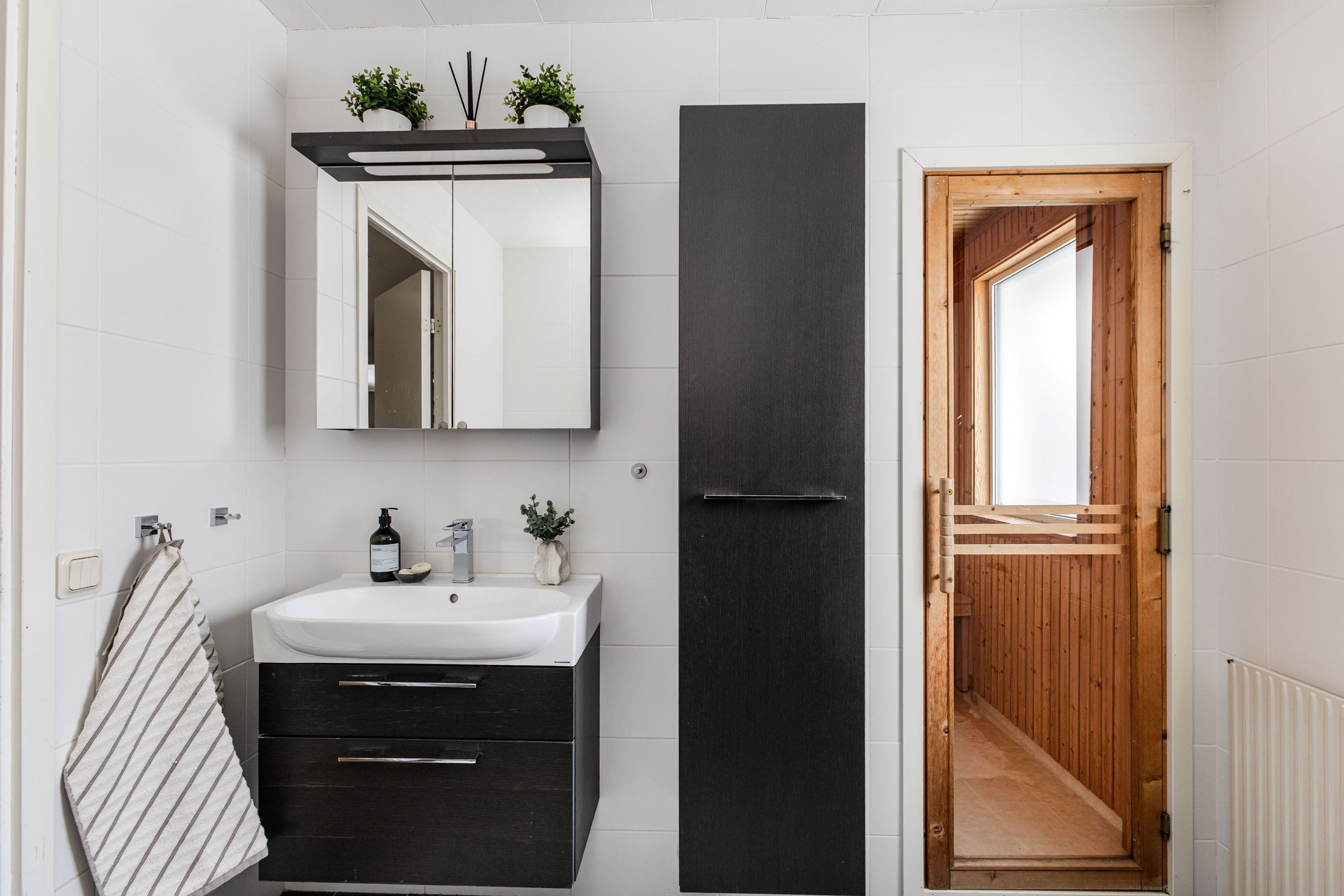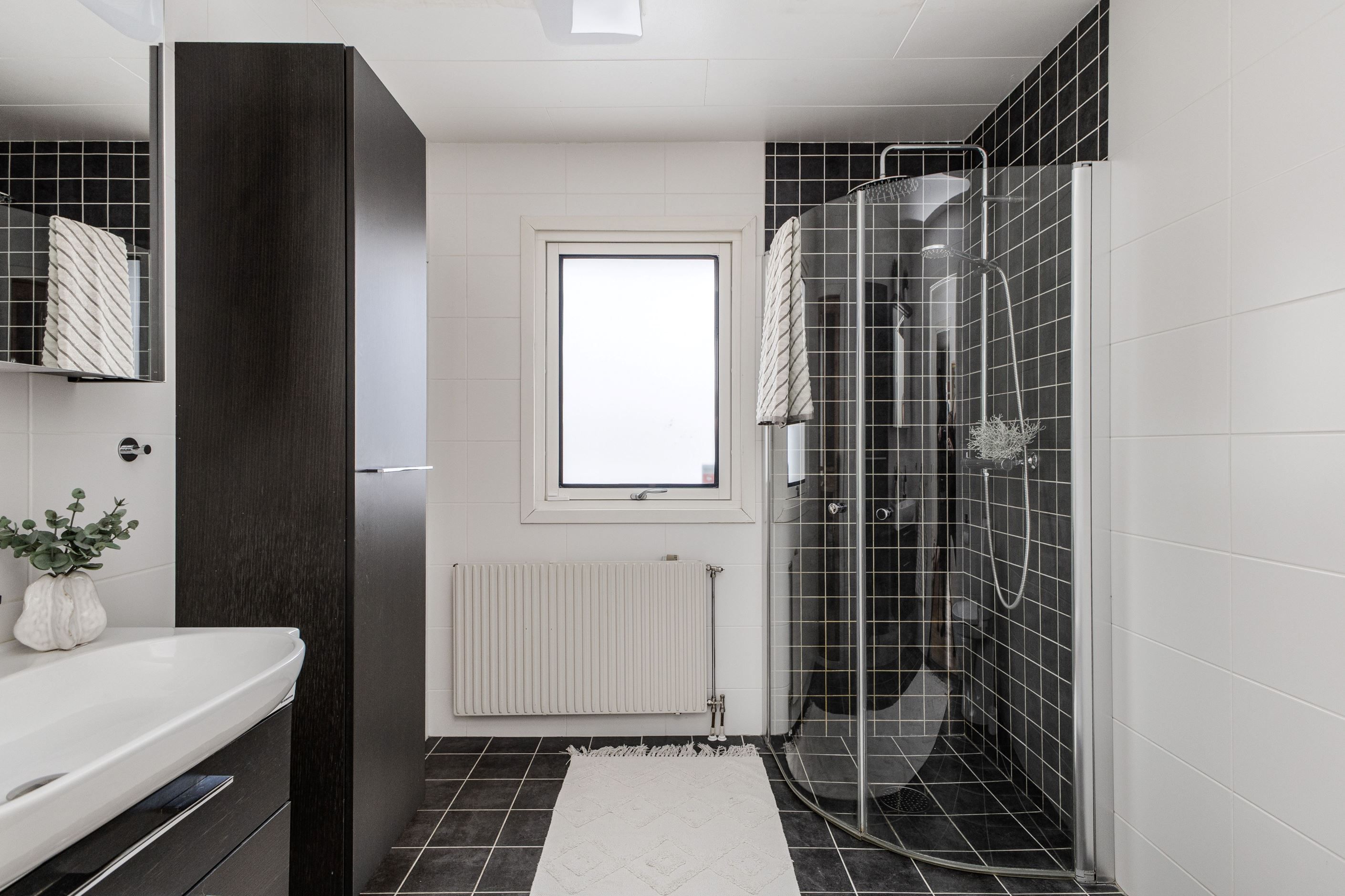 Entréplanet rymmer även ett rogivande sovrum, ett helkaklat badrum med anslutning till bastu, en praktisk klädkammare samt tvättstuga med groventré.