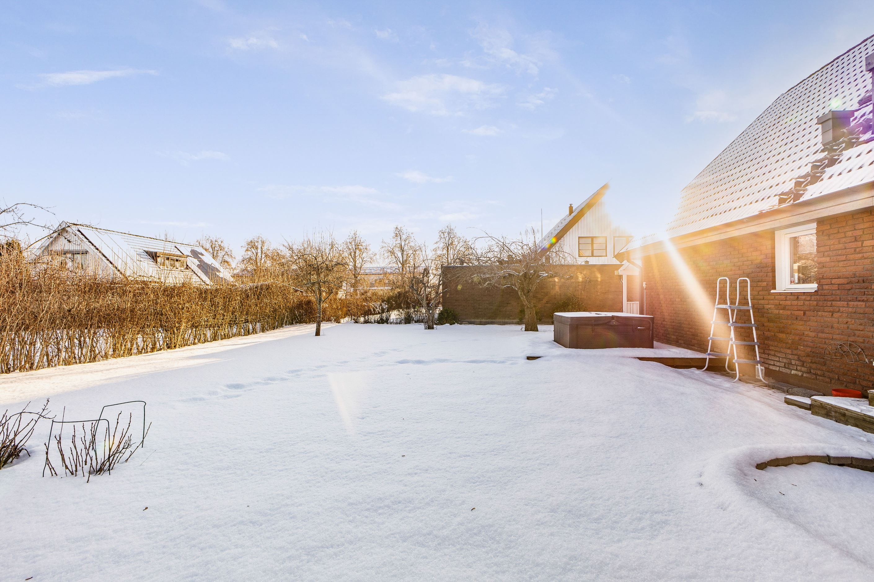 Trädgården bjuder på generösa gräsytor som passar utmärkt för både lek och avkoppling. Här finns ett inglasat uterum som förlänger utesäsongen samt ett spabad som ger möjlighet till avkopplande stunder i en privat och trivsam miljö.
