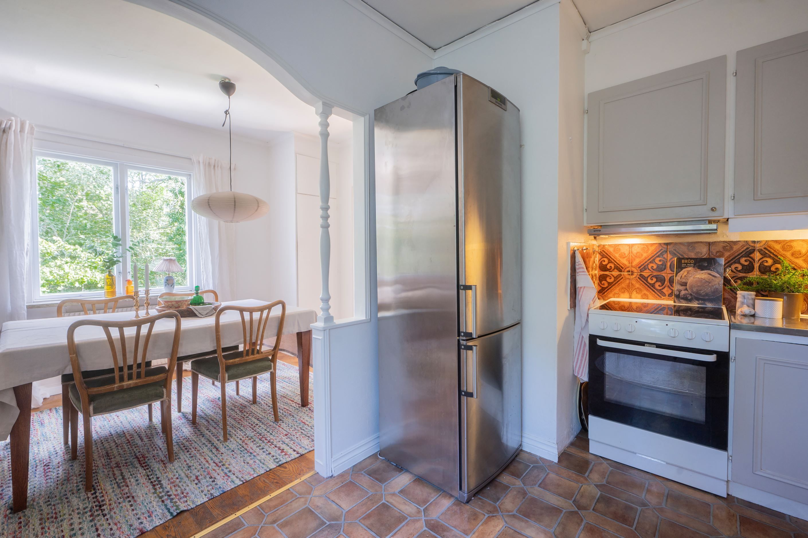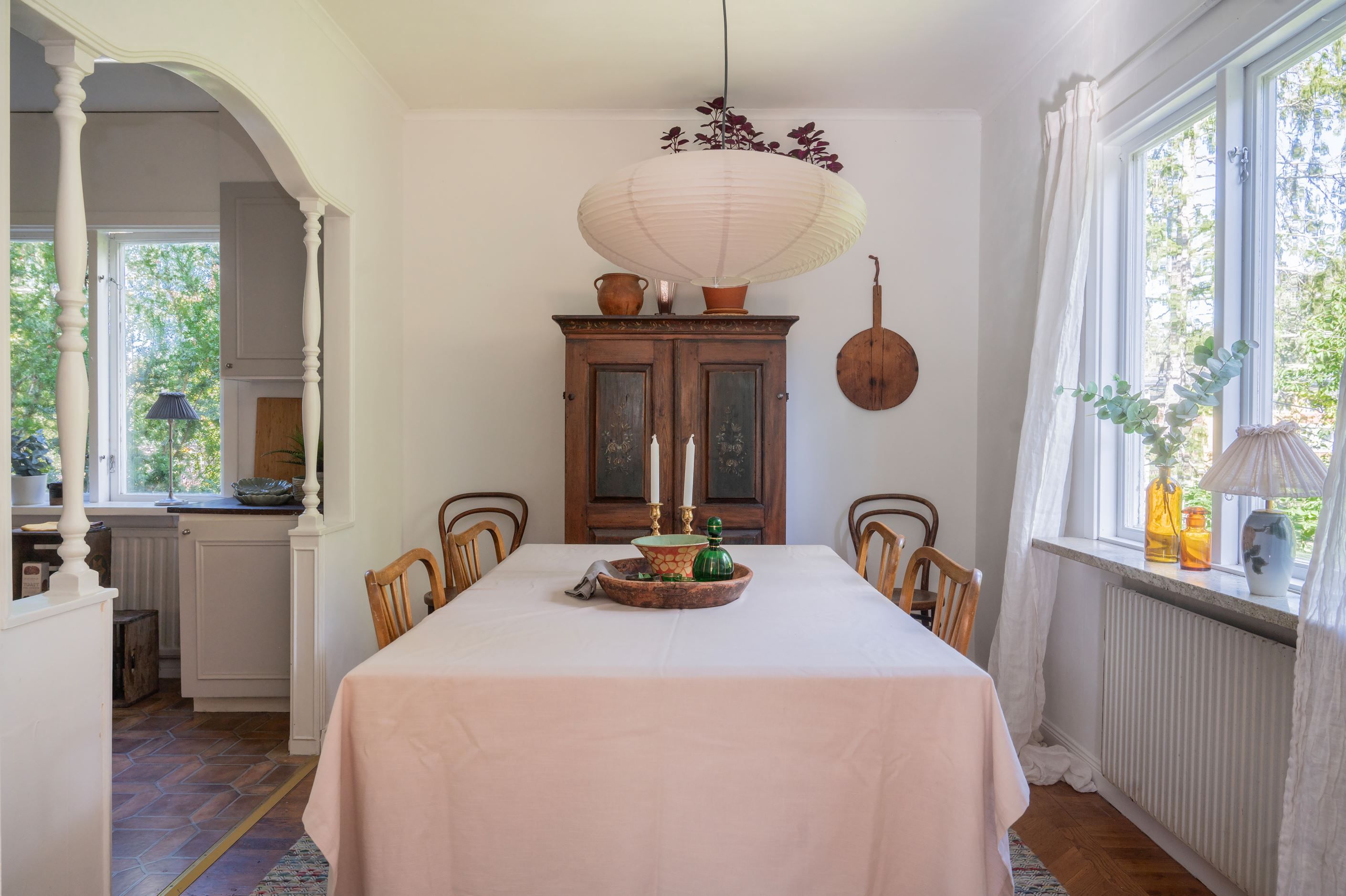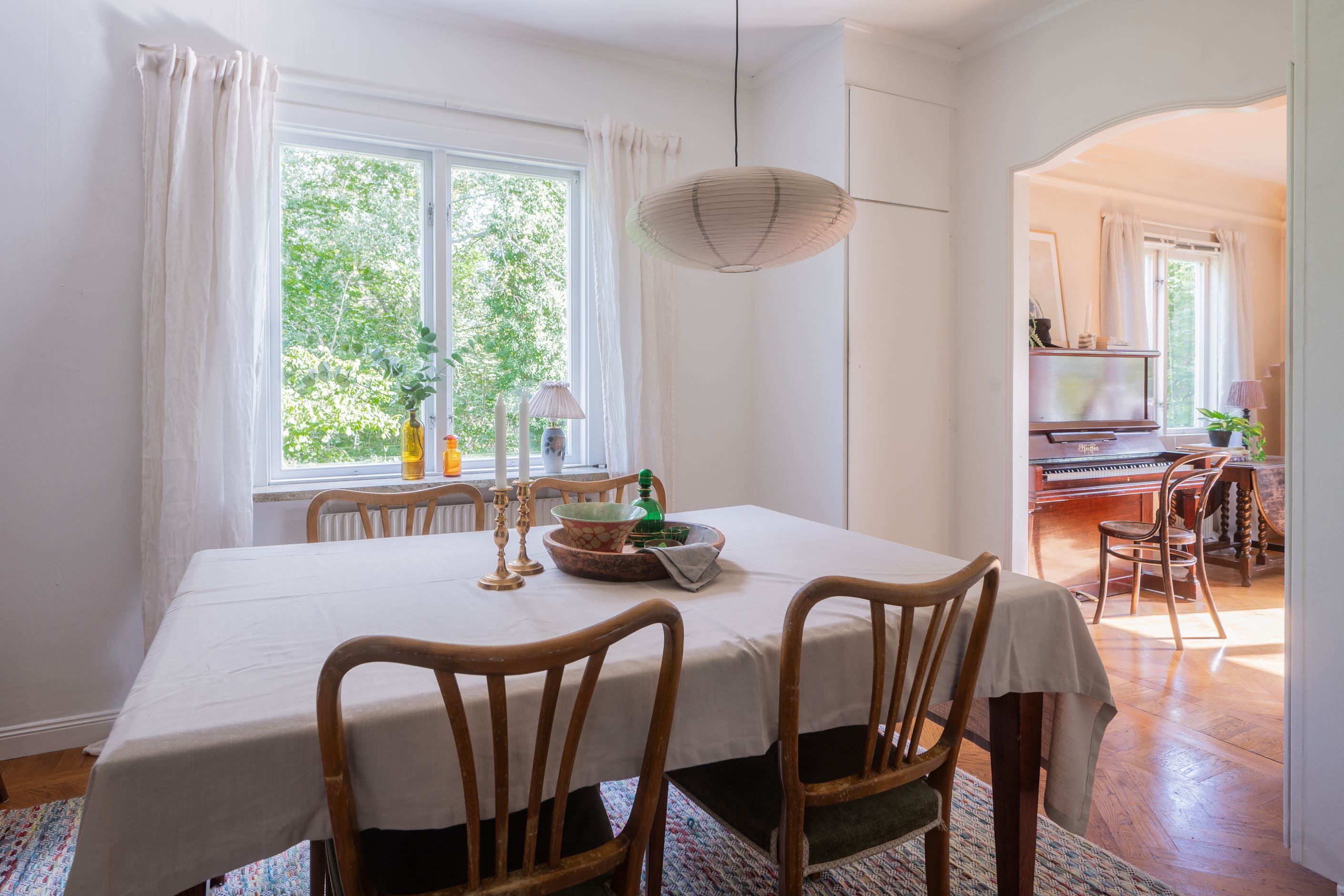 Entréplanet bjuder in till fina sällskapsytor med ett vardagsrum som har en braskamin, perfekt för både mysiga kvällar och som värmande tillskott under årets kalla månader. Här finns också en ljus och inbjudande matsal samt ett kök med plats för ett mindre matbord.