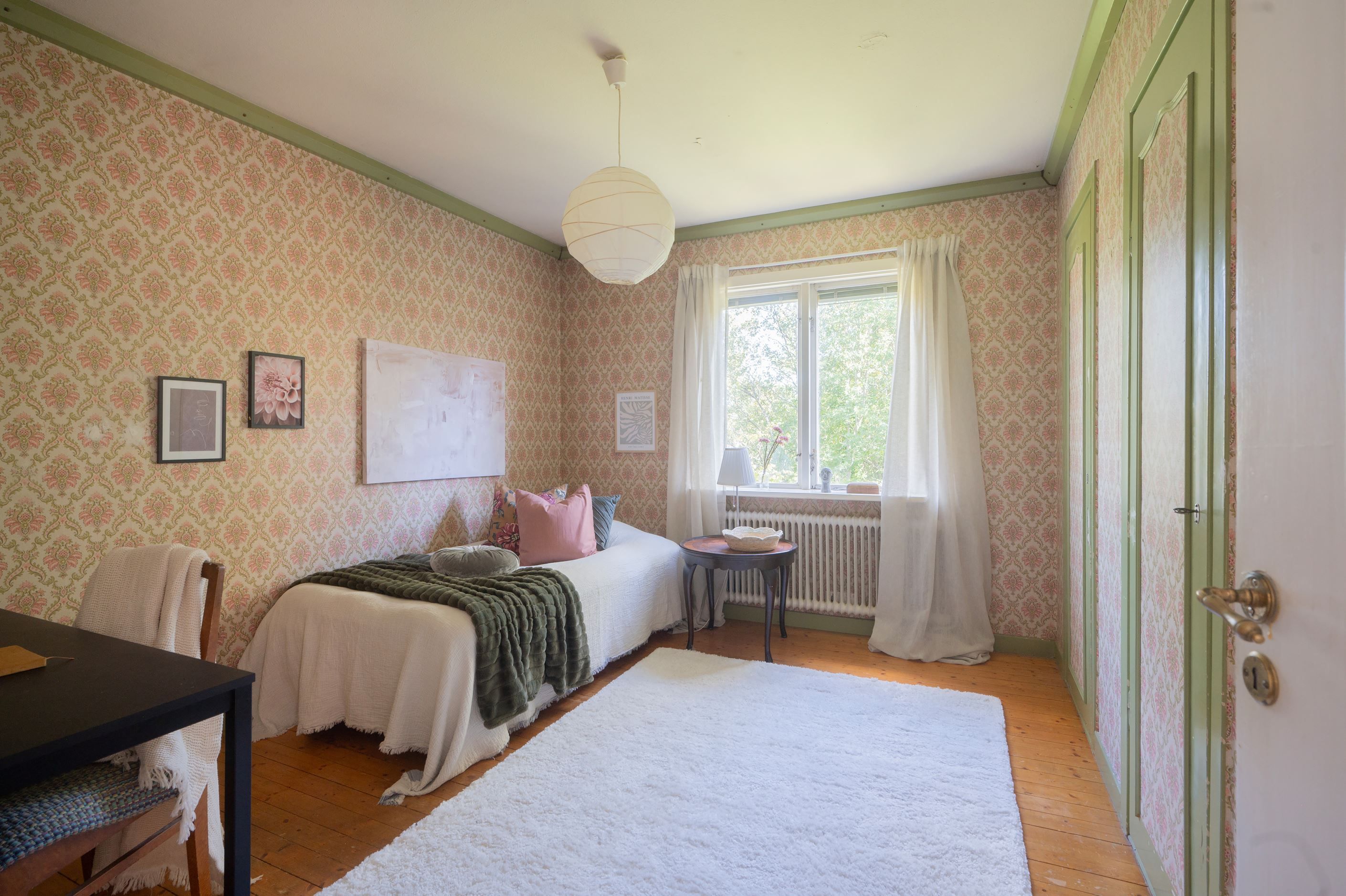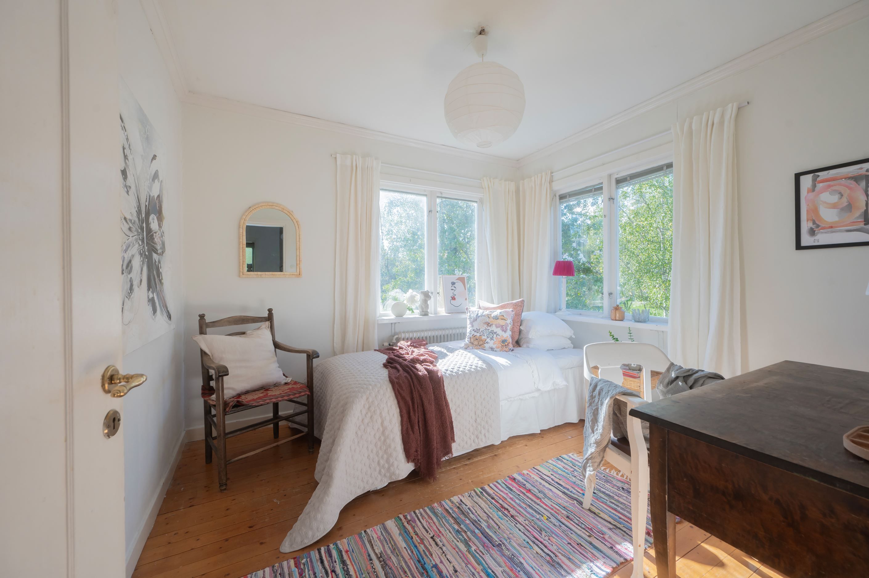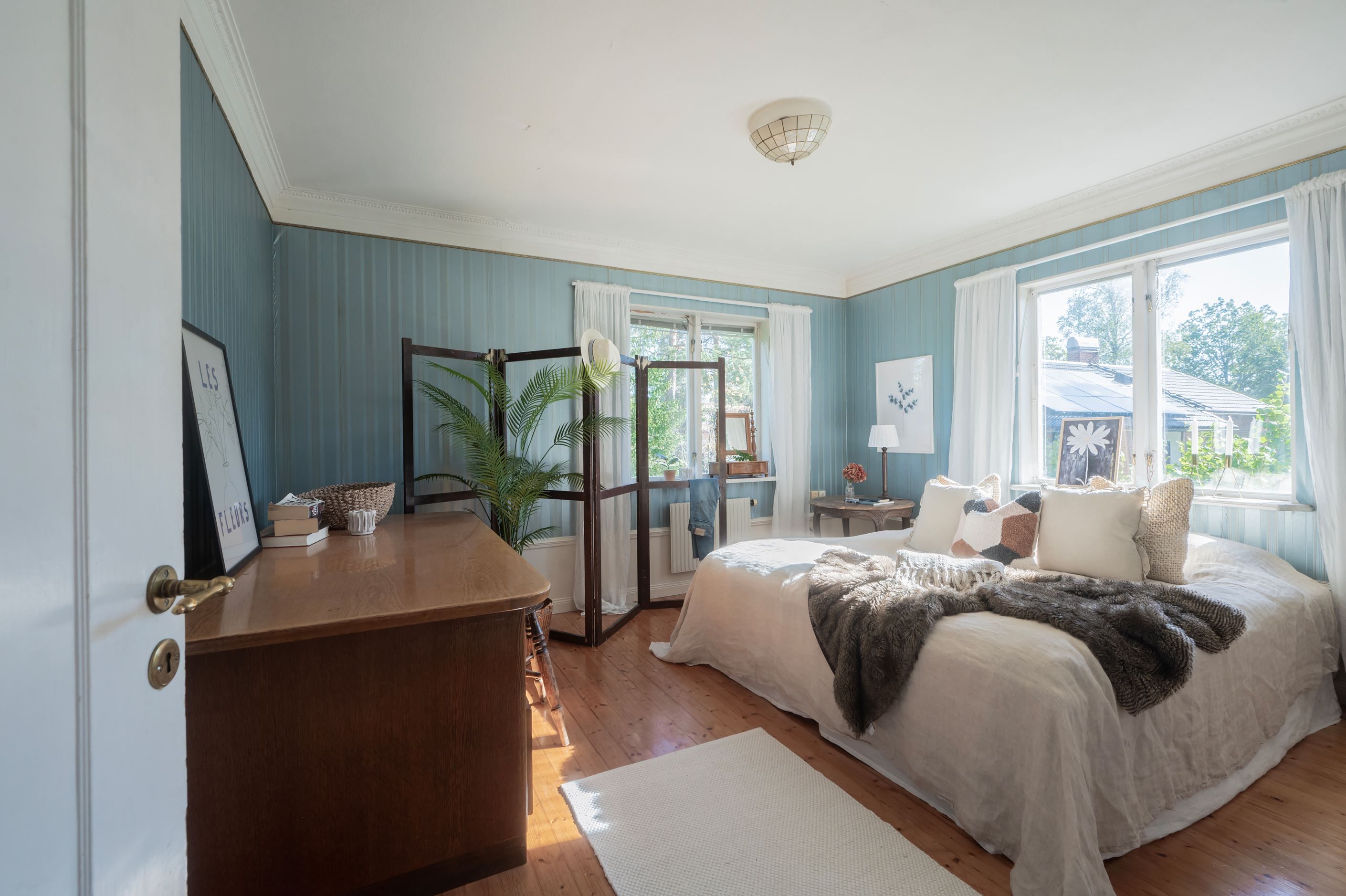 På övre plan finner du tre rymliga sovrum med generösa fönsterpartier som ger ett vackert ljusinsläpp. Här finns också ett badrum som i dagsläget är ombyggt till WC, men som enkelt kan återställas till dusch eller badrumsfunktion.