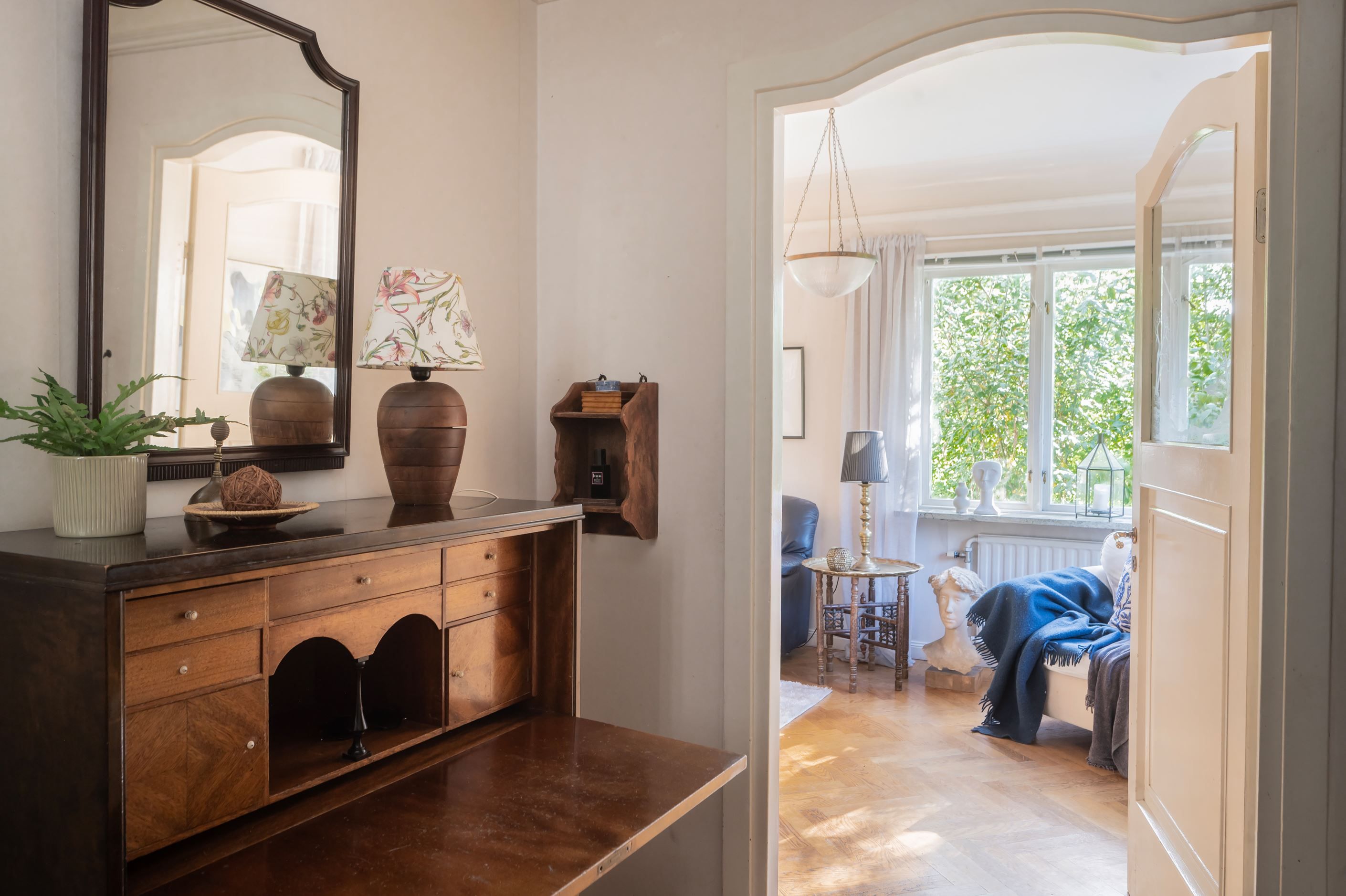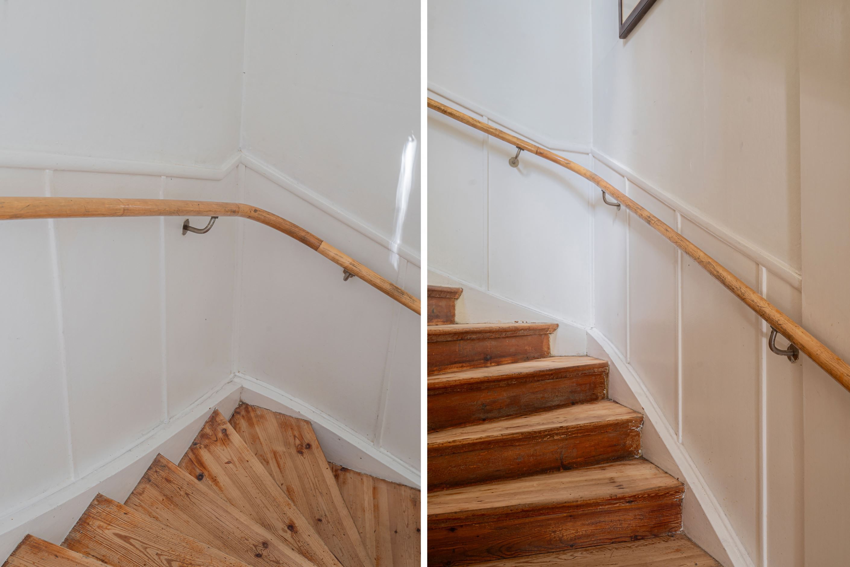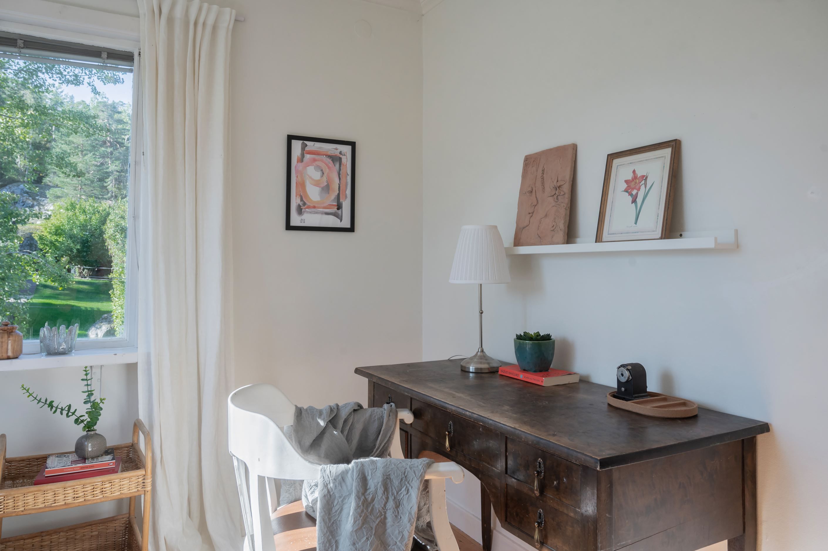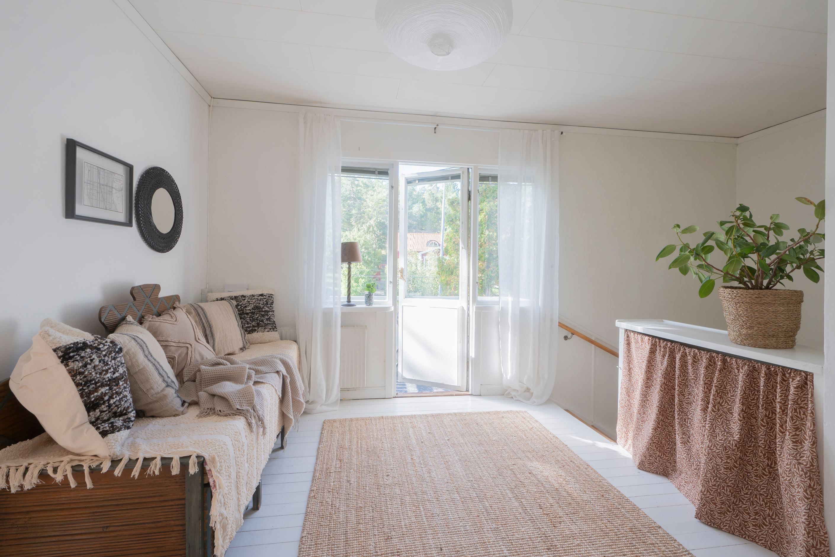 På övre plan finner du tre rymliga sovrum med generösa fönsterpartier som ger ett vackert ljusinsläpp. Här finns också ett badrum som i dagsläget är ombyggt till WC, men som enkelt kan återställas till dusch eller badrumsfunktion.