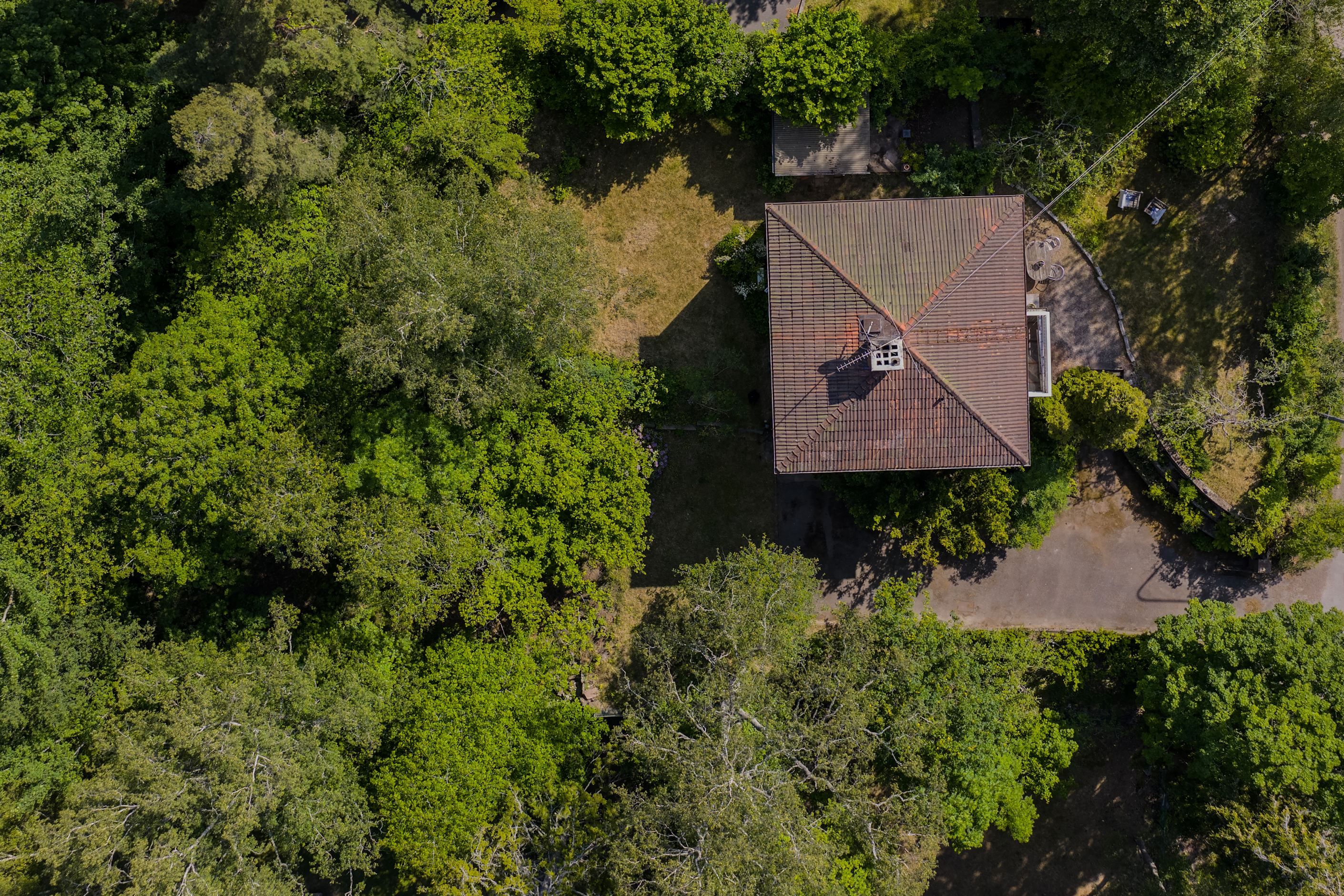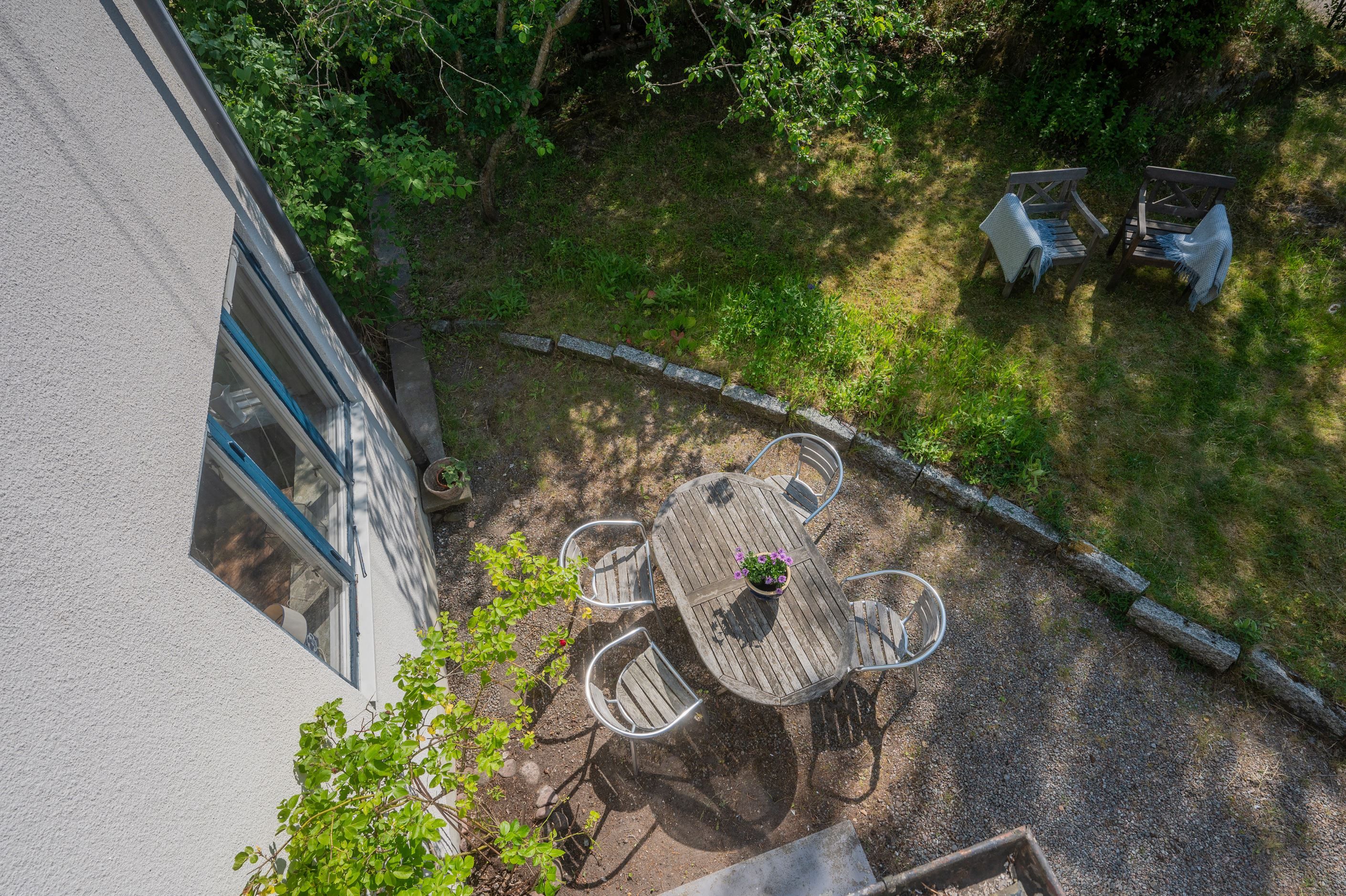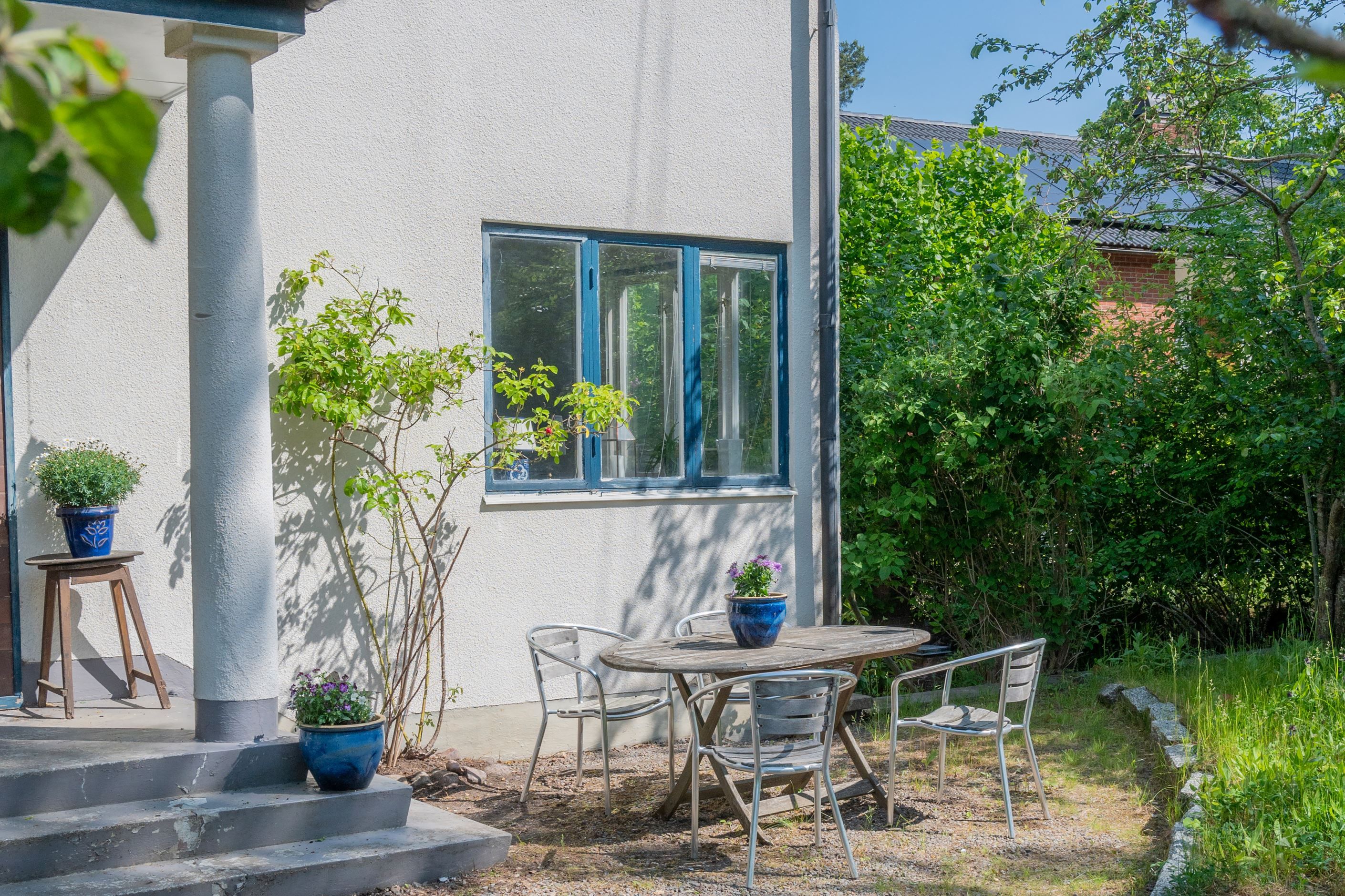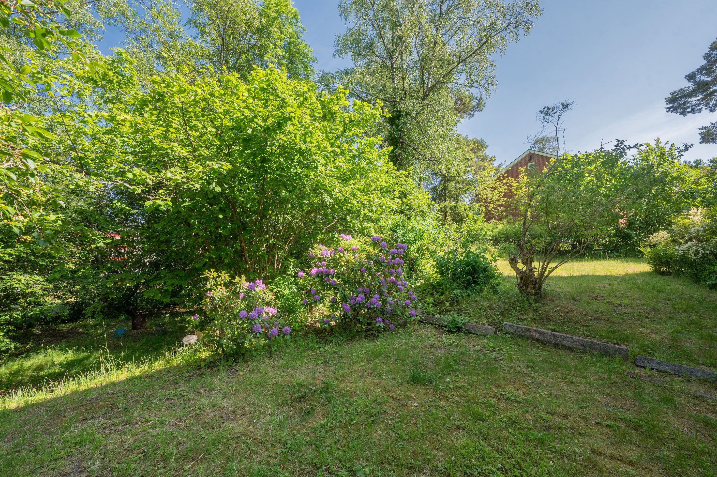 Den uppvuxna tomten omger huset med grönska och insynsskydd, vilket ger en härlig miljö för både lek och avkoppling.