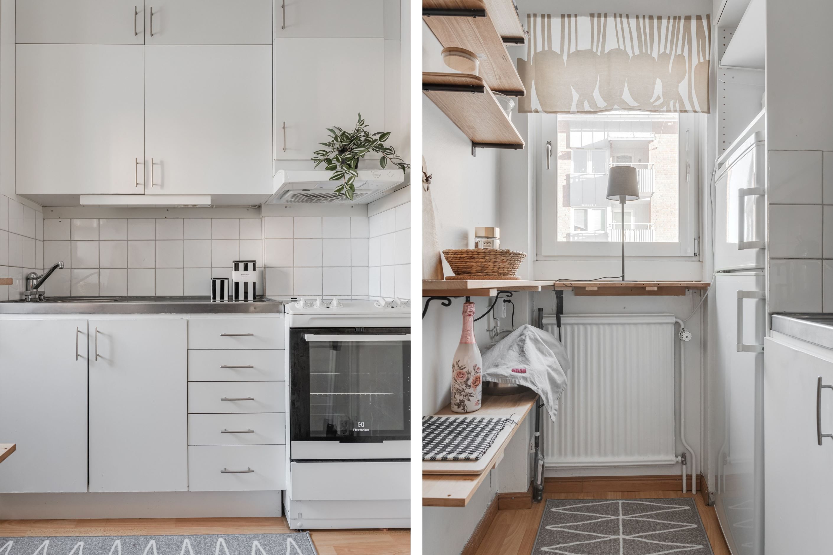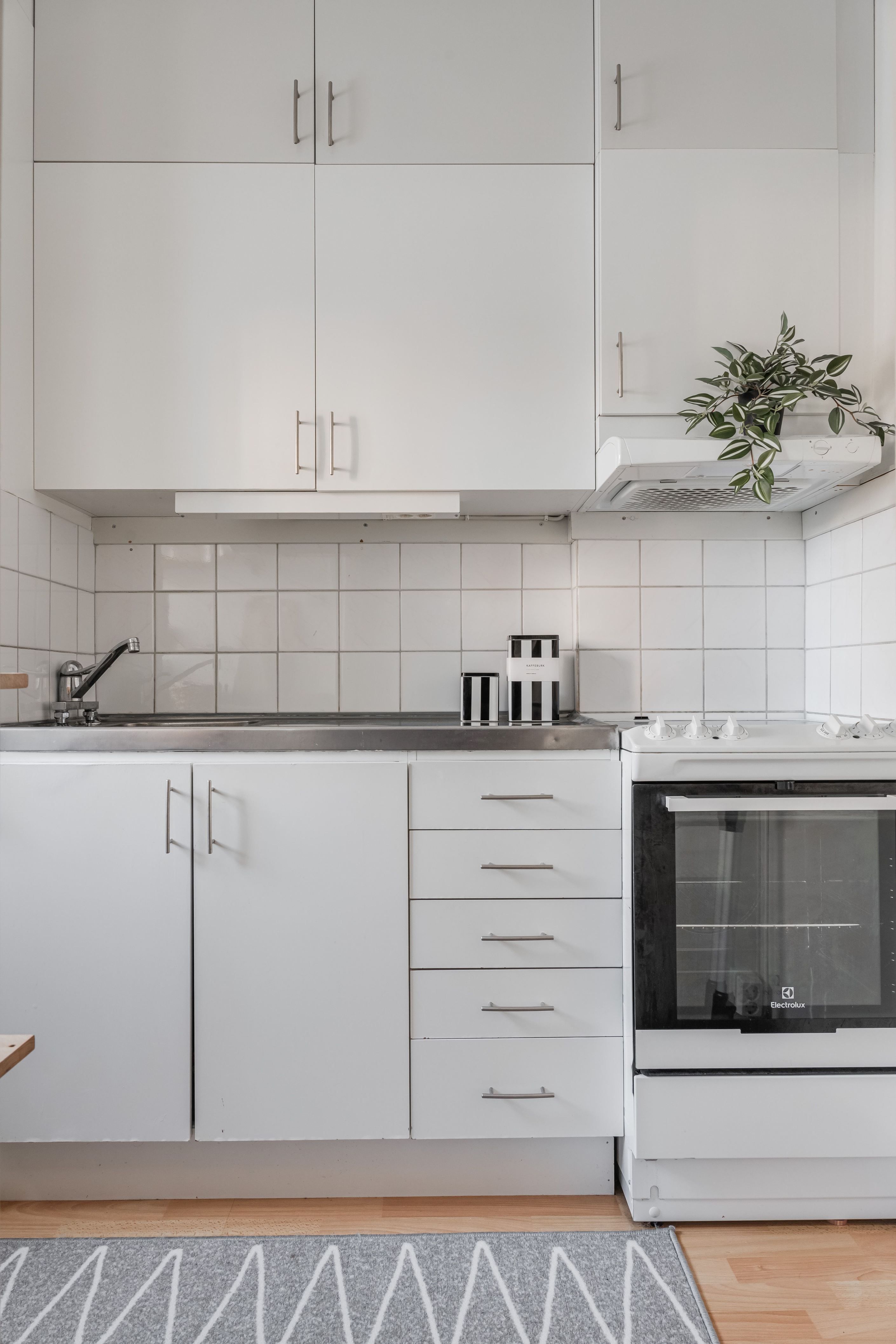 Det separata köket är funktionellt utrustat med spis, kombinerad kyl/frys och köksfläkt – allt du behöver för en smidig vardag. Genomgående laminatgolv i hall, allrum, sovalkov och kök ger bostaden ett enhetligt och lättskött intryck.