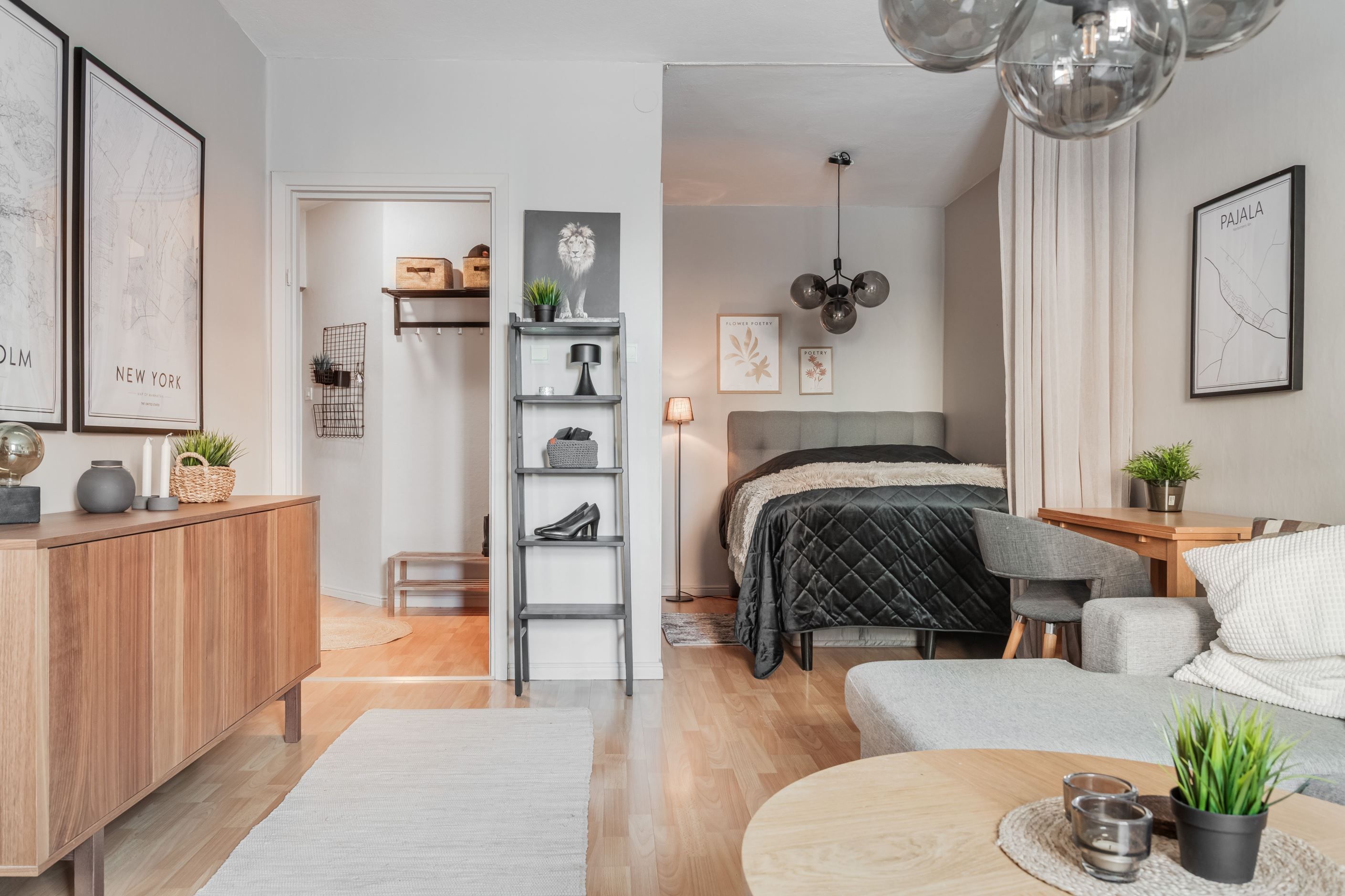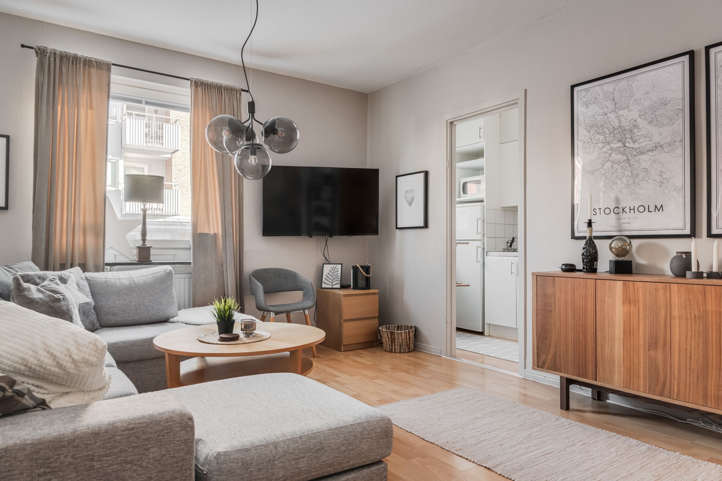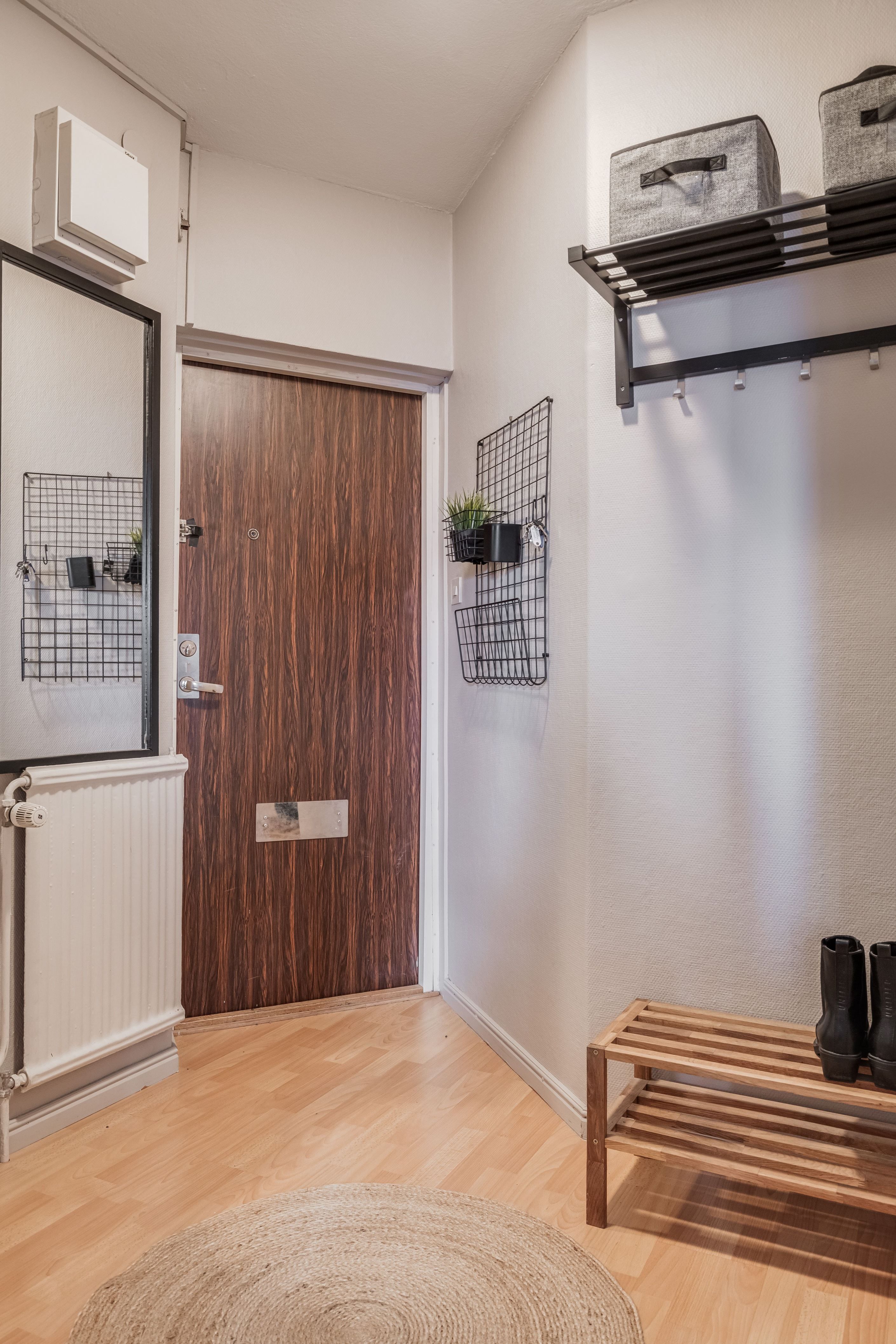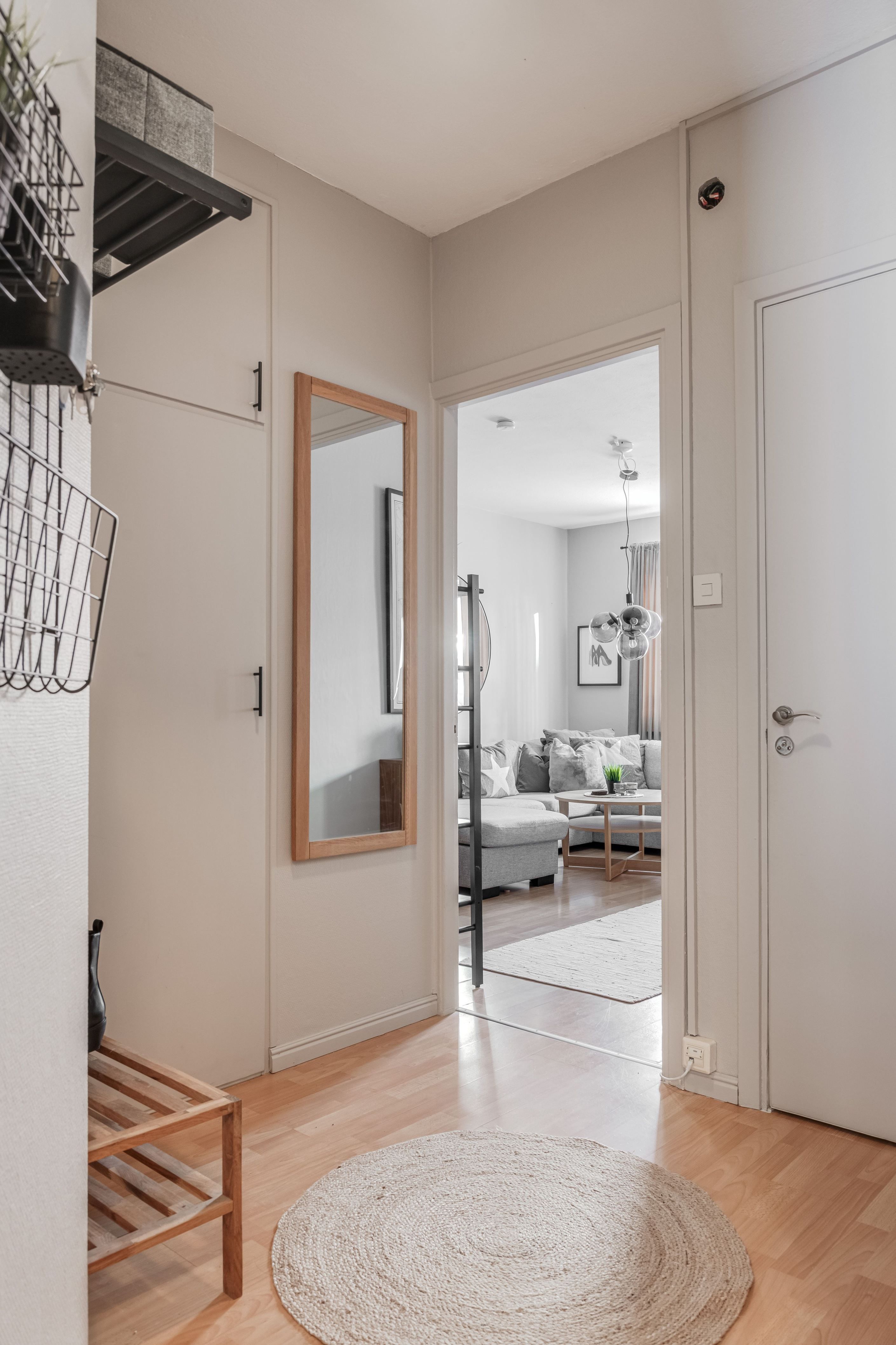 Lägenheten erbjuder en rymlig och inbjudande hall med gott om förvaring tack vare flera garderober samt praktiskt utrymme för skor och ytterkläder. Vidare möts du av ett ljust och lättmöblerat allrum med sovalkov som skapar en naturlig och avskild sovdel.