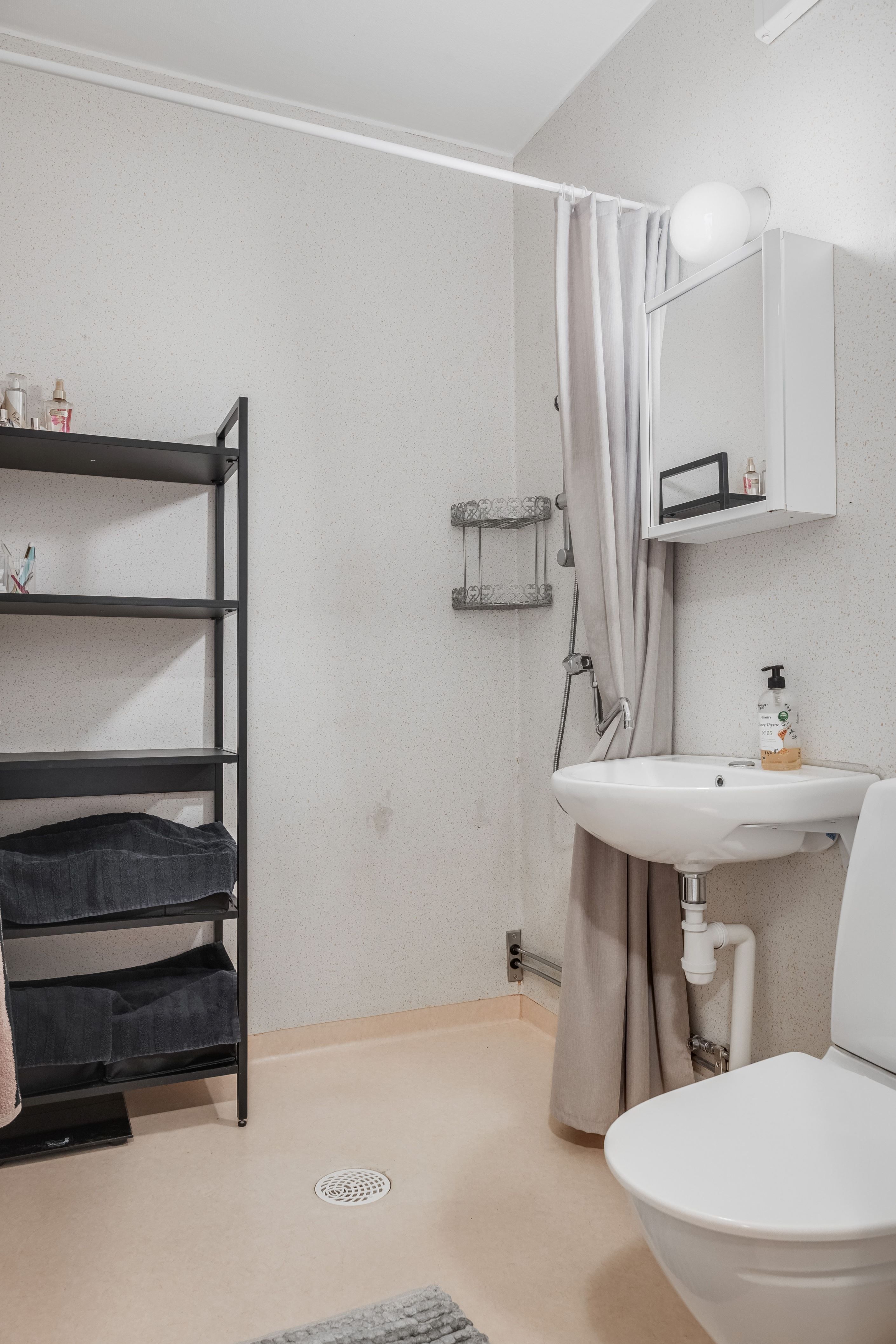Badrummet är praktiskt utformat med våtrumsmatta på både golv och väggar samt utrustat med dusch, handfat och toalett.