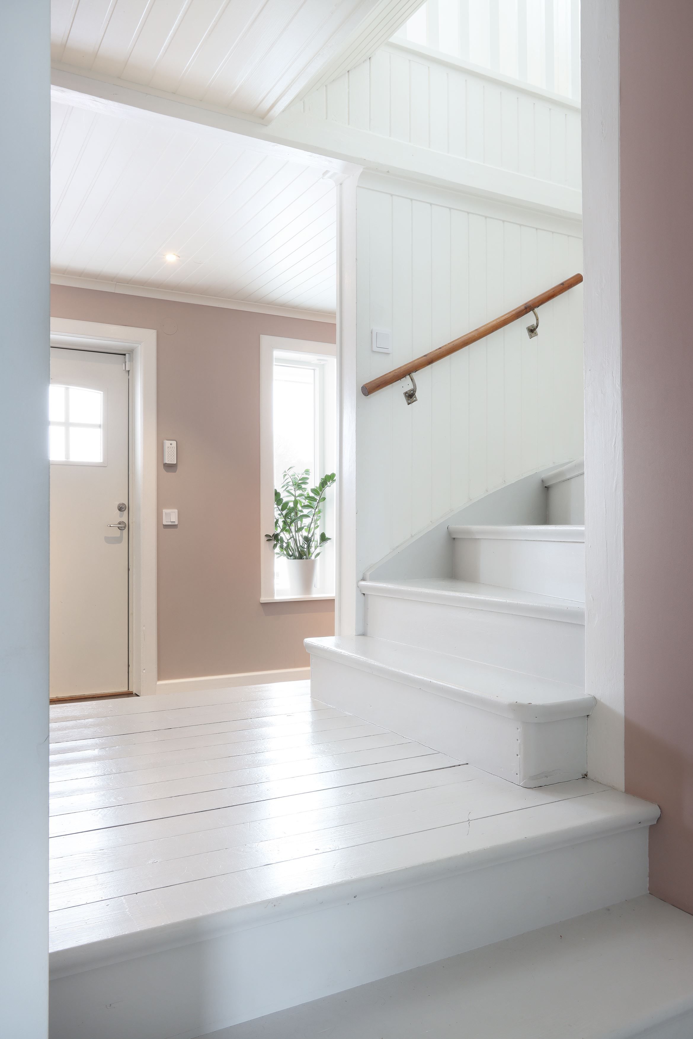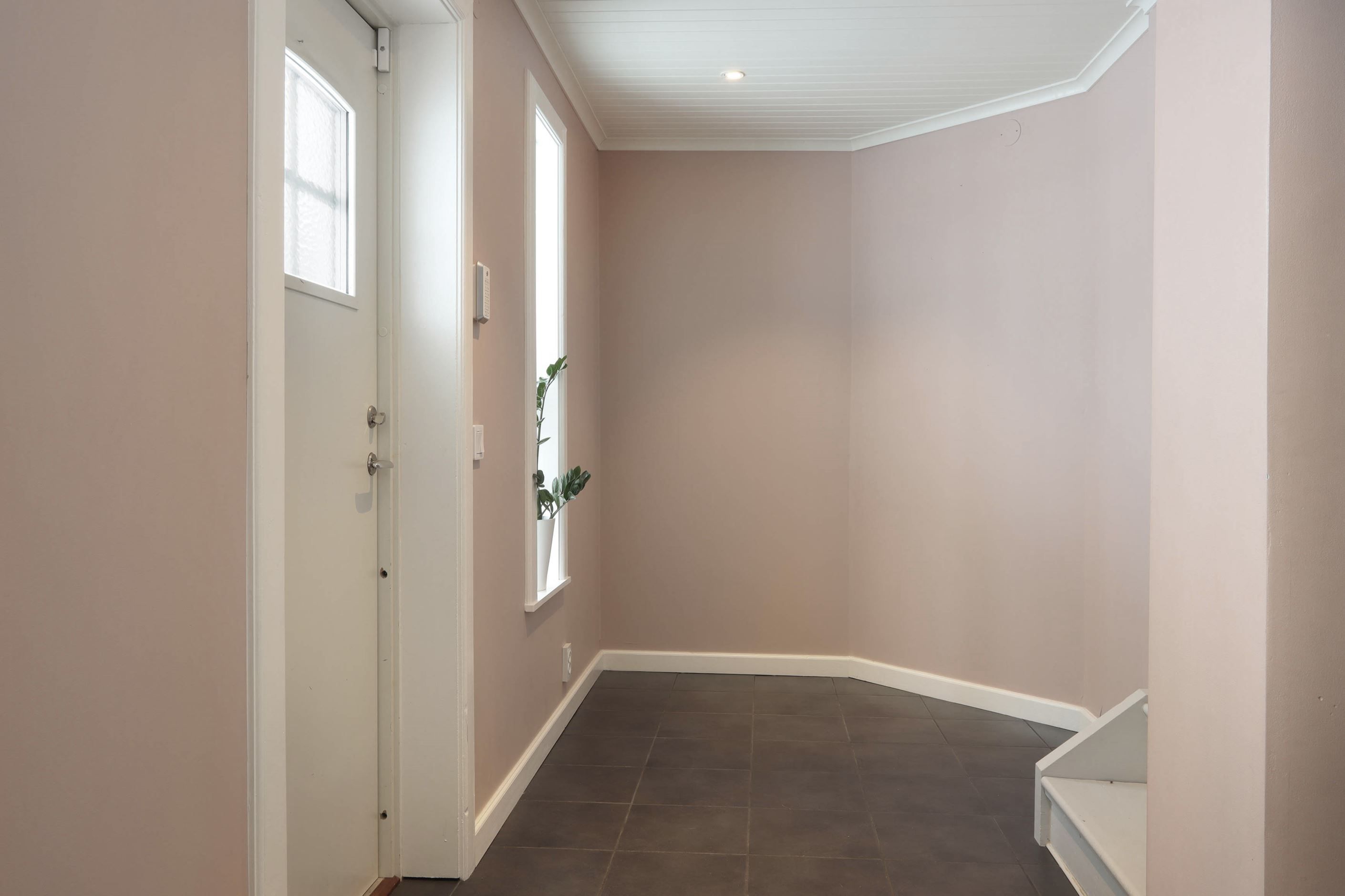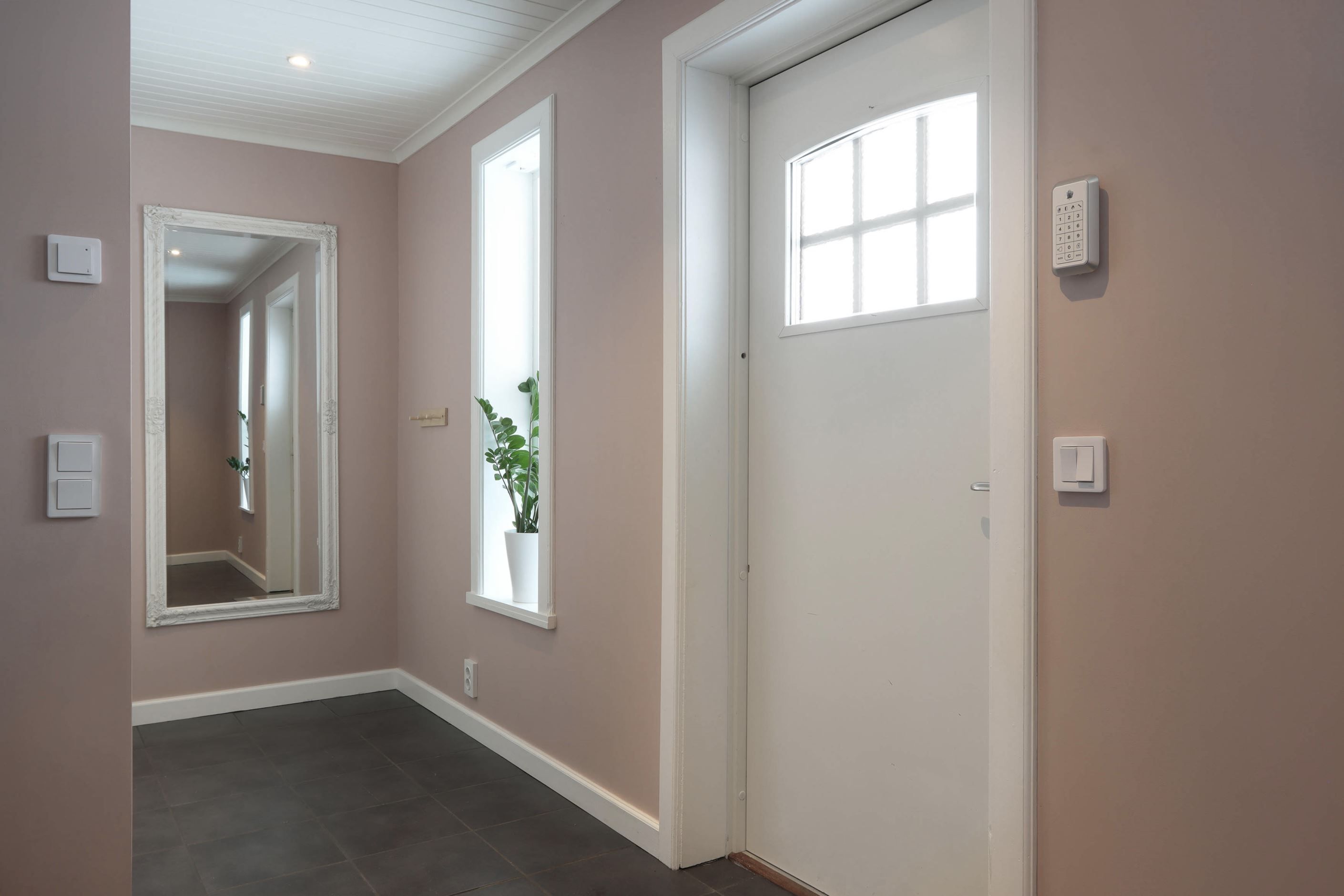 Huset bjuder verkligen på fina och stora ytor. När du kliver in genom entrén möts du av ett grått klinkergolv med elektrisk golvvärme, hallen är mycket välkomnande och har goda förvaringsmöjligheter.