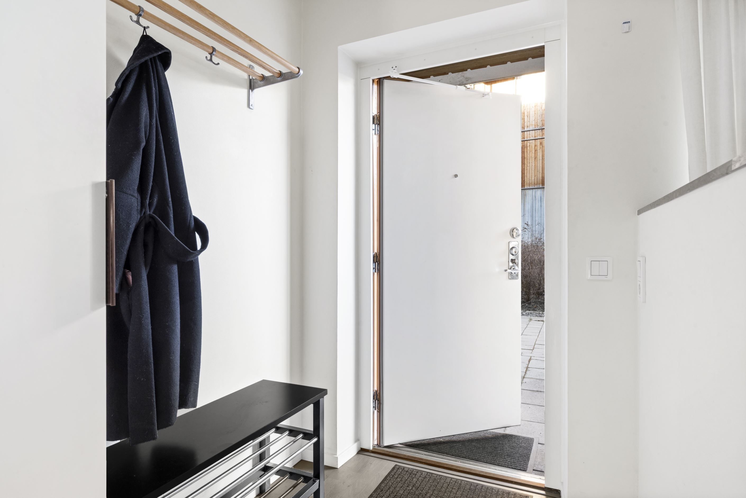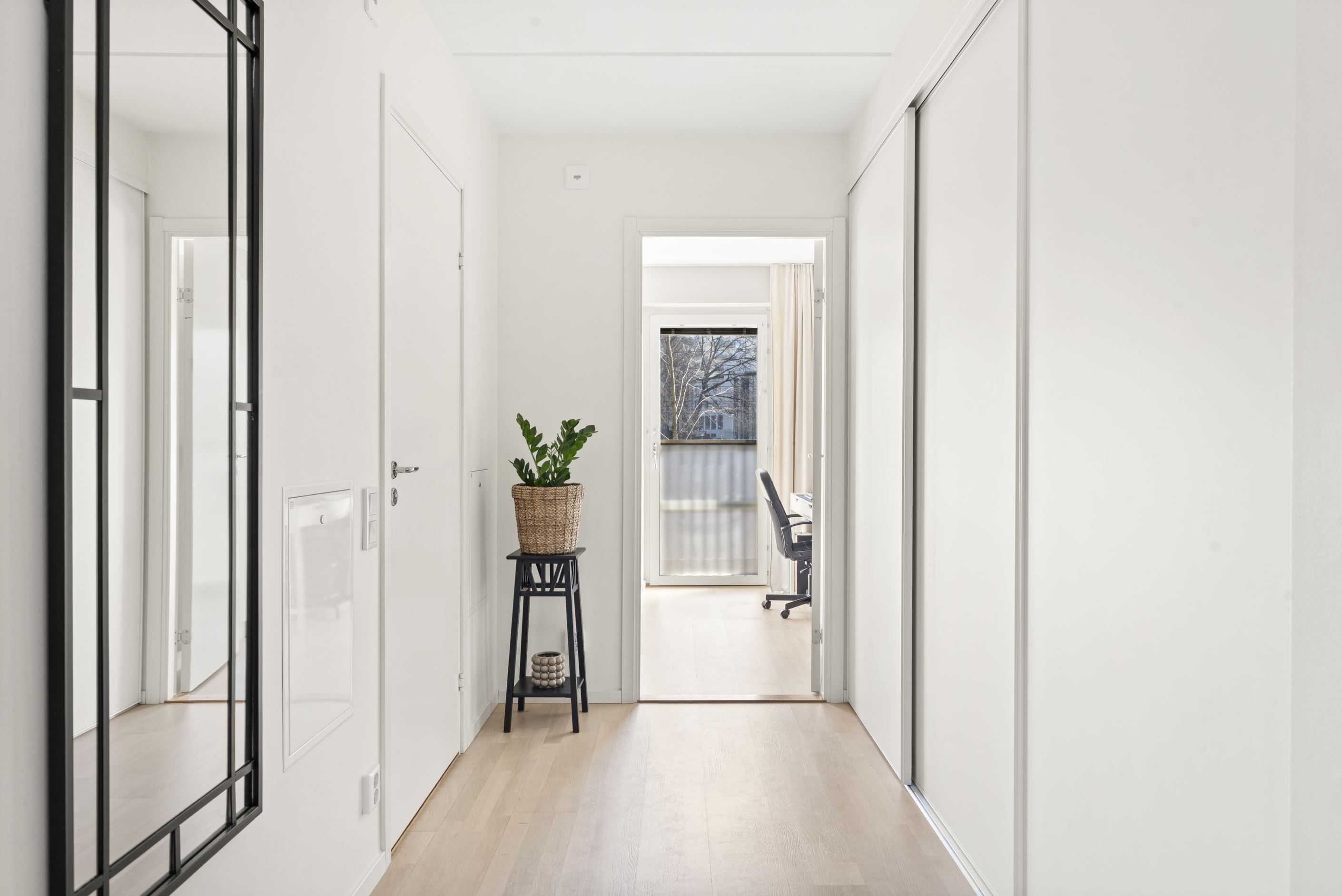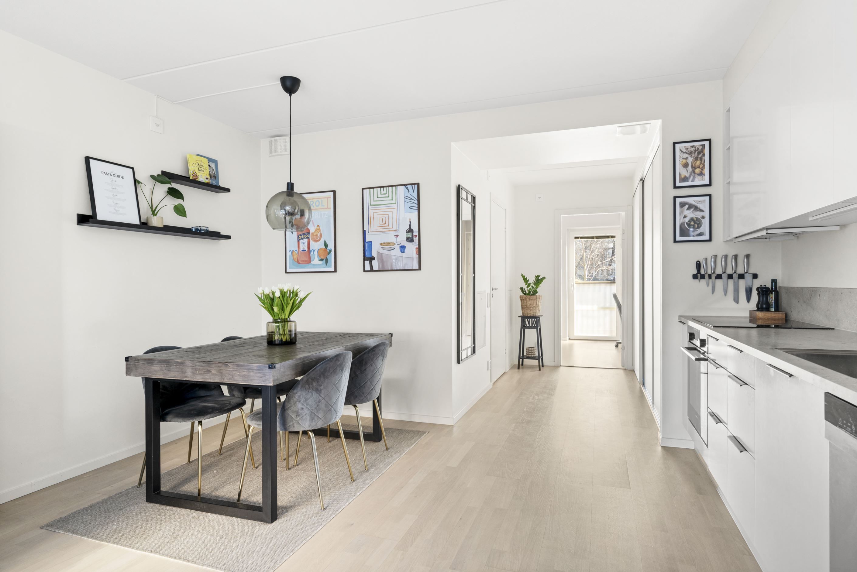 Den välkomnande hallen erbjuder goda förvaringsmöjligheter och leder vidare in i bostadens sociala ytor. Här möts du av ett modernt kök i social öppen planlösning mot vardagsrum och matplats – en naturlig samlingsplats med gott om utrymme för både vardag och umgänge.