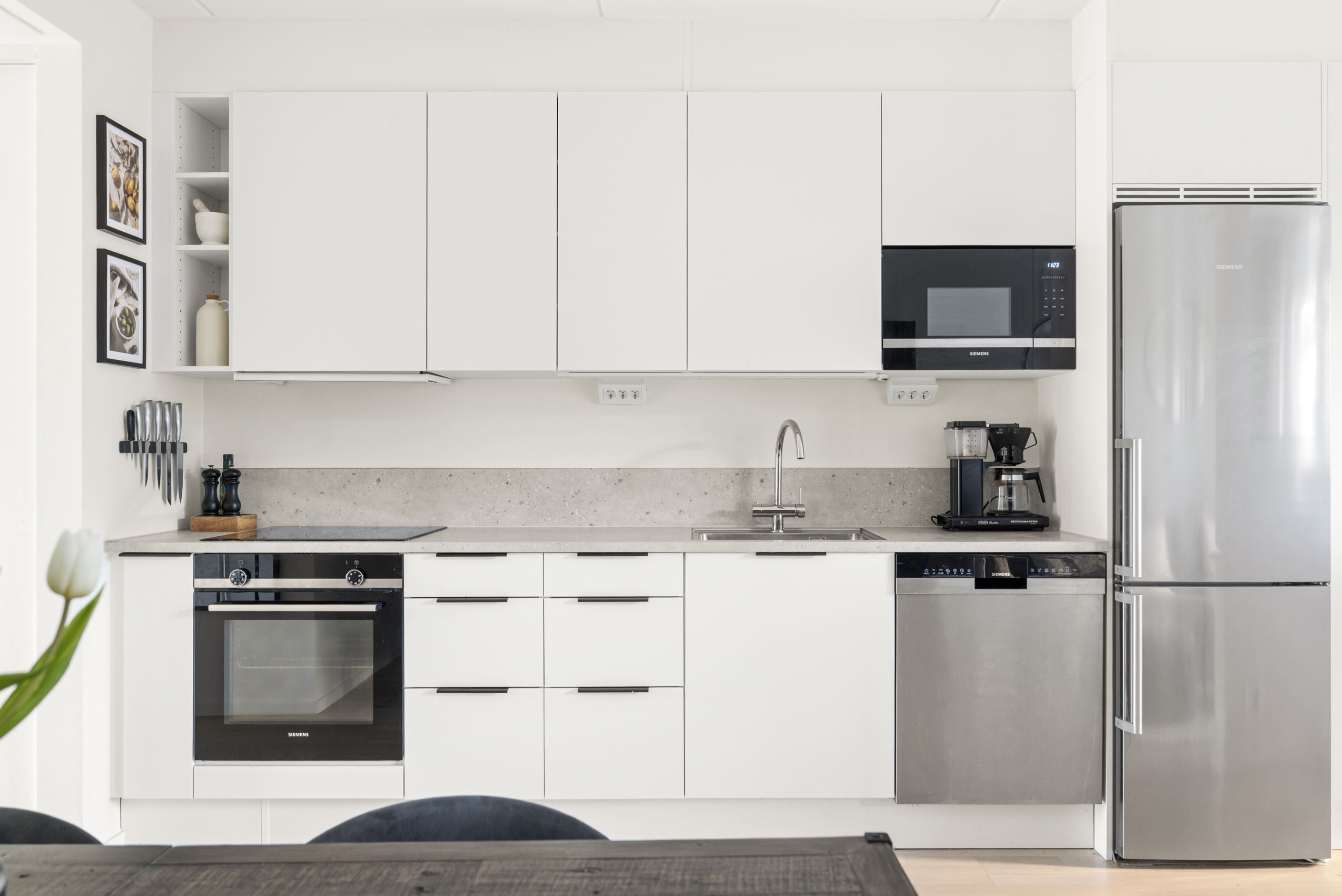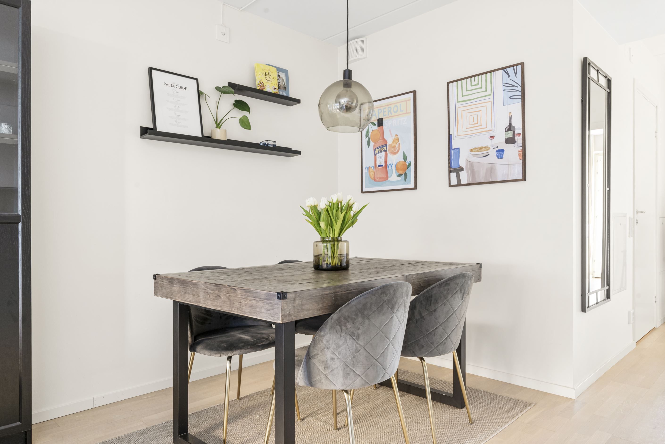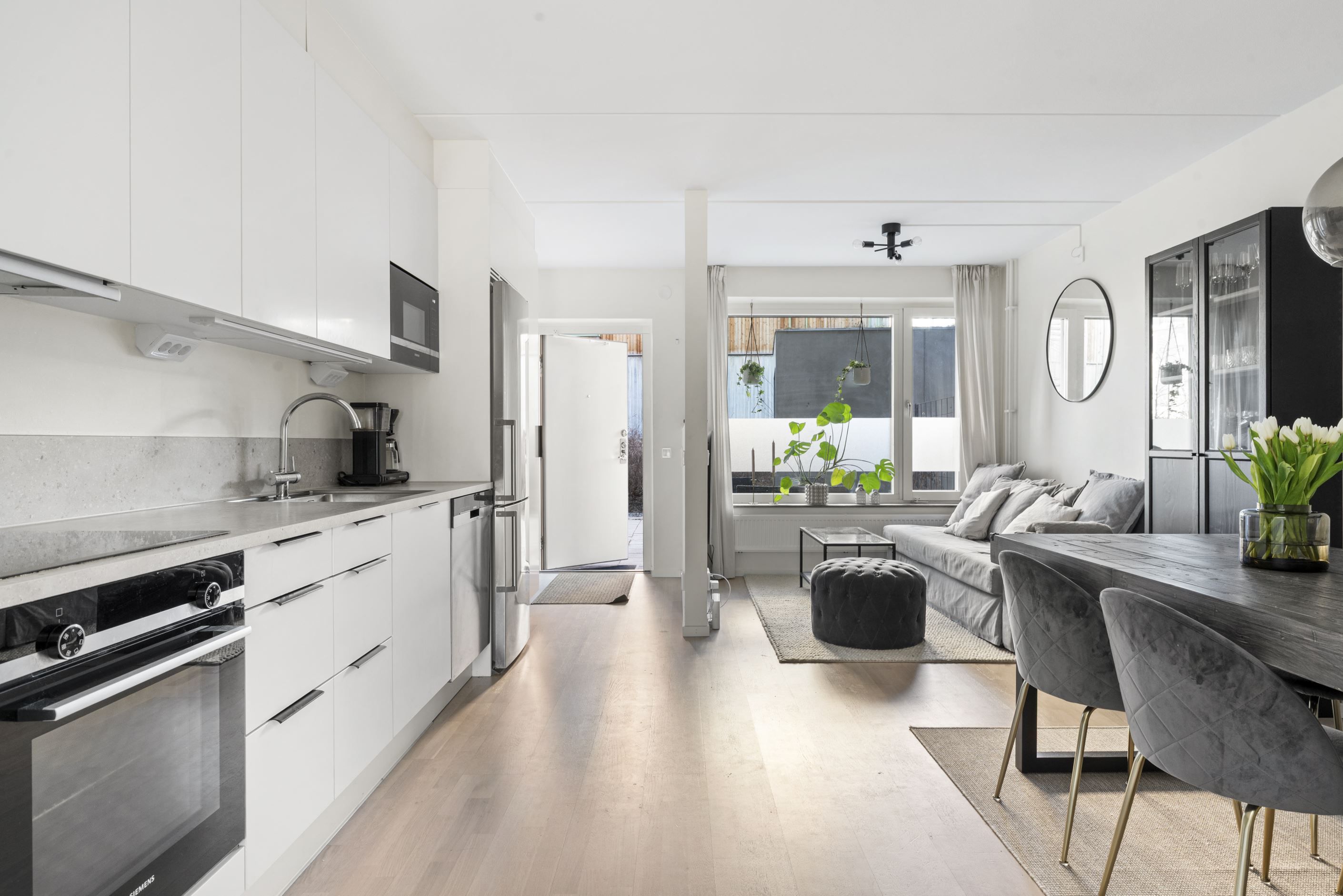 Den välkomnande hallen erbjuder goda förvaringsmöjligheter och leder vidare in i bostadens sociala ytor. Här möts du av ett modernt kök i social öppen planlösning mot vardagsrum och matplats – en naturlig samlingsplats med gott om utrymme för både vardag och umgänge.