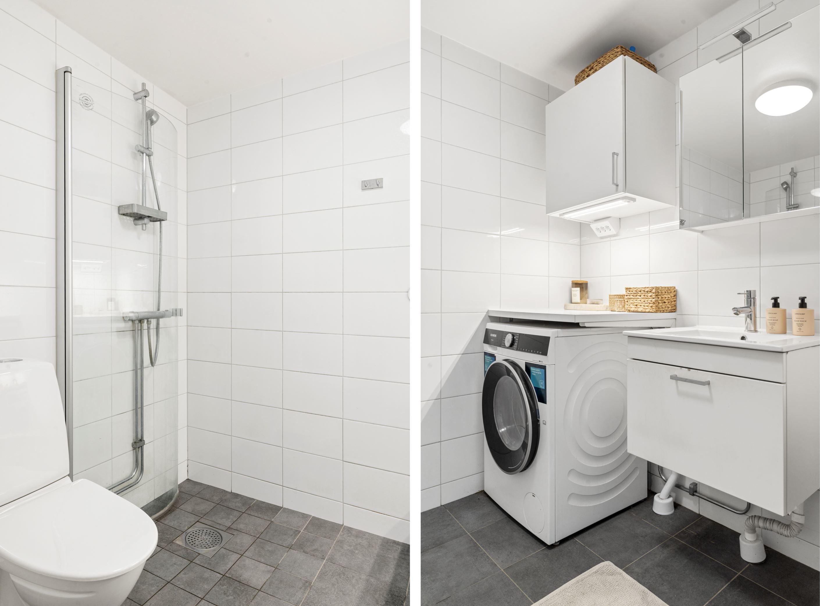 Det stilrena badrummet är utrustat med dusch bakom vikvägg i glas samt en praktisk kombinerad tvätt- och torkmaskin. Utanför badrummet, i passagen mellan kök och sovrum, finns en rymlig skjutdörrsgarderob som ger ytterligare goda förvaringsmöjligheter.