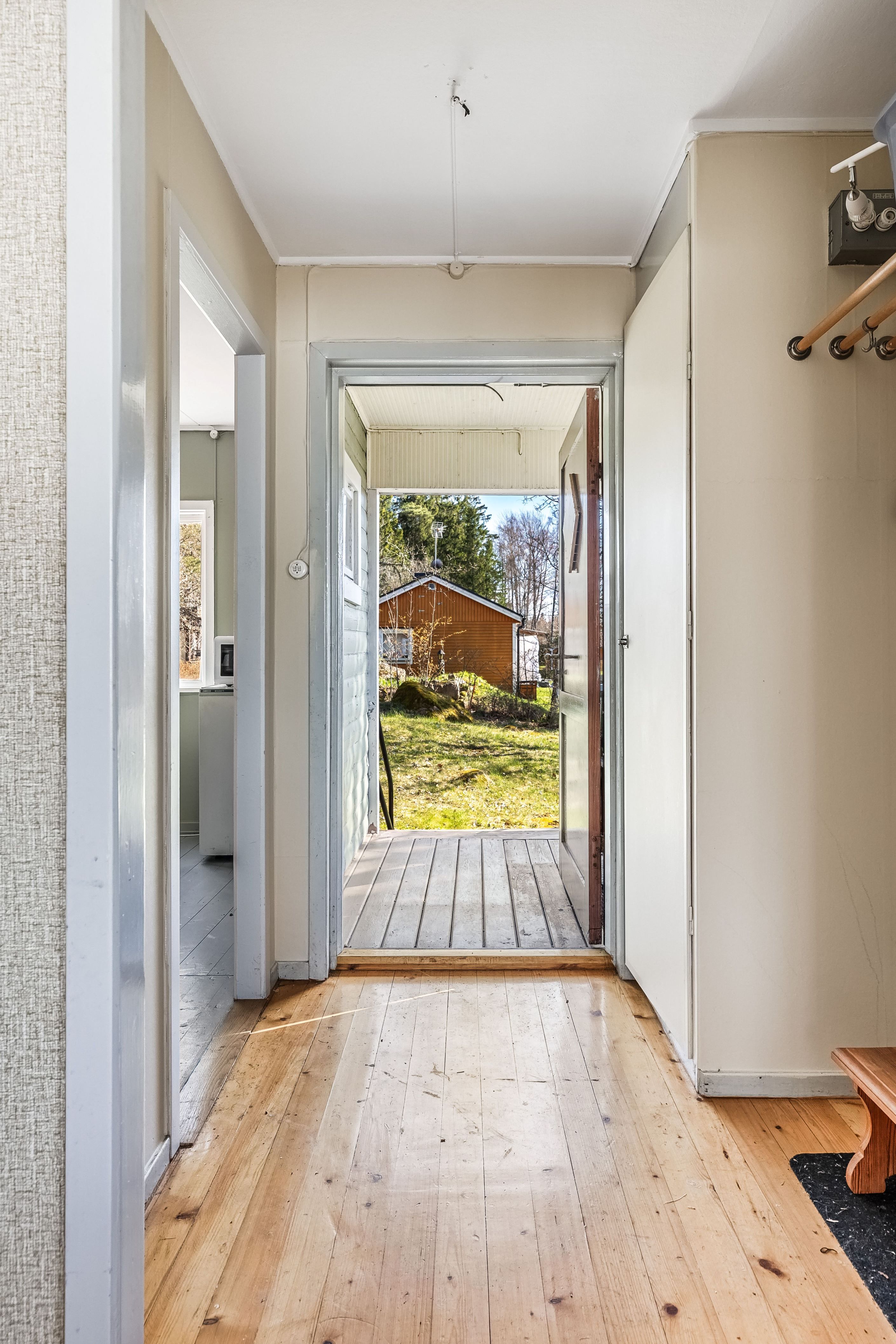 Detta charmiga fritidshus, omgivet av sin egen enskilda vrå av naturlig grönska, strövområden, svamp och bär precis bakom husknuten . Tomten sträcker sig över generösa 1087 kvm och rymmer inte bara huvudbyggnaden utan även ett garage, gäststuga samt jordkällare. Husets träfasad och vita knutar ger en genuin och inbjudande känsla, boningshus med kök, allrum samt ett sovrum. Öppen spis i vardagsrum samt vedspis i matrum. Enkelt kök med ljusgula fronter samt målade väggar i trivsam kulör. Här finns enklare utrustning med kyl, ugn och micro.