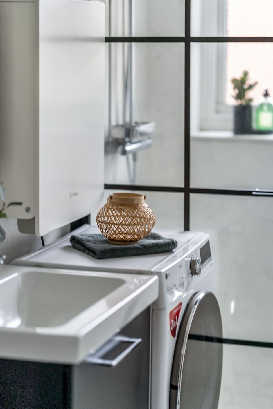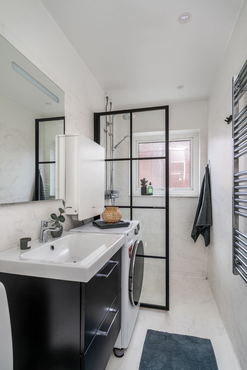 Lägenheten har två trevliga sovrum med inbyggda garderober. Det ljusa och funktionella köket är utrustat med rostfria vitvaror och erbjuder god arbetsyta för matlagning. Duschrummet är renoverat 2019, modernt och stilrent med duschhörna med glasvägg, svart kommod, tvättmaskin, handdukstork och stort fönster med insynsskydd.