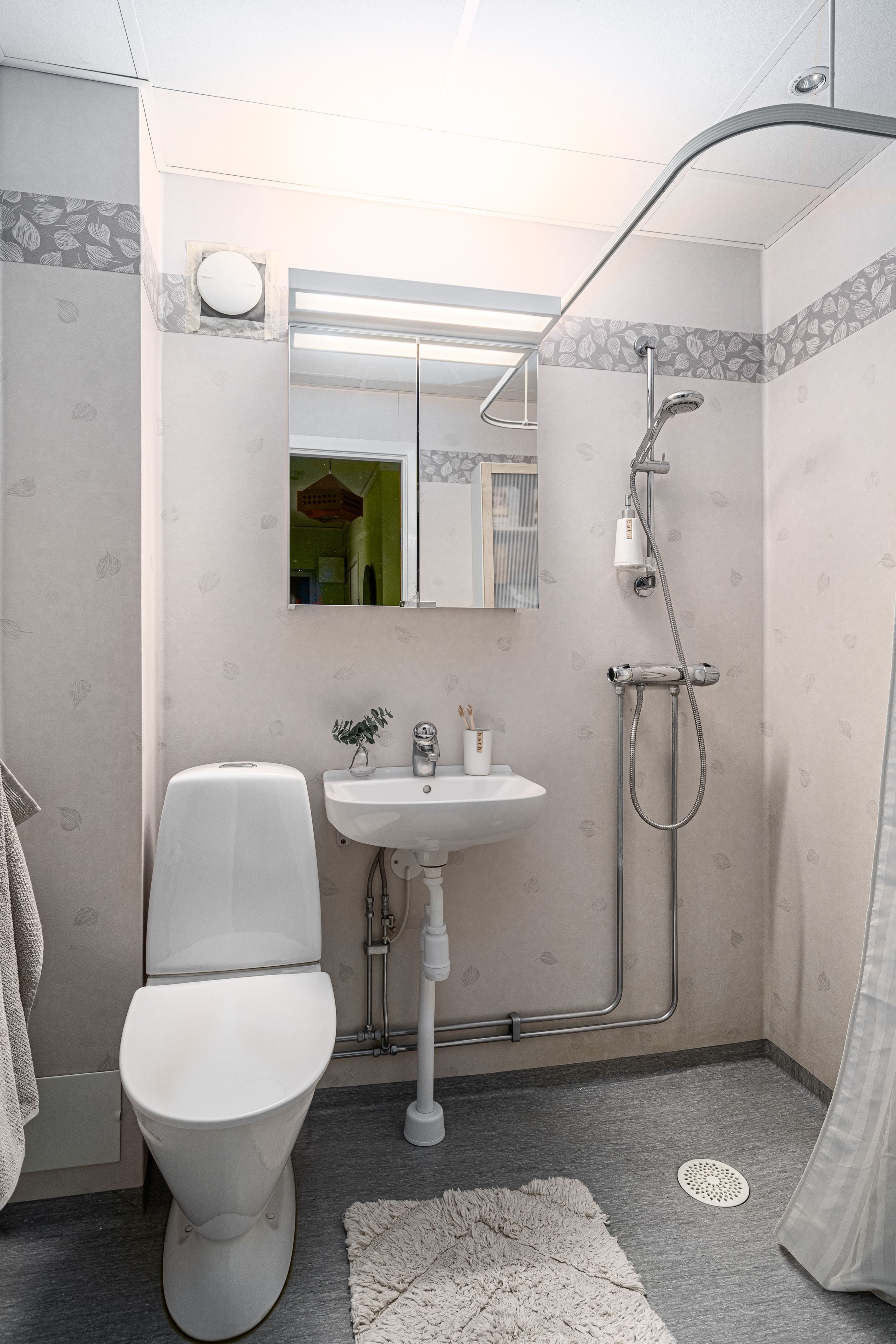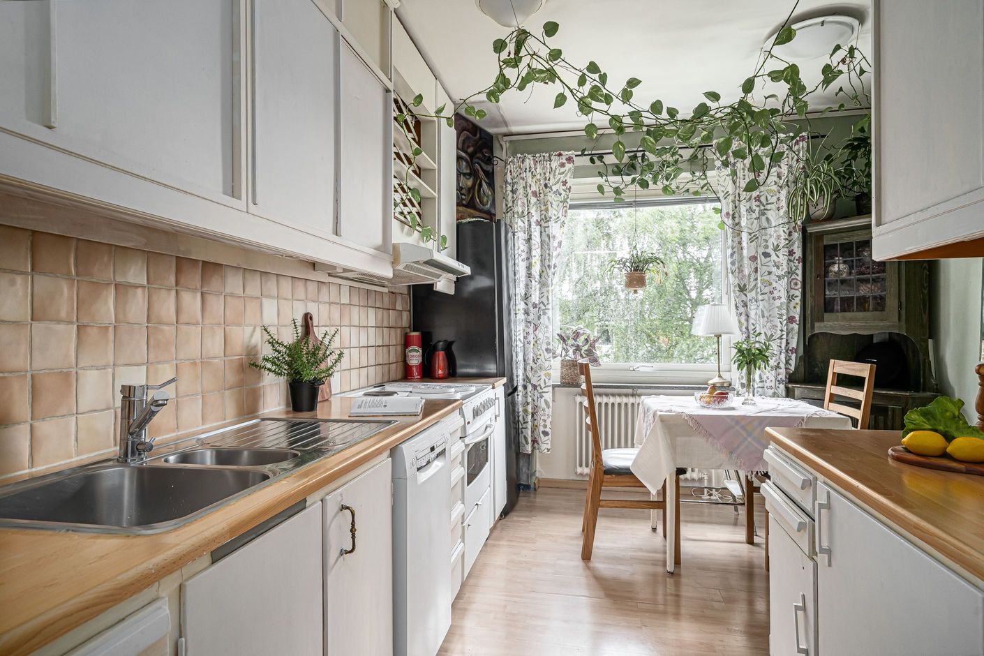 Det praktiska köket erbjuder gott om förvaring, vilket gör vardagen smidig och funktionell. Till lägenheten hör även ett källarförråd som ger extra plats för förvaring.