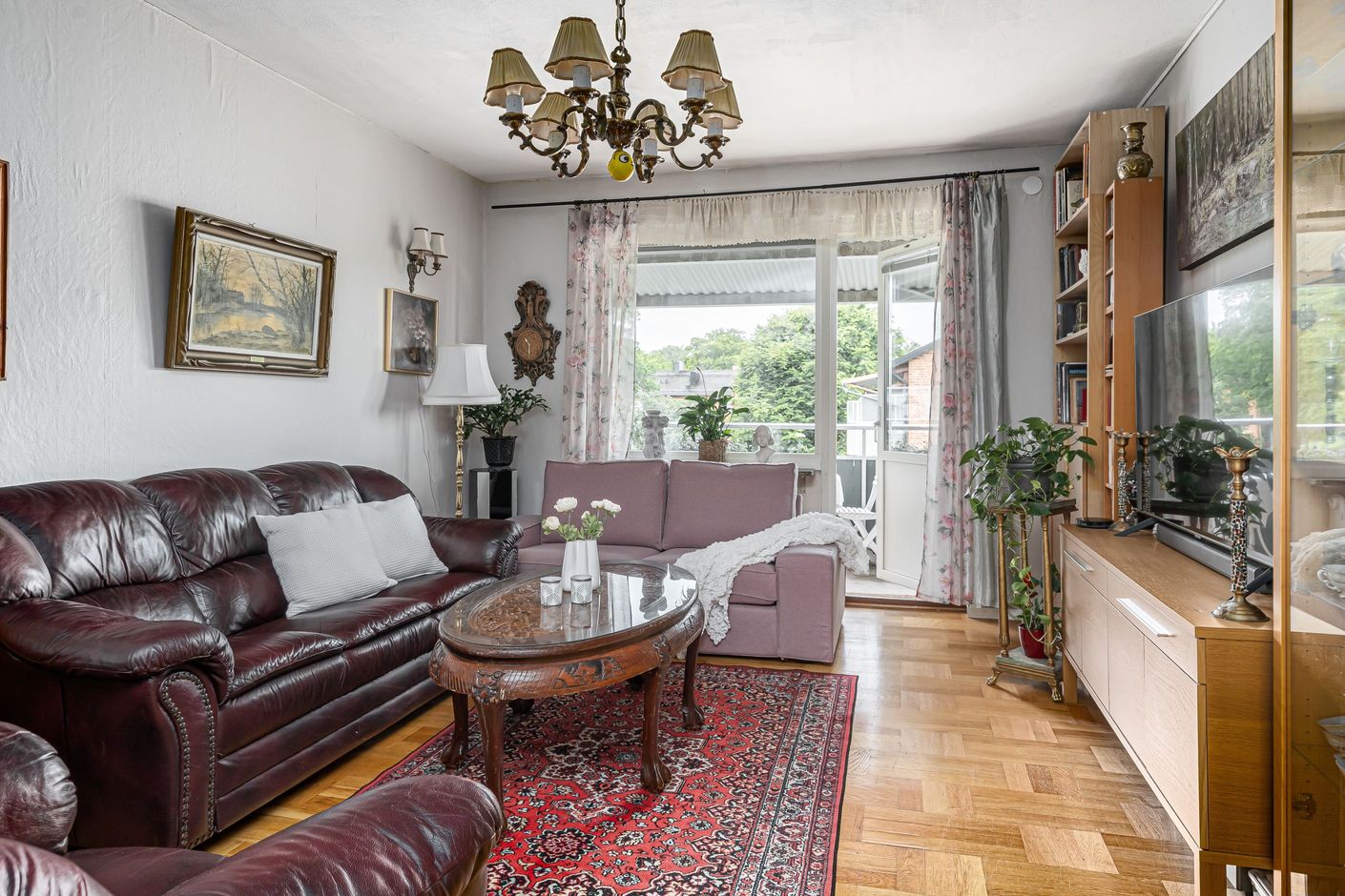 Lägenheten har ett rymligt vardagsrum med stora fönster och utgång till en stor balkong med tak i soligt västerläge – en perfekt plats att njuta av eftermiddagssolen.