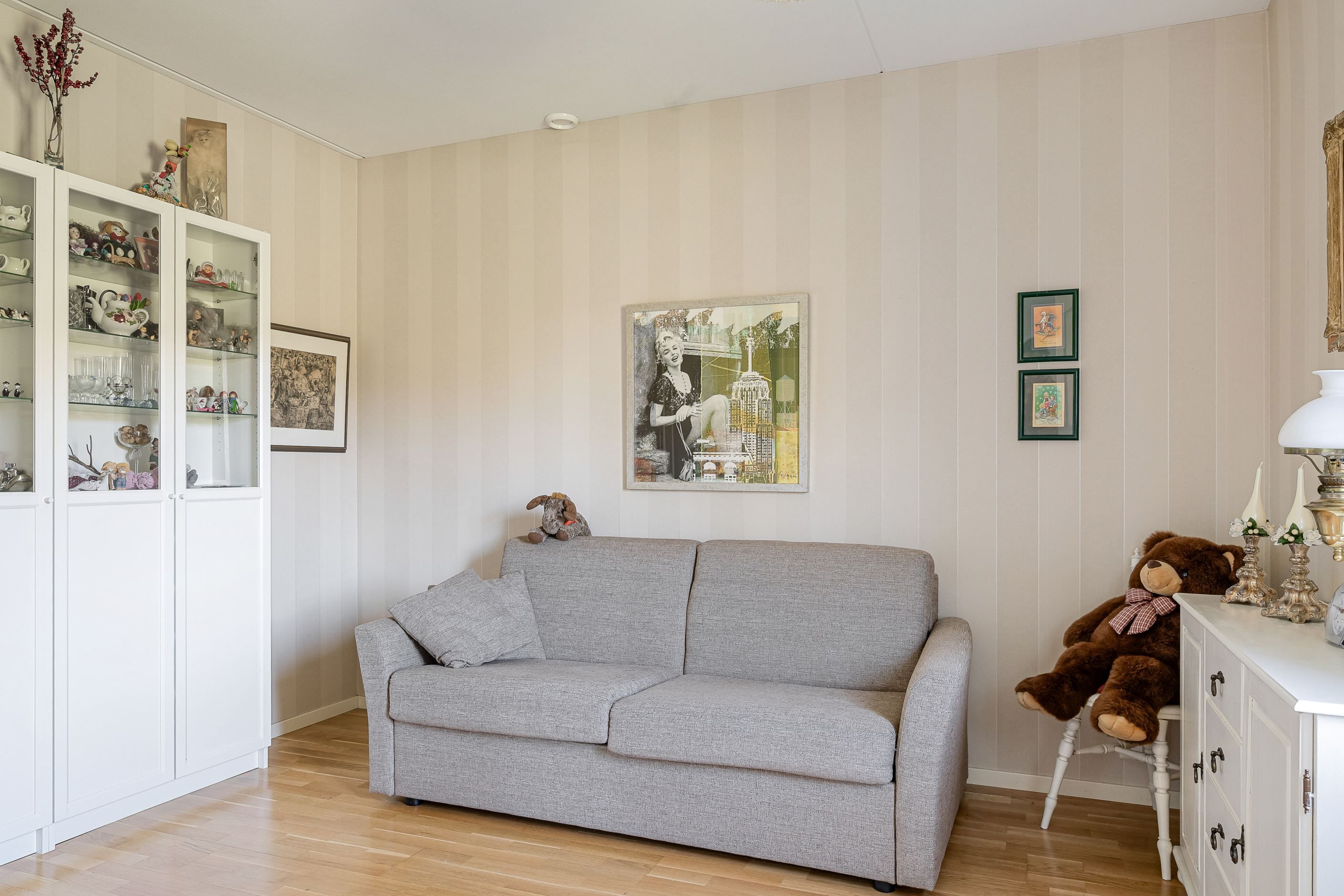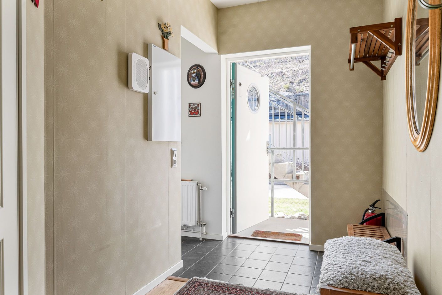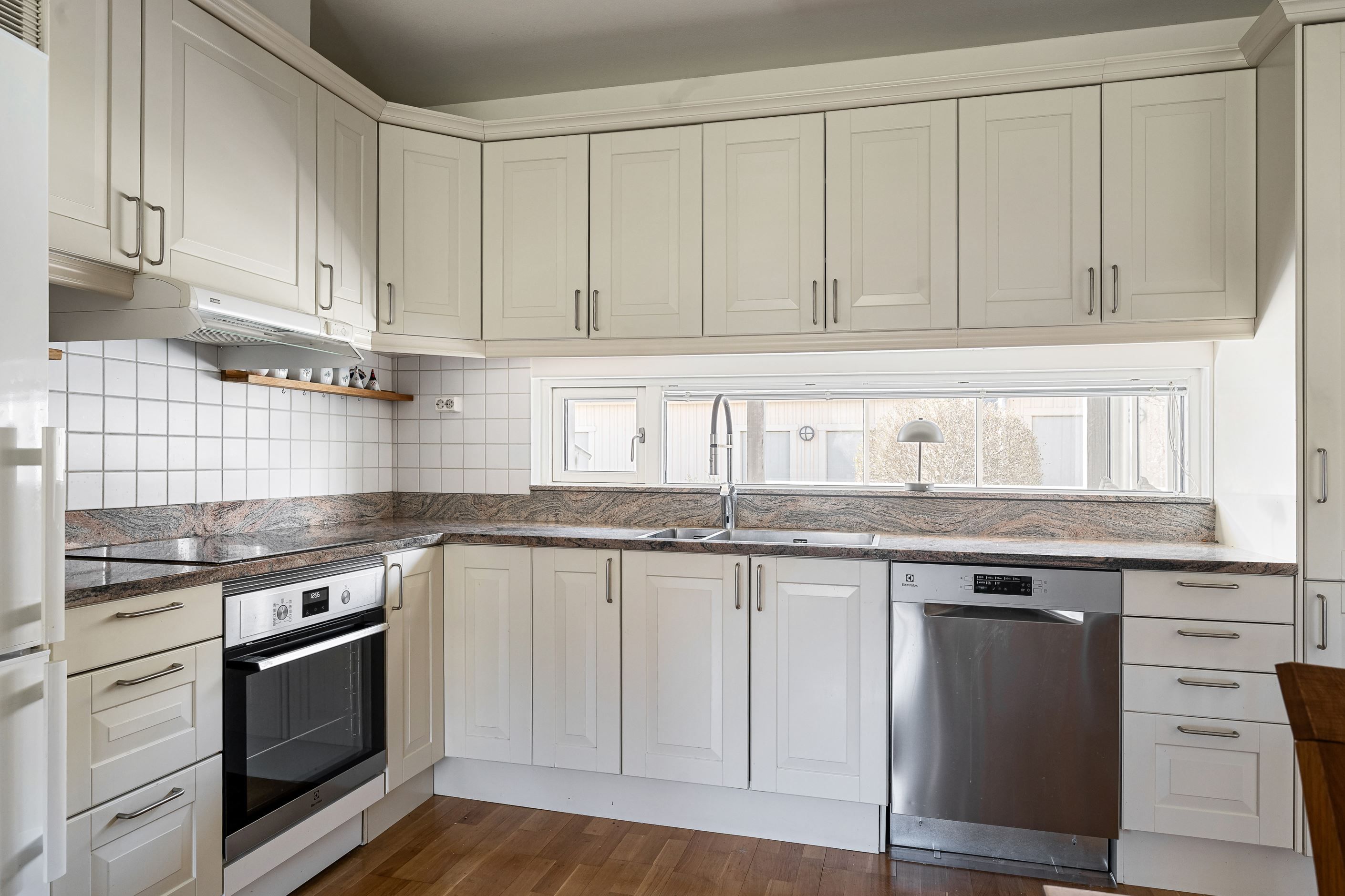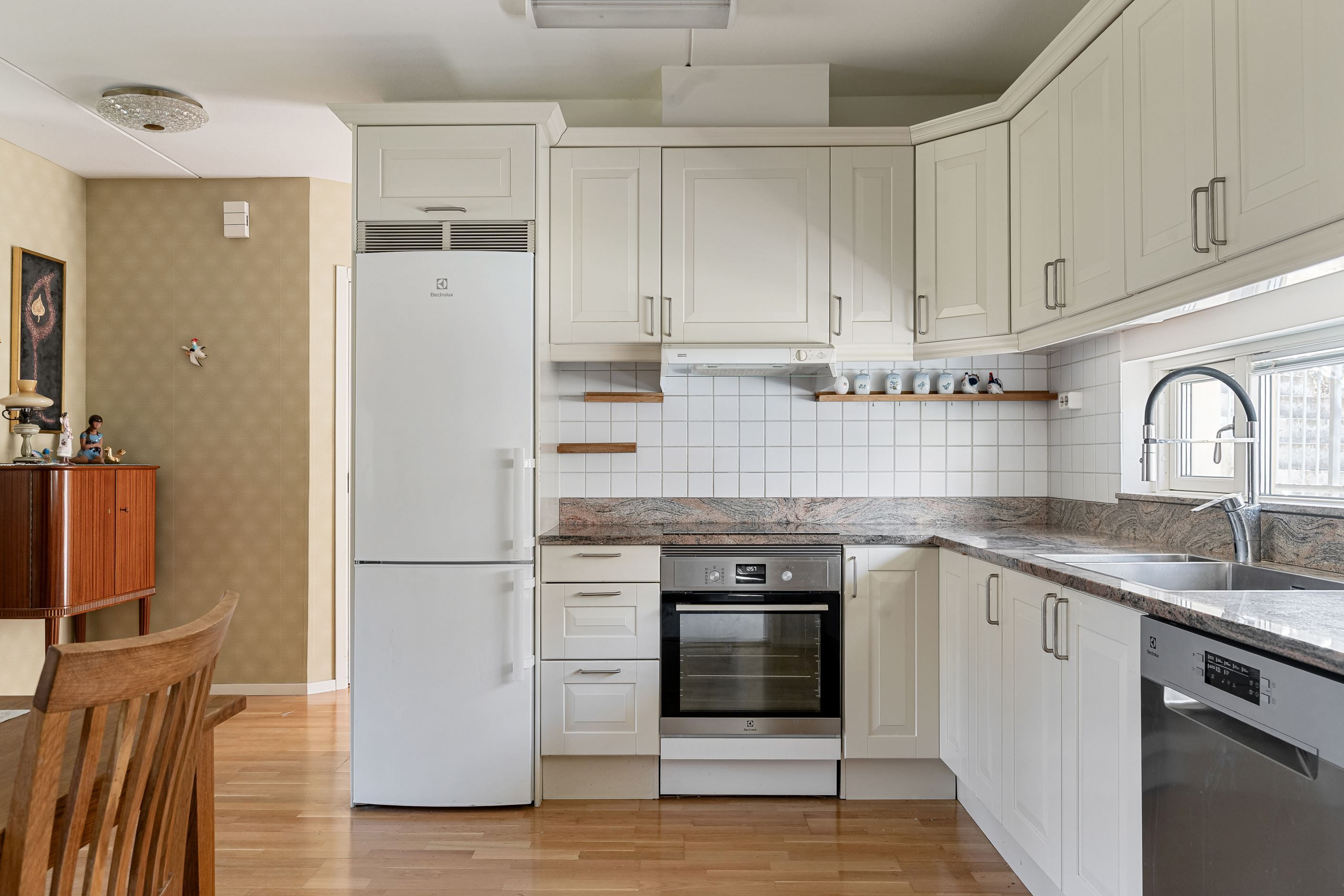 Entré till hall med klinkergolv och plats för avhängning. Kök och vardagsrum i trevlig öppen planlösning med plats för både matplats och soffgrupp. Köket har vita skåpsluckor, bänkskiva i sten, spis, fläkt, ugn, diskmaskin och kyl/frys. Härifrån nås balkongen. 2 rymliga sovrum, det ena med garderobsvägg. Helkaklat badrum med duschhörna, handfat med kommod, spegelskåp, wc, tvättmaskin, torktumlare samt bastu. Lägenheten har genomgående parkettgolv.