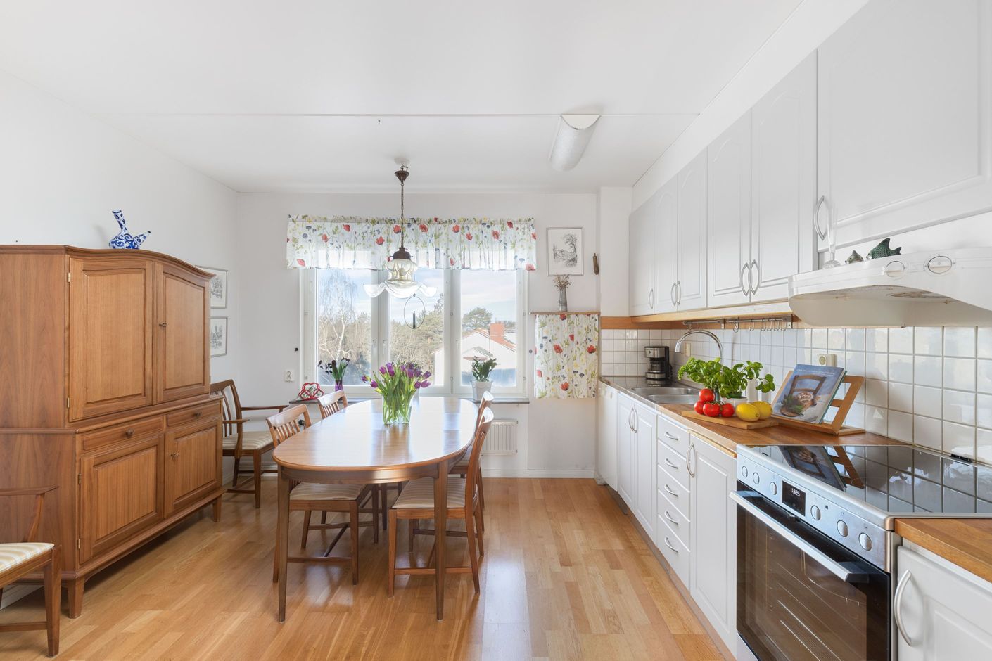 Bostaden erbjuder generösa och ljusa sällskapsytor där vardagsrummet blir hemmets naturliga samlingsplats. Den stämningsfulla kaminen skapar både värme och karaktär, och de stora fönsterpartierna ger ett fint ljusinsläpp som förstärker känslan av rymd. Balkongen blir en härlig förlängning av vardagsrummet under årets varmare månader – en perfekt plats för morgonkaffet eller en lugn stund i kvällssolen.