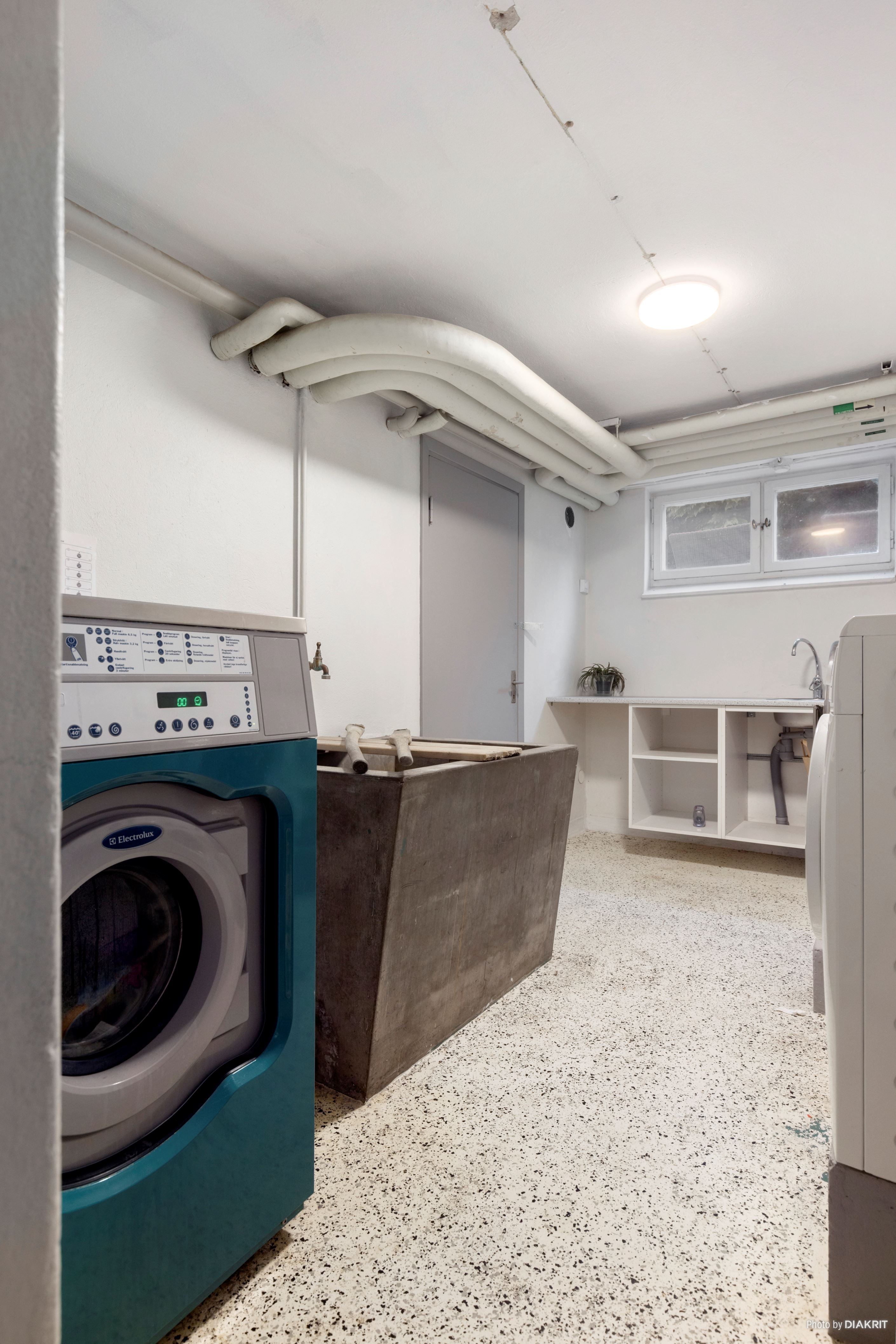 Byggnaden är uppförd i gedigen konstruktion med gjutet valv, vilket ger en robust och ljudisolerad miljö. I den rymliga källaren finns gott om förrådsmöjligheter för alla hyresgäster – ett stort plus för långsiktig trivsel.